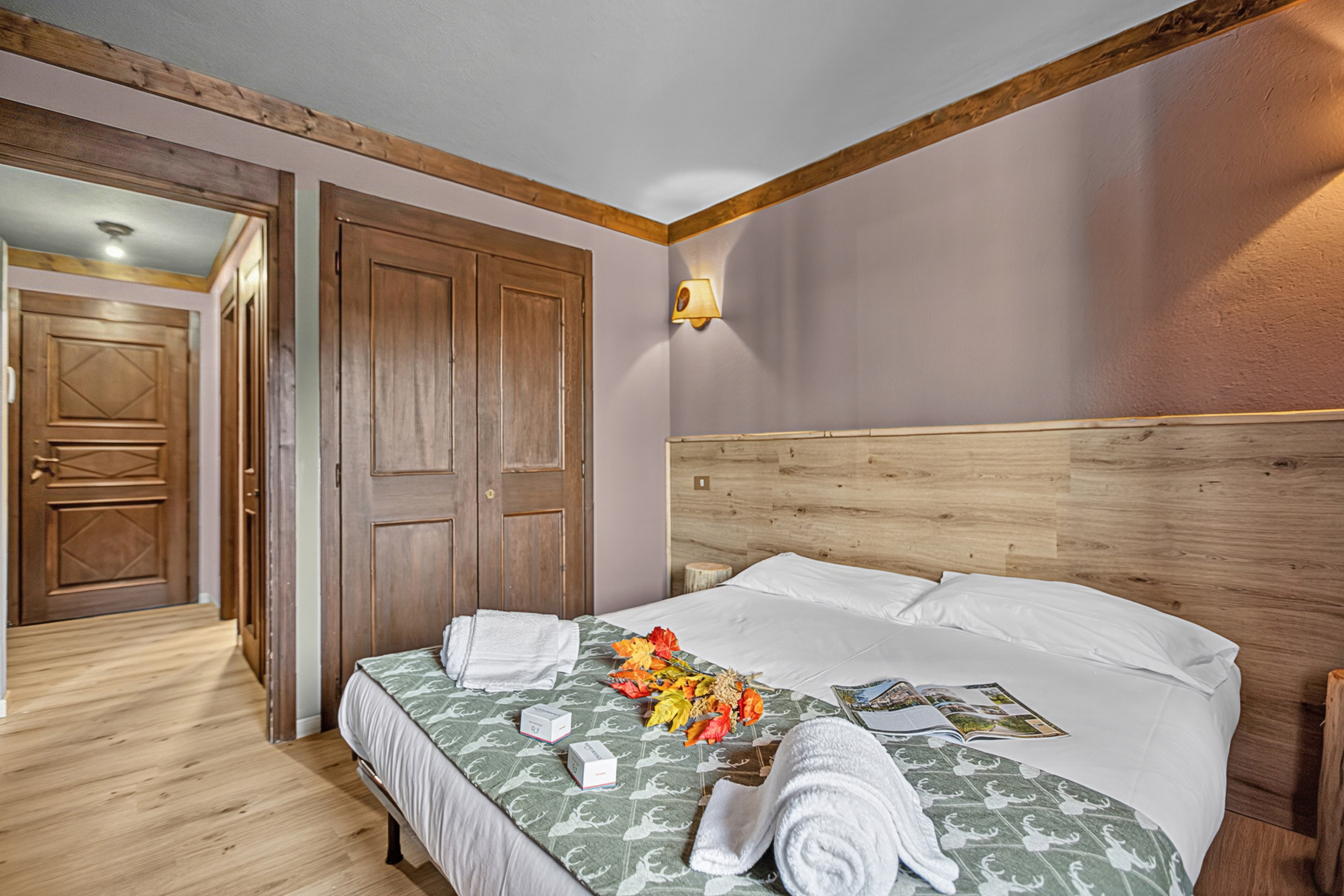 – De lichte slaapkamer heeft een tweepersoonsbed en een grote kledingkast.