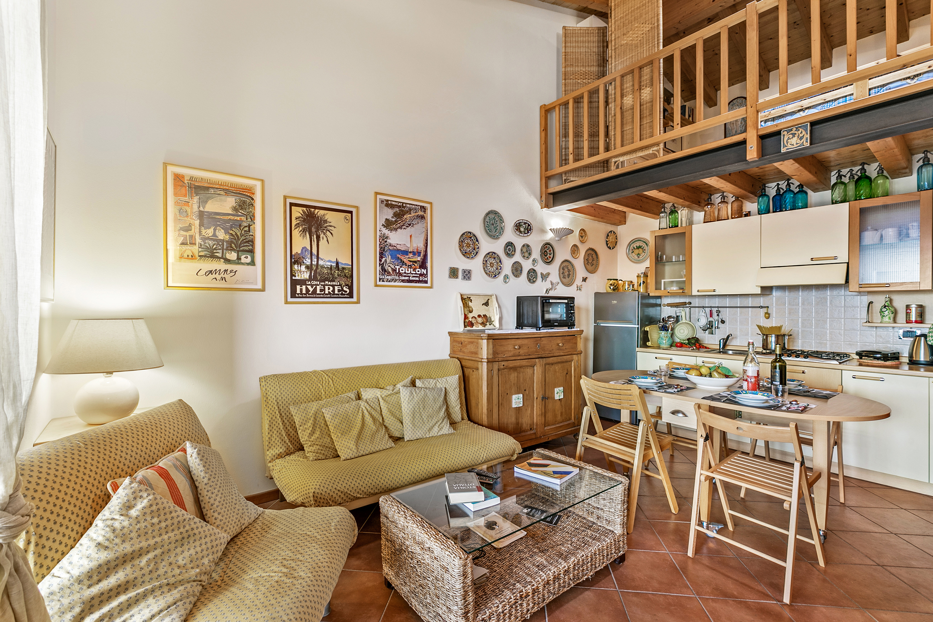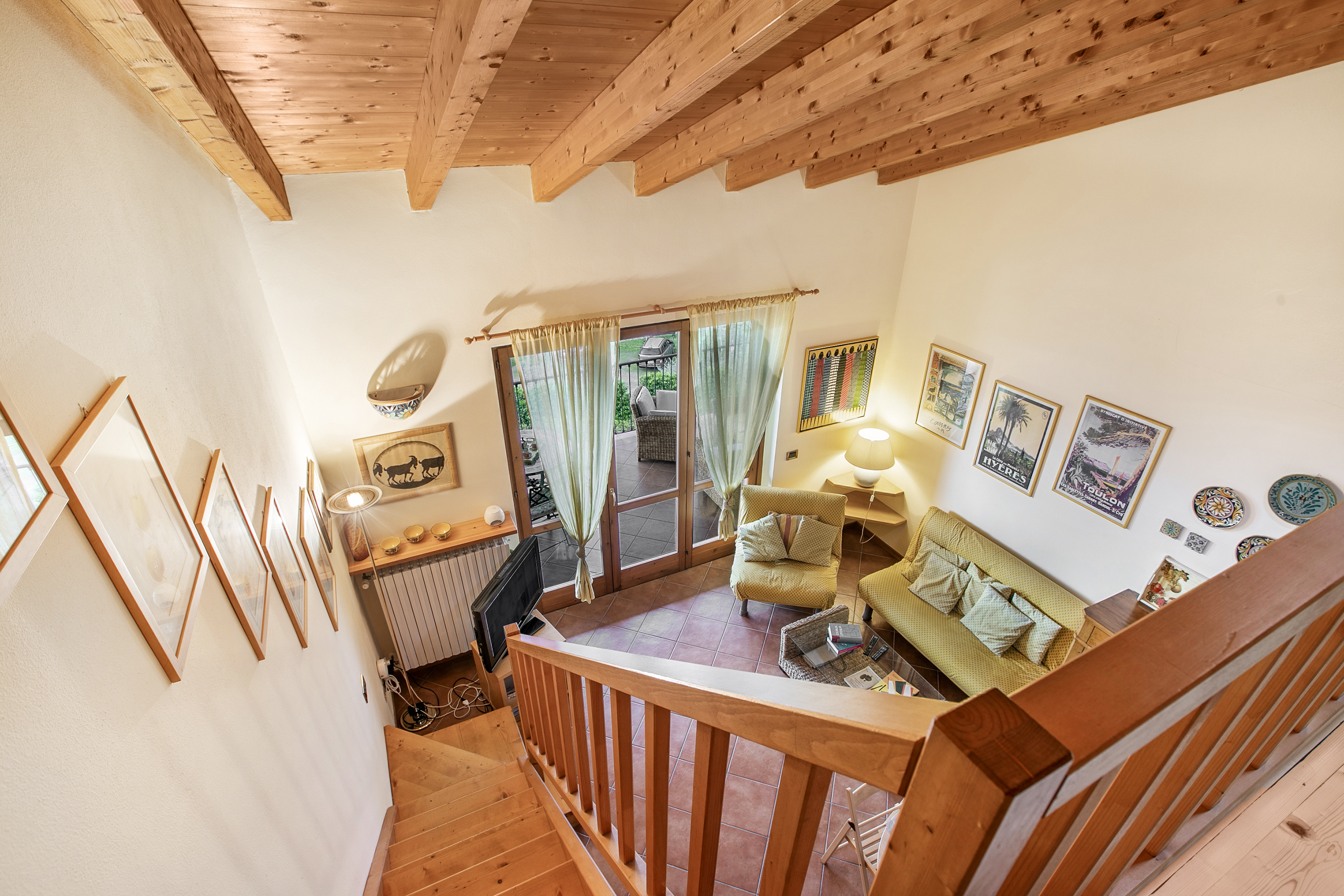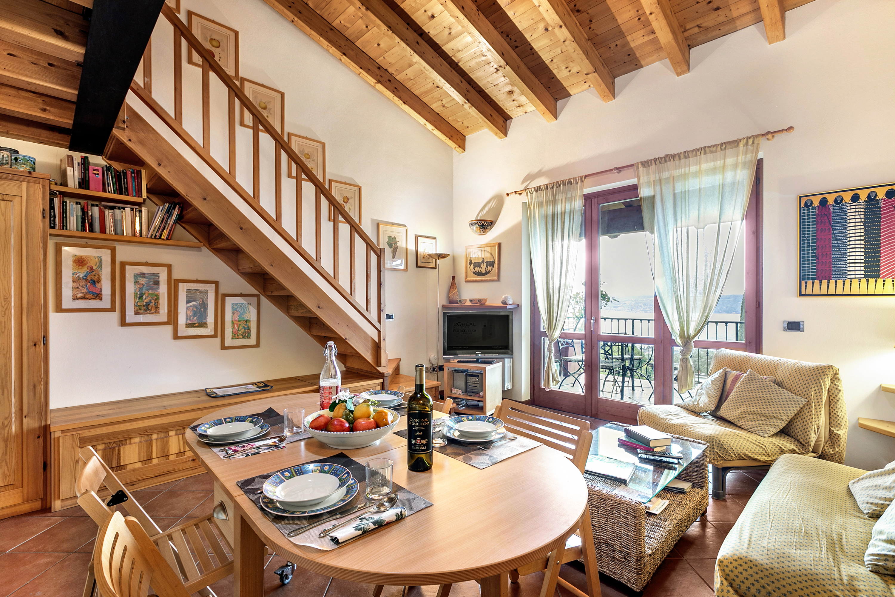 De zolder bevindt zich op de 2e verdieping en is vanuit de tuin toegankelijk via een externe trap. Het interieur voelt ruim en luchtig aan dankzij het dubbelhoge plafond en openslaande deuren naar een flink balkon. Het balkon is een verlengstuk van de woonruimte en fungeert als extra kamer. Het heeft een bank en fauteuils, plus een eettafel en stoelen voor ontspannen maaltijden in de buitenlucht, met een prachtig, ononderbroken uitzicht op het meer.