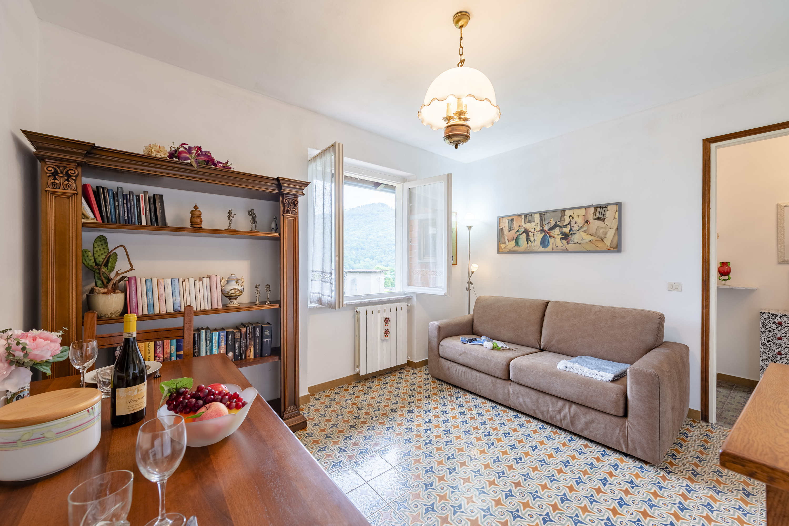 – Woonkamer met een comfortabele dubbele slaapbank en een boekenkast.