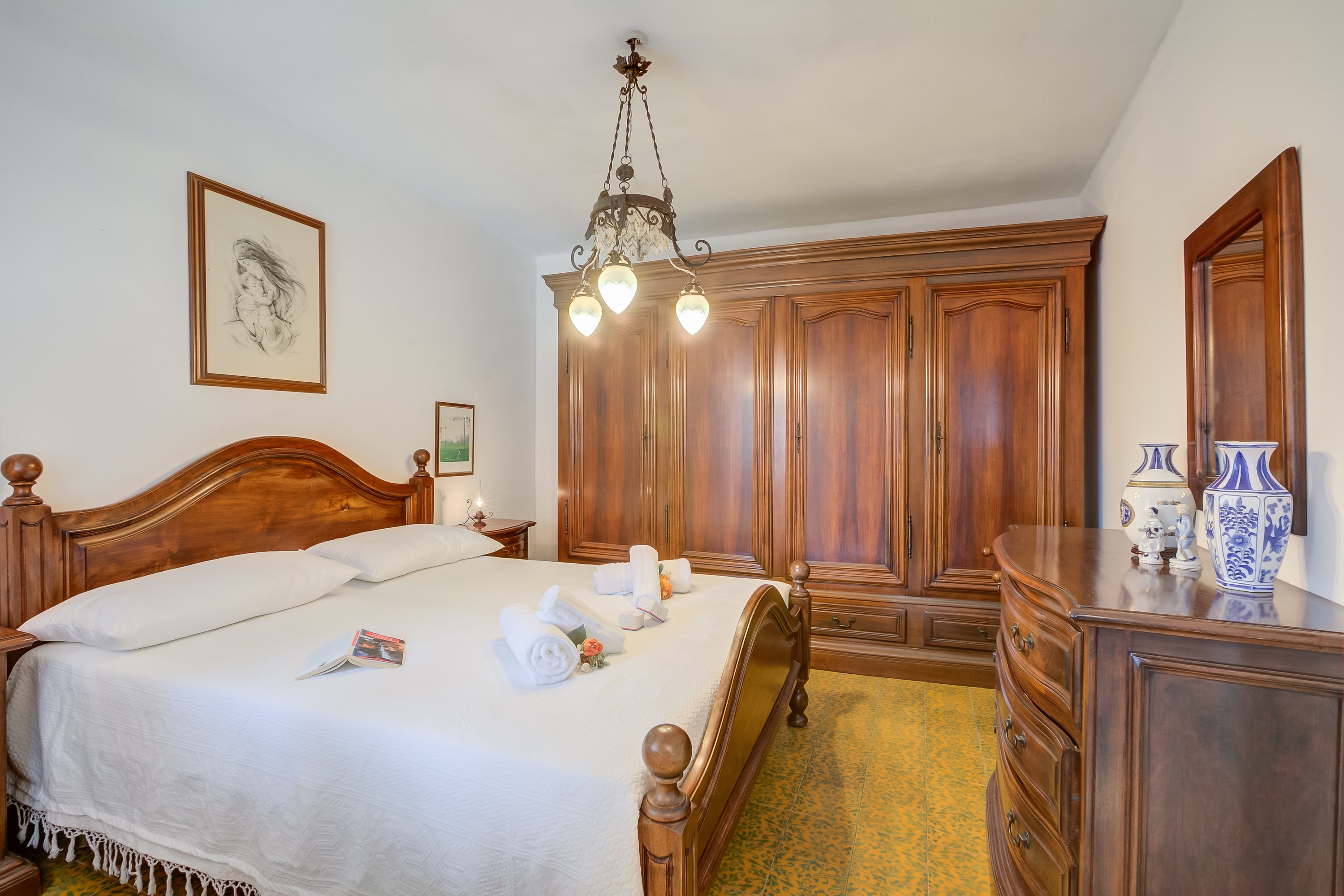 – Slaapkamer met een kingsize tweepersoonsbed, grote kledingkast, nachtkastjes en een ladekast.