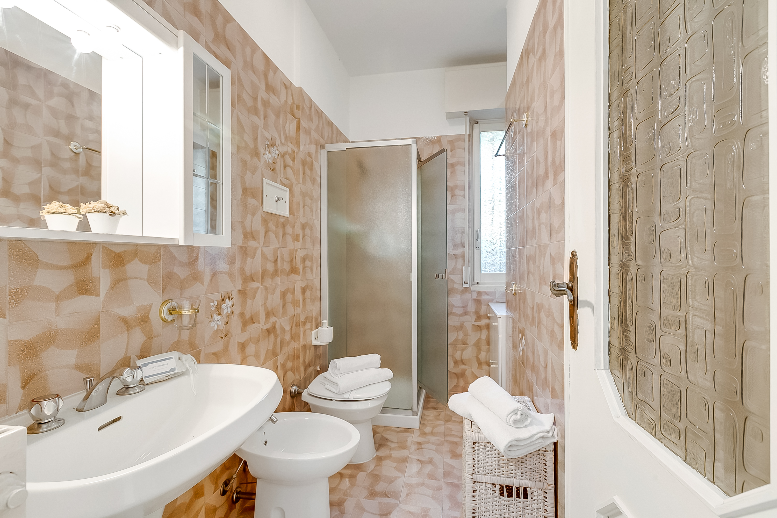 De betegelde badkamer is uitgerust met een douche, wastafel, bidet en toilet.
