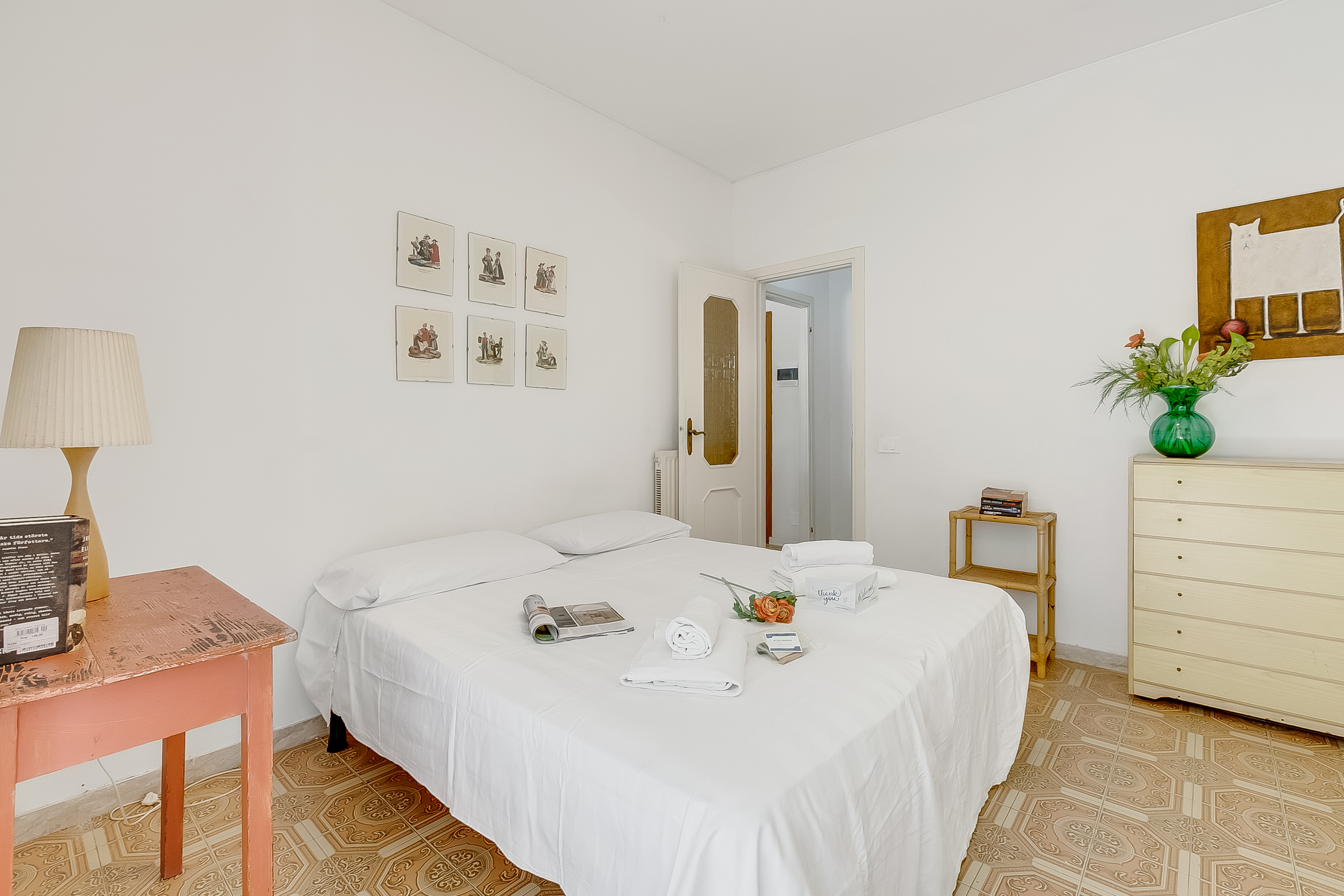 De lichte hoofdslaapkamer heeft openslaande deuren naar het terras en de tuin. Ze is ingericht met een tweepersoonsbed en een ruime kledingkast.
