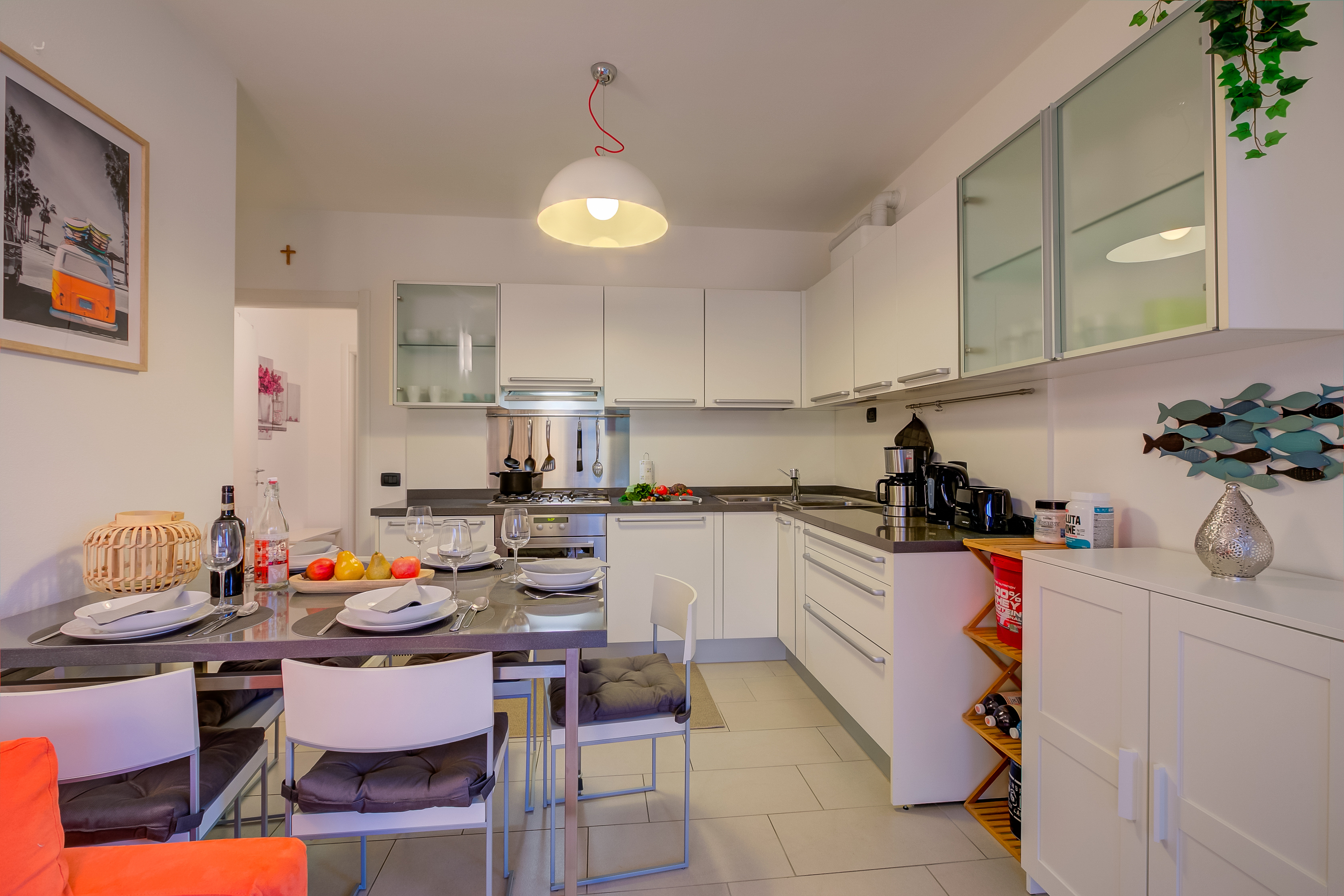 Dit uitnodigende appartement op de eerste verdieping beschikt over een open keuken met een eettafel en alle essentiële apparatuur, inclusief een vaatwasser, oven, koelkast, broodrooster en koffiezetapparaat, om een ontspannen en zorgeloos verblijf te garanderen.