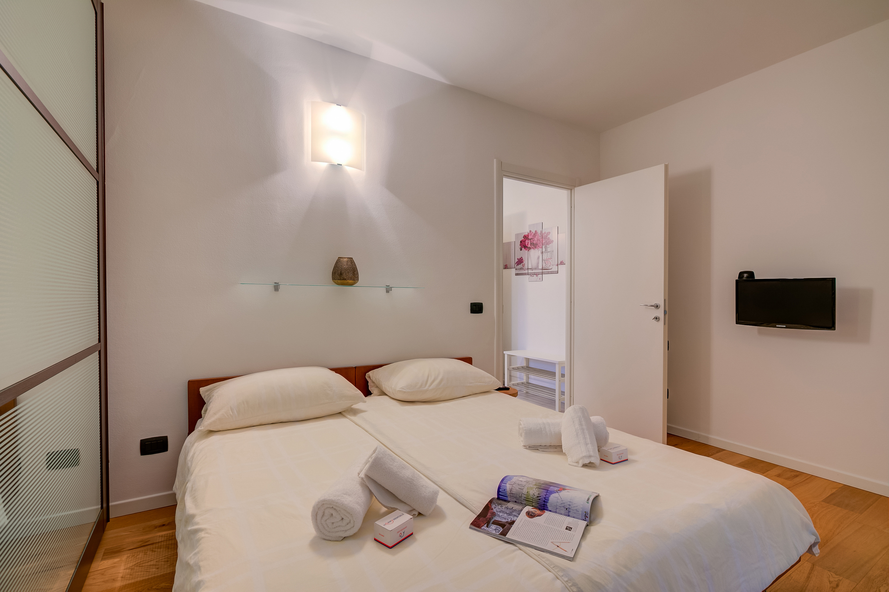 De slaapmogelijkheden omvatten een slaapkamer met balkon, ingericht met een kingsize tweepersoonsbed, een eenpersoonsslaapbank en een kledingkast, terwijl de woonkamer is uitgerust met een tweepersoonsslaapbank voor twee extra gasten. De badkamer is voorzien van een douche, toilet en bidet voor extra comfort.
