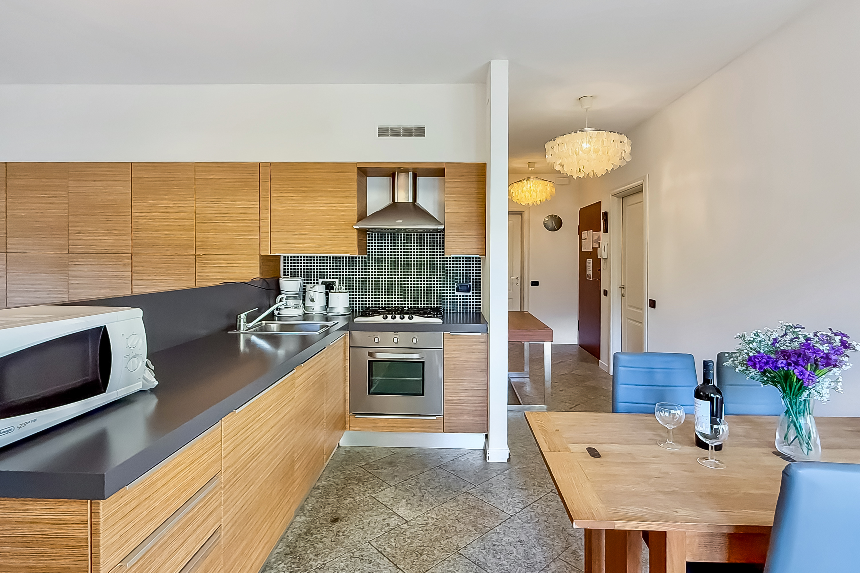 Dit moderne appartement op de begane grond beschikt over een nieuw geïnstalleerde keuken langs één muur, met een flatscreen-tv in de woonkamer voor entertainment. De hoogwaardige meubels dragen bij aan de stijlvolle en comfortabele sfeer van het appartement.