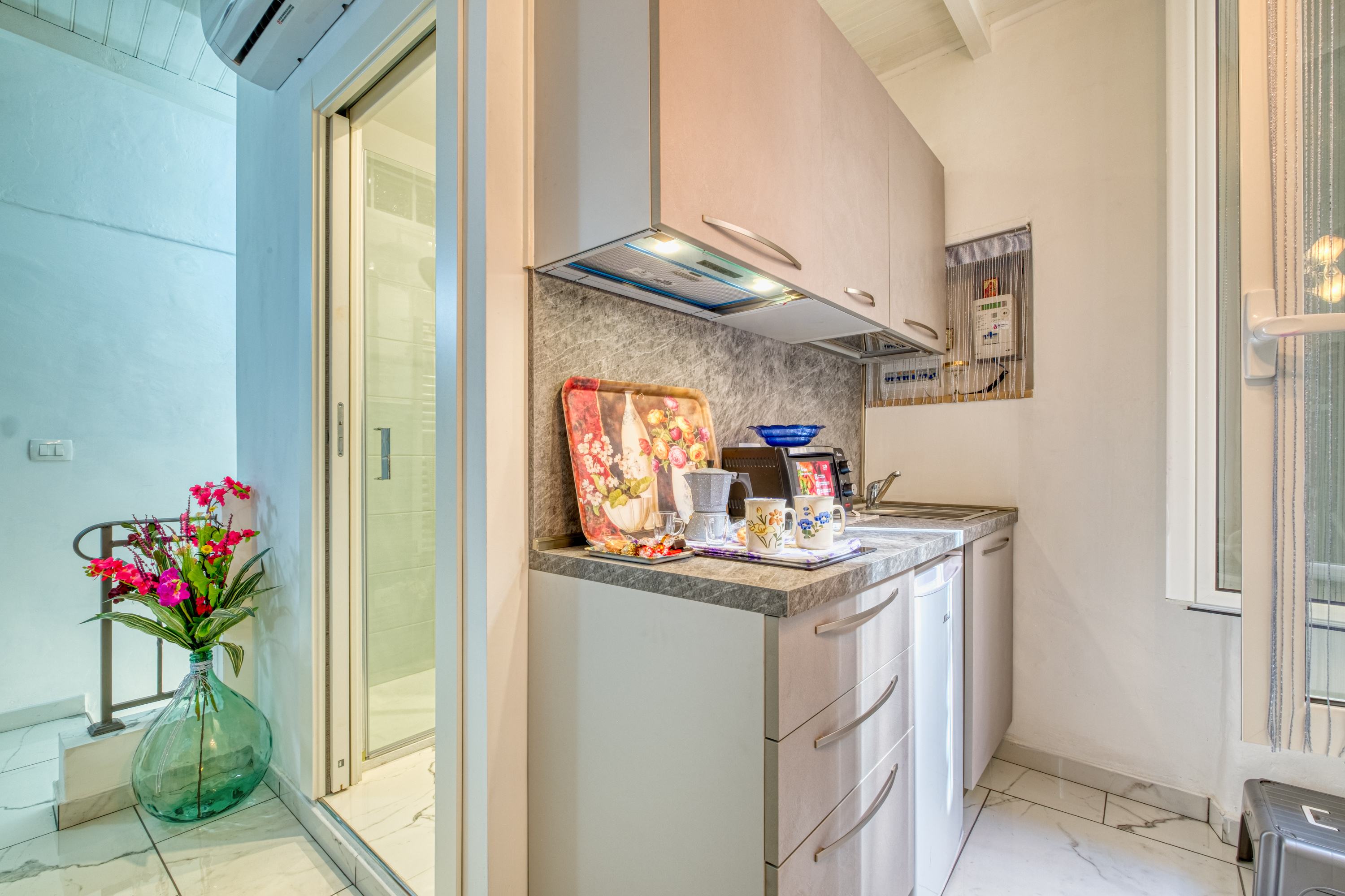 Het interieur is zorgvuldig ontworpen met interne jaloezieën om het slaapgedeelte af te scheiden. De woonkamer beschikt over een tweepersoonsbed en biedt een lichte, open leefruimte met een flatscreen-tv, een eettafel en een compacte keuken. De keuken is uitgerust met een Moka-koffiezetapparaat, een inductiekookplaat, een magnetron en een koelkast. De badkamer is voorzien van een douche, een bidet, een wastafel en een wc.