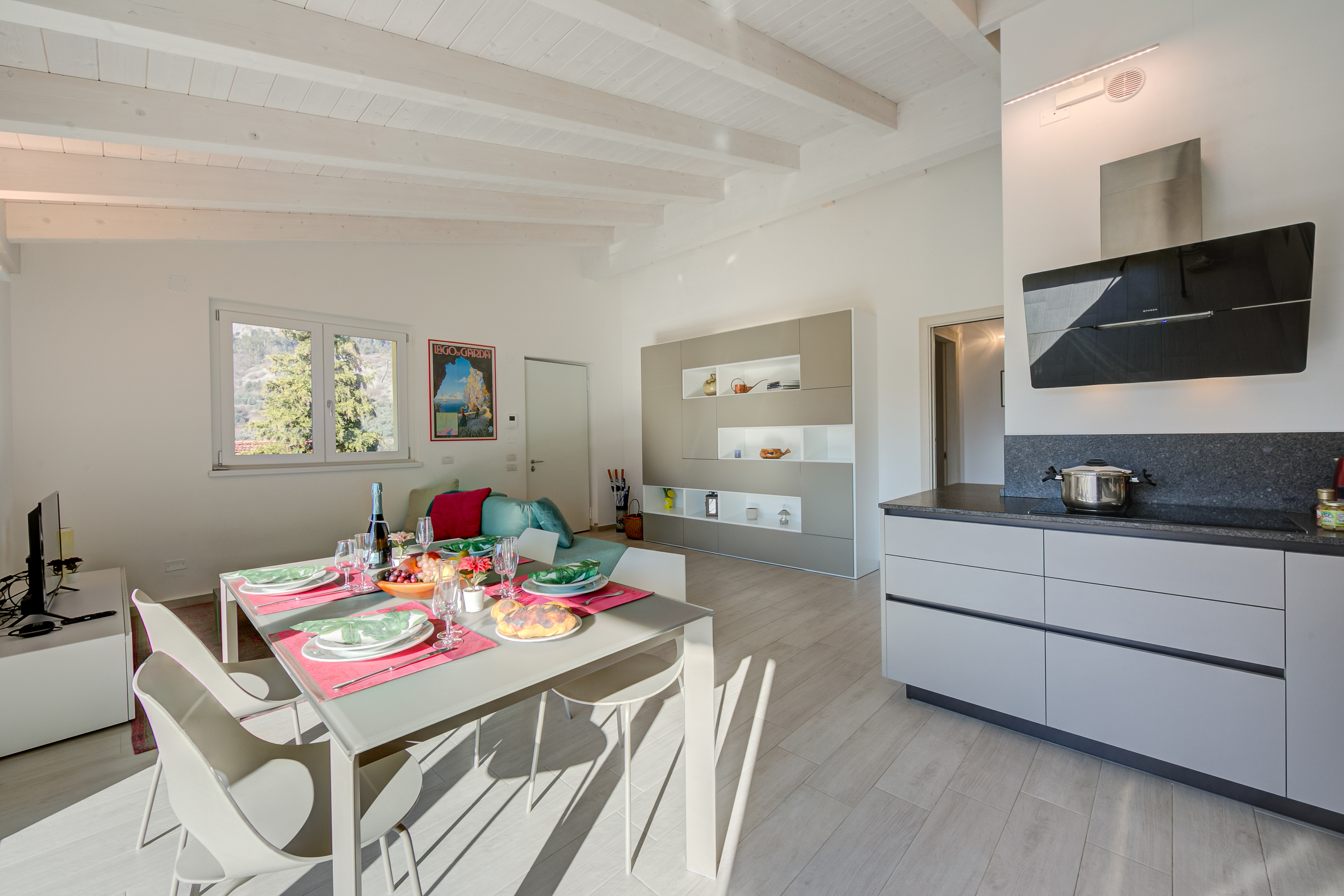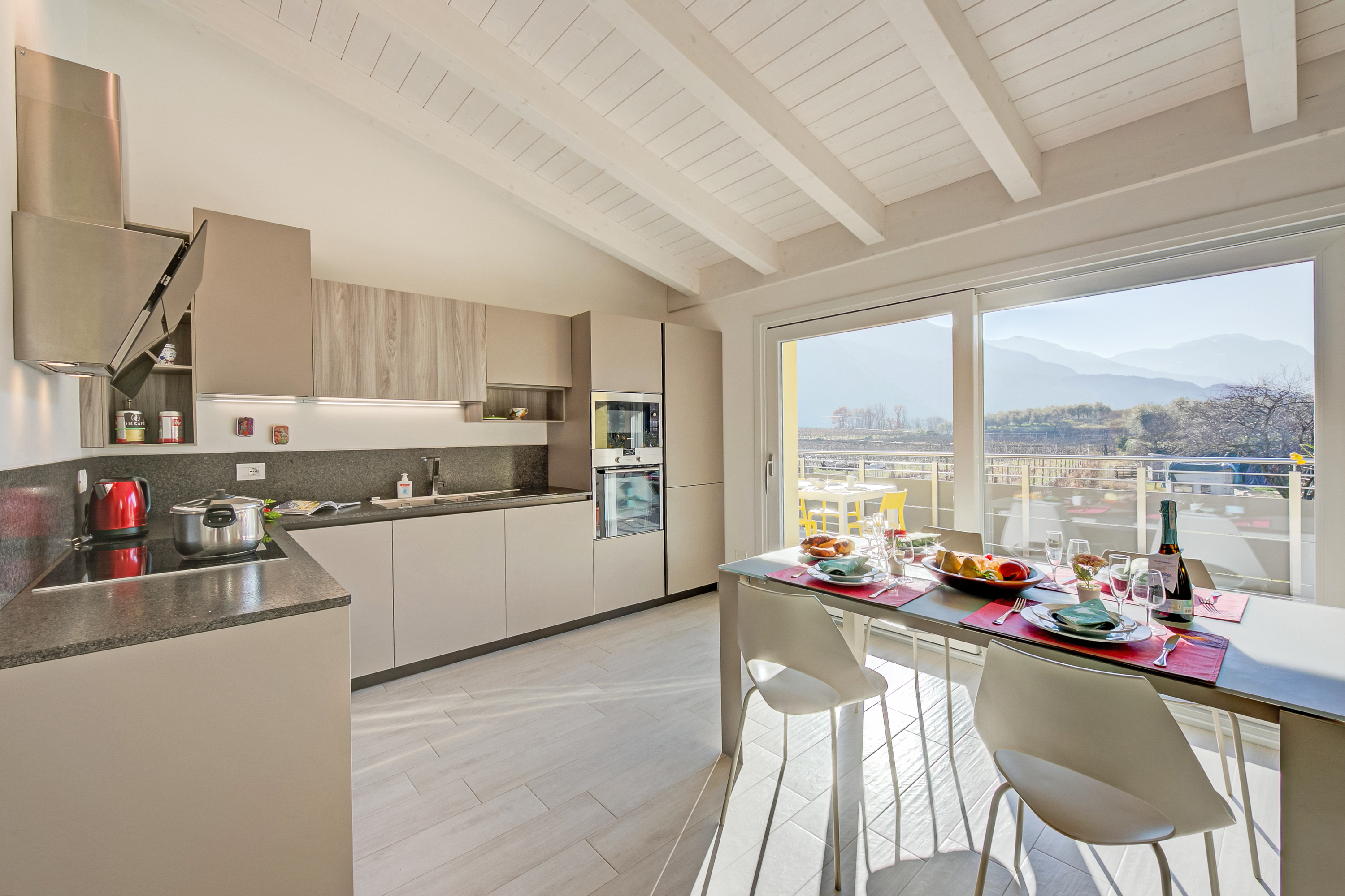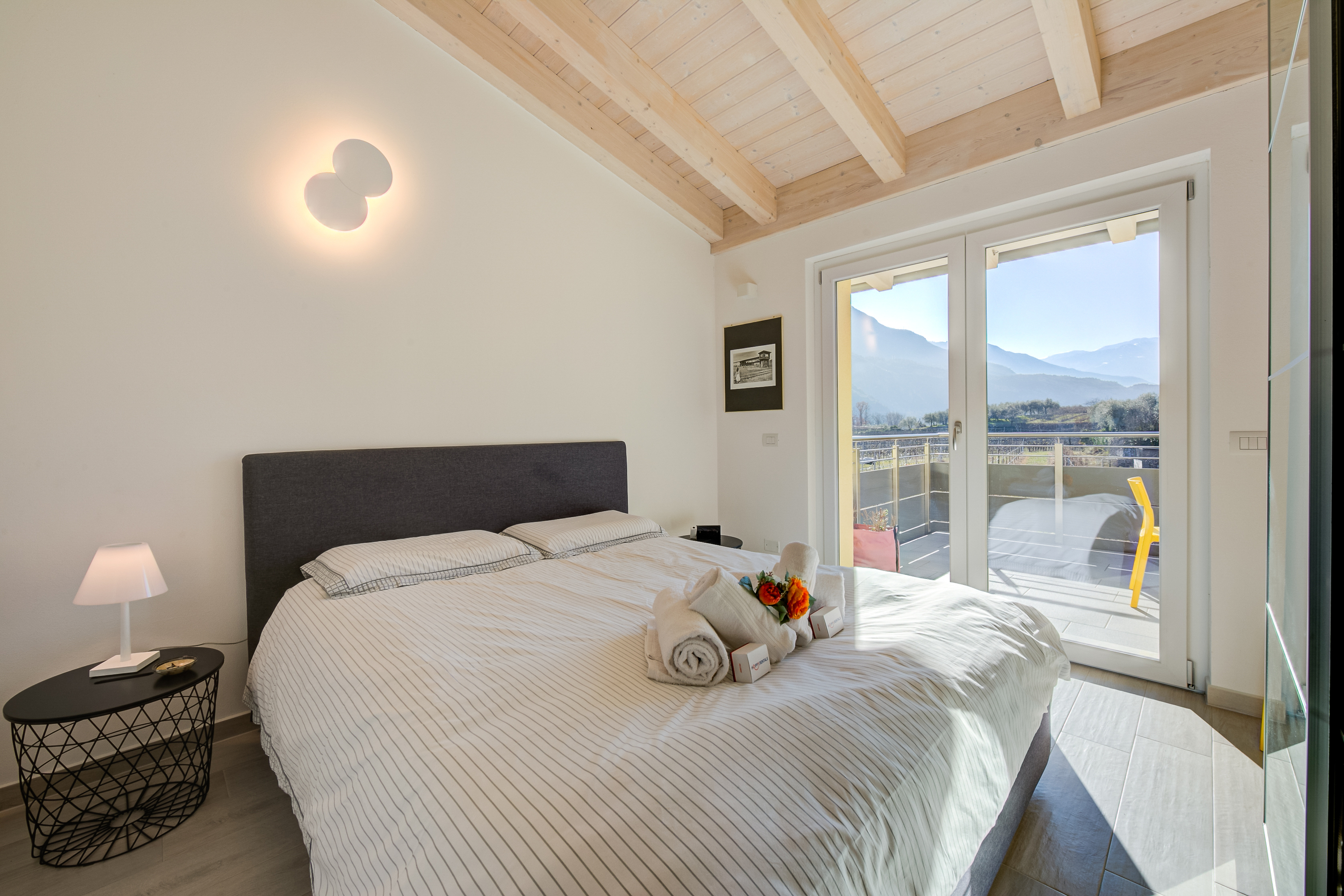Het gloednieuwe appartement bevindt zich op de eerste verdieping en biedt uitzicht op de bergen en het landschap. Het beschikt over 3 slaapkamers, 2 badkamers en een volledig uitgeruste keuken met moderne apparatuur. De lichte woonkamer heeft een eigentijds design met een eethoek. Voorzieningen zijn onder andere vloerverwarming, een vaatwasser en een wasmachine.