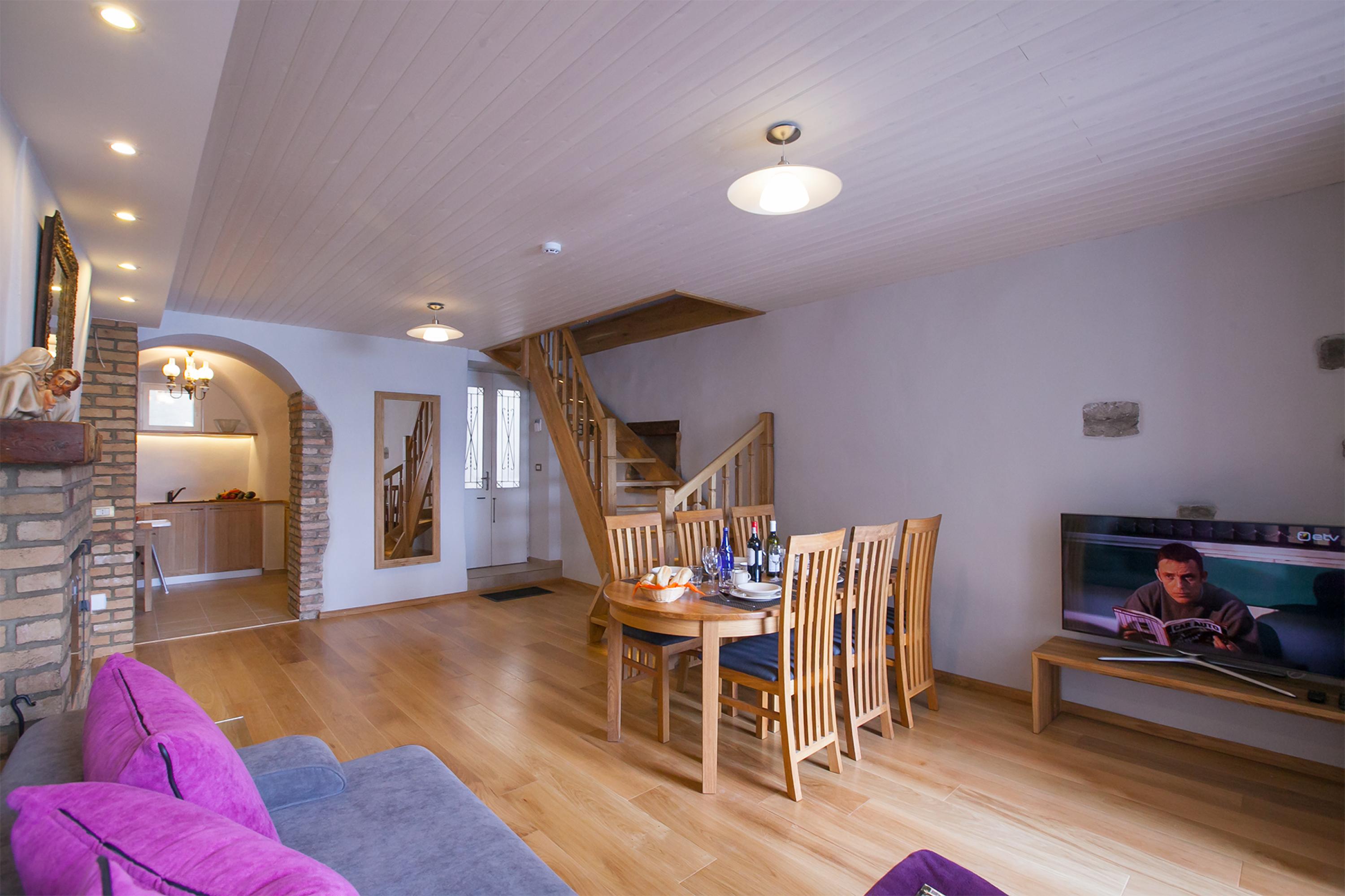 Gasten worden verwelkomd in een lichte en gezellige woonkamer bij binnenkomst van dit prachtige stadshuis. Met uitzicht op het meer vanaf de moderne bank en eethoek kunnen de gasten genieten van alle gemakken van thuis, inclusief tv en gratis wifi-toegang. Het retraite is perfect voor het hele jaar door genieten met een intieme open haard. De woonkamer en eetkamer leiden naar een keuken met kookplaat, oven, magnetron, broodrooster, koffiezetapparaat en vaatwasser, en een ontbijttafel voor twee.