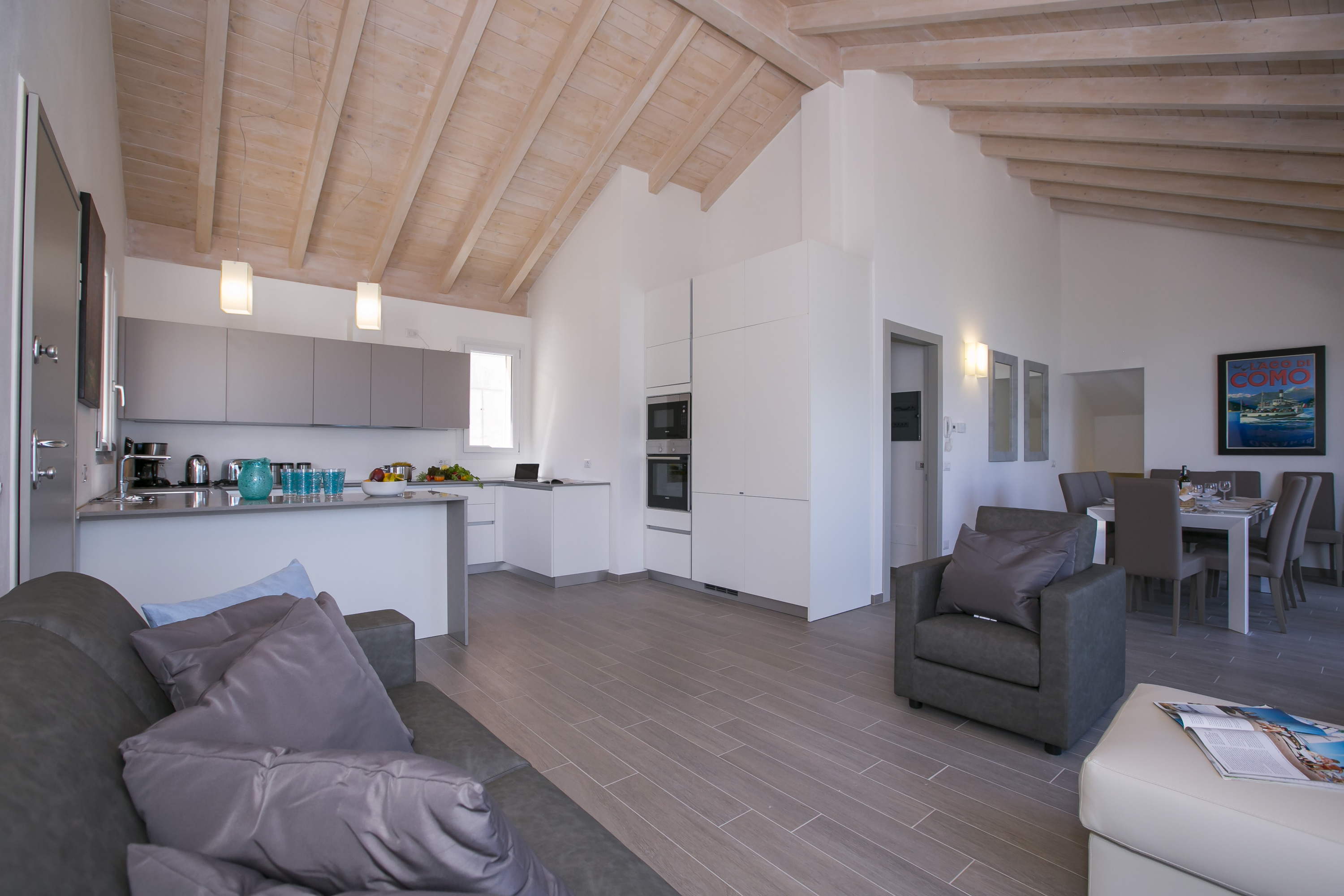 Bij het betreden van de luxe penthouse, nodigt de open woon- en keukenruimte onmiddellijk uit tot ontspanning en sociale bijeenkomsten het hele jaar door. Het witgewassen houten plafond en het rustgevende palet van crème en zachte grijstinten creëren een moderne, vredige sfeer, perfect om te ontspannen op de comfortabele bank en stoelen. Voor extra comfort zorgen gratis WiFi en een muurbeugeltelevisie met flatscreen, wat het "thuis"-gevoel versterkt. Het open ontwerp verbindt naadloos met de buitenruimte en biedt een vloeiende overgang voor zorgeloze barbecues in de buitenlucht en ontspannen momenten in de zon met een verfrissend drankje en een goed vakantieboek.