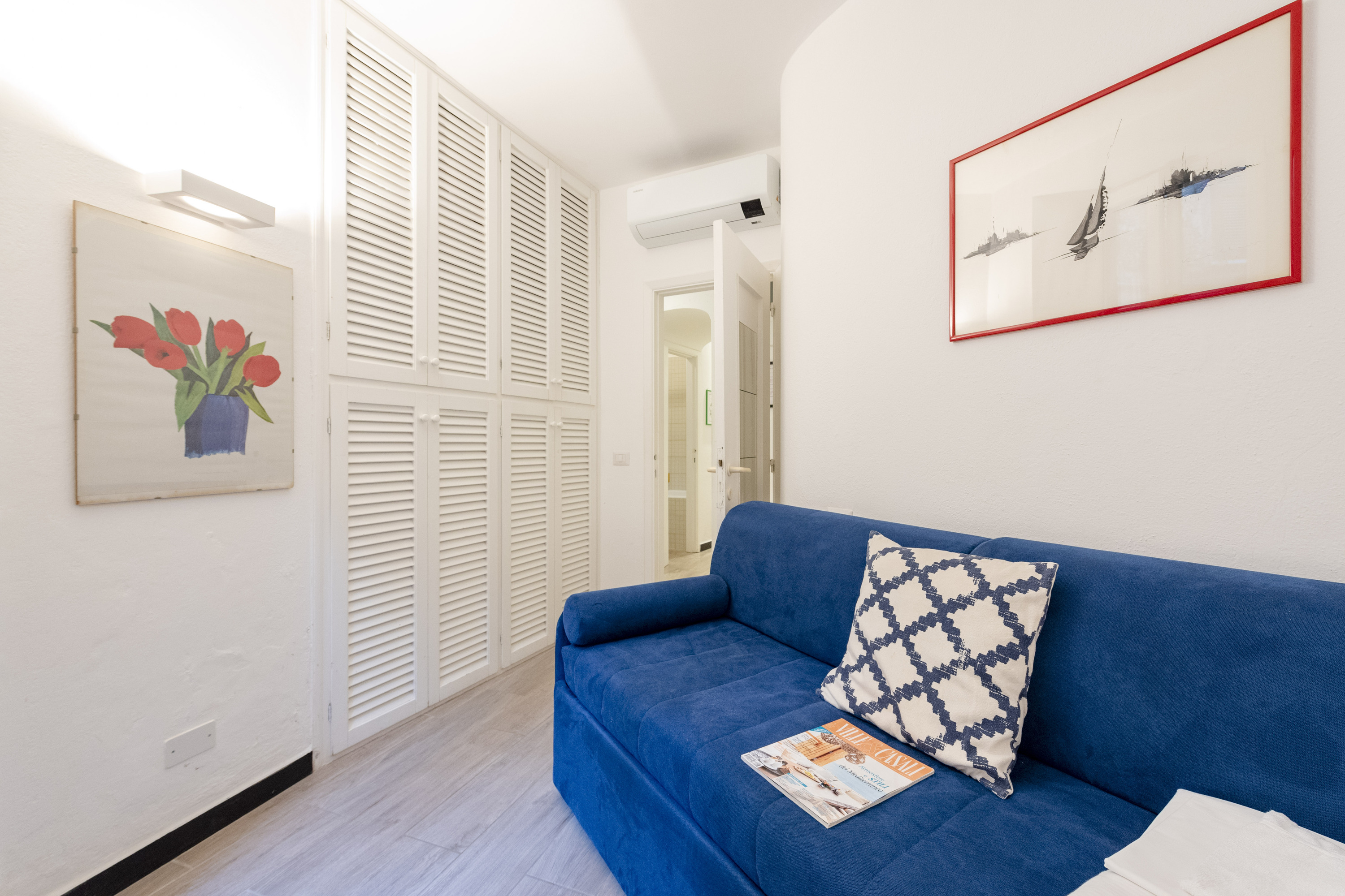 De lichte en luchtige leefruimte heeft een groot raam met uitzicht op de Piazzetta en is ingericht met een comfortabele slaapbank, twee fauteuils en een smart flatscreen-tv. Dit gebied omvat ook de moderne woonkeuken die is uitgerust met; een inductiekookplaat, een oven, een magnetron, een koffiezetapparaat, een vaatwasser, een koel-/vriescombinatie en een grote eettafel. Gasten kunnen ook buiten dineren in de mooie binnentuin van het pand, de ideale plek om af te koelen met een paar drankjes aan het einde van een drukke dag.
