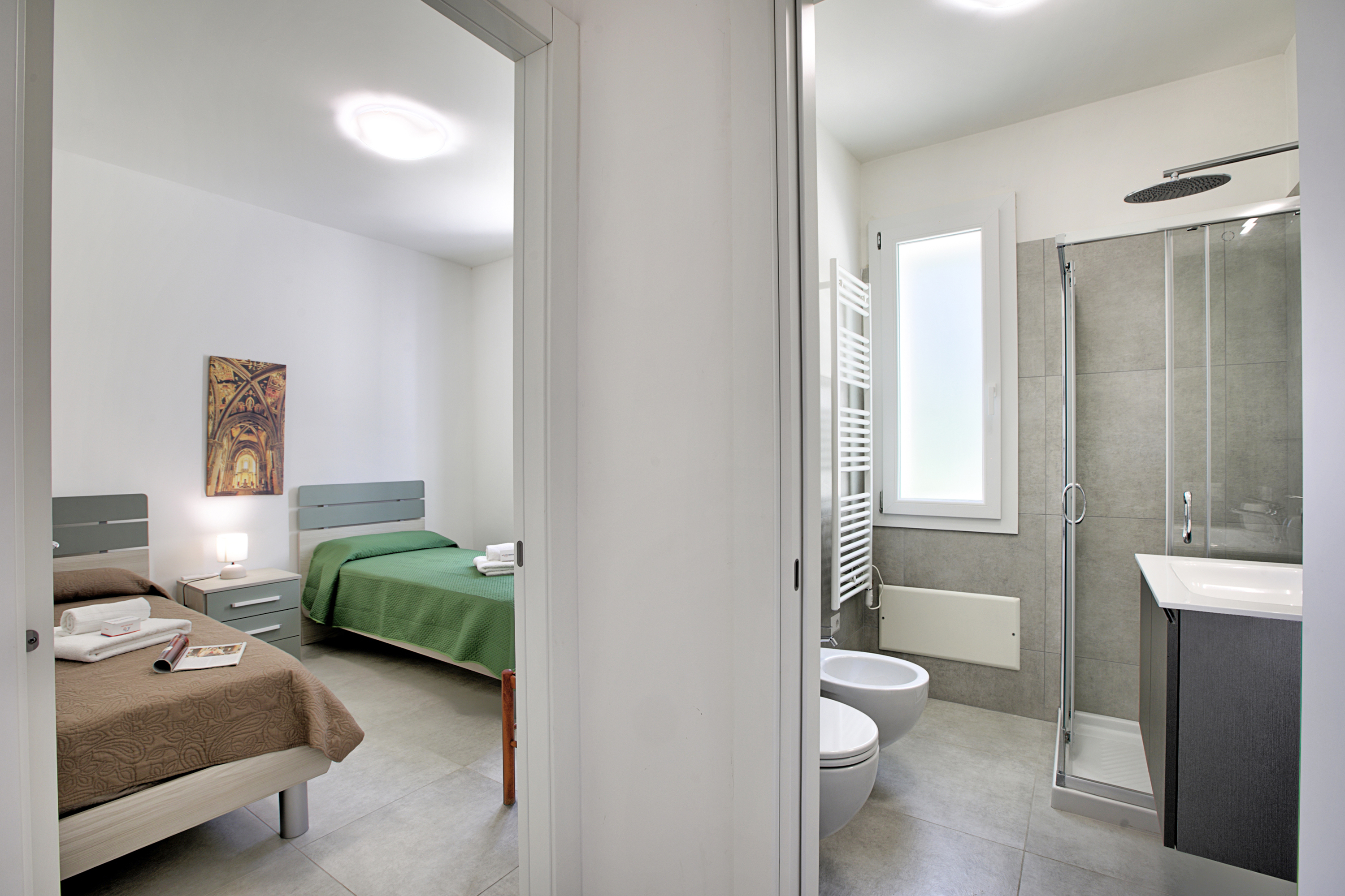 De aparte badkamer is voorzien van een glazen douche, wastafel, bidet en toilet.