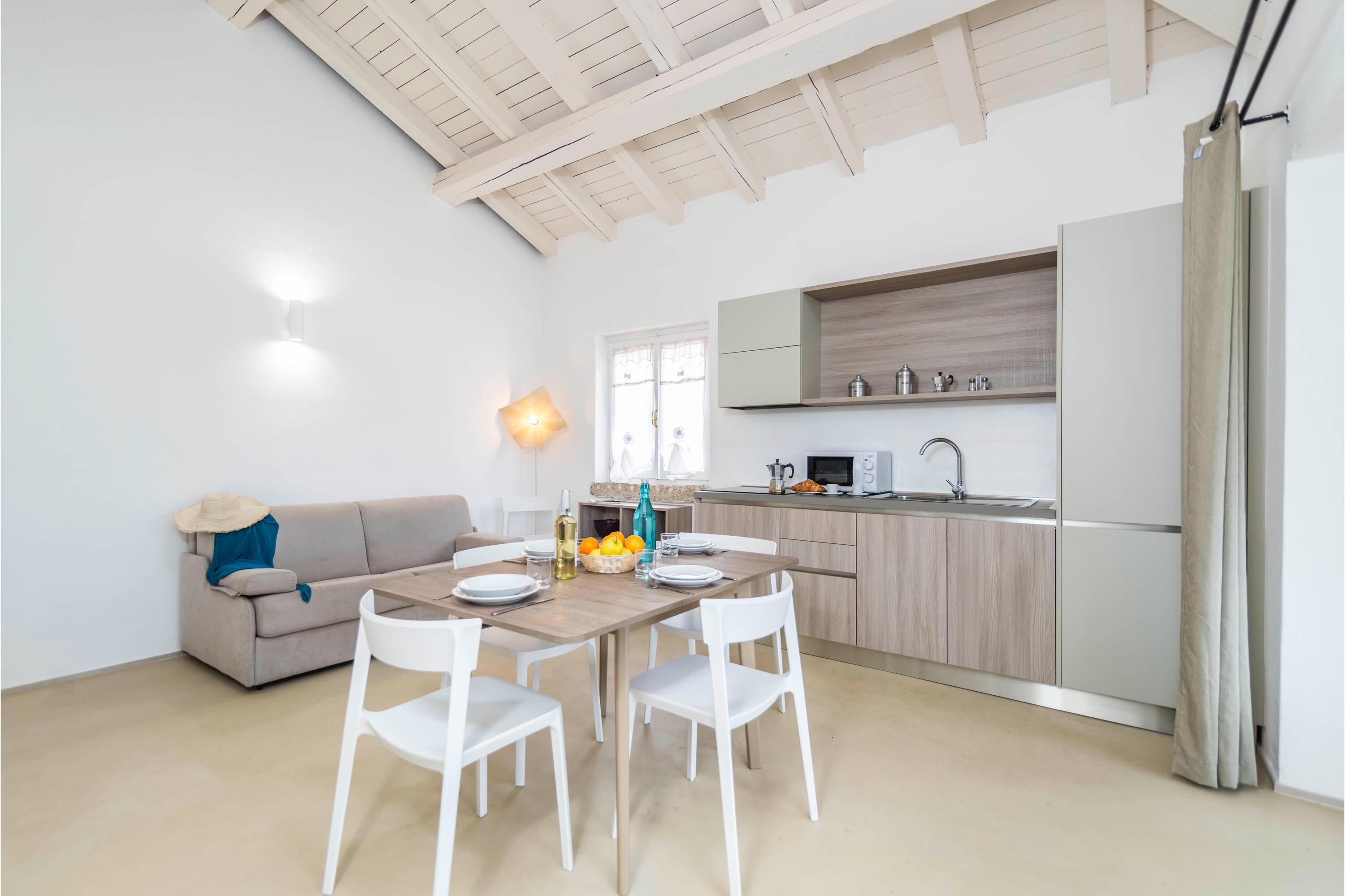 Het appartement heeft een lichte en luchtige sfeer, met hoge plafonds en een royale open woonruimte. Glazen schuifdeuren openen naar een rustiek, schaduwrijk balkon, ingericht met een eettafel voor zes personen – ideaal om buiten te eten. Binnen heeft de woonkamer een comfortabele bank, een flatscreen-tv, een extra eettafel en een moderne keuken.