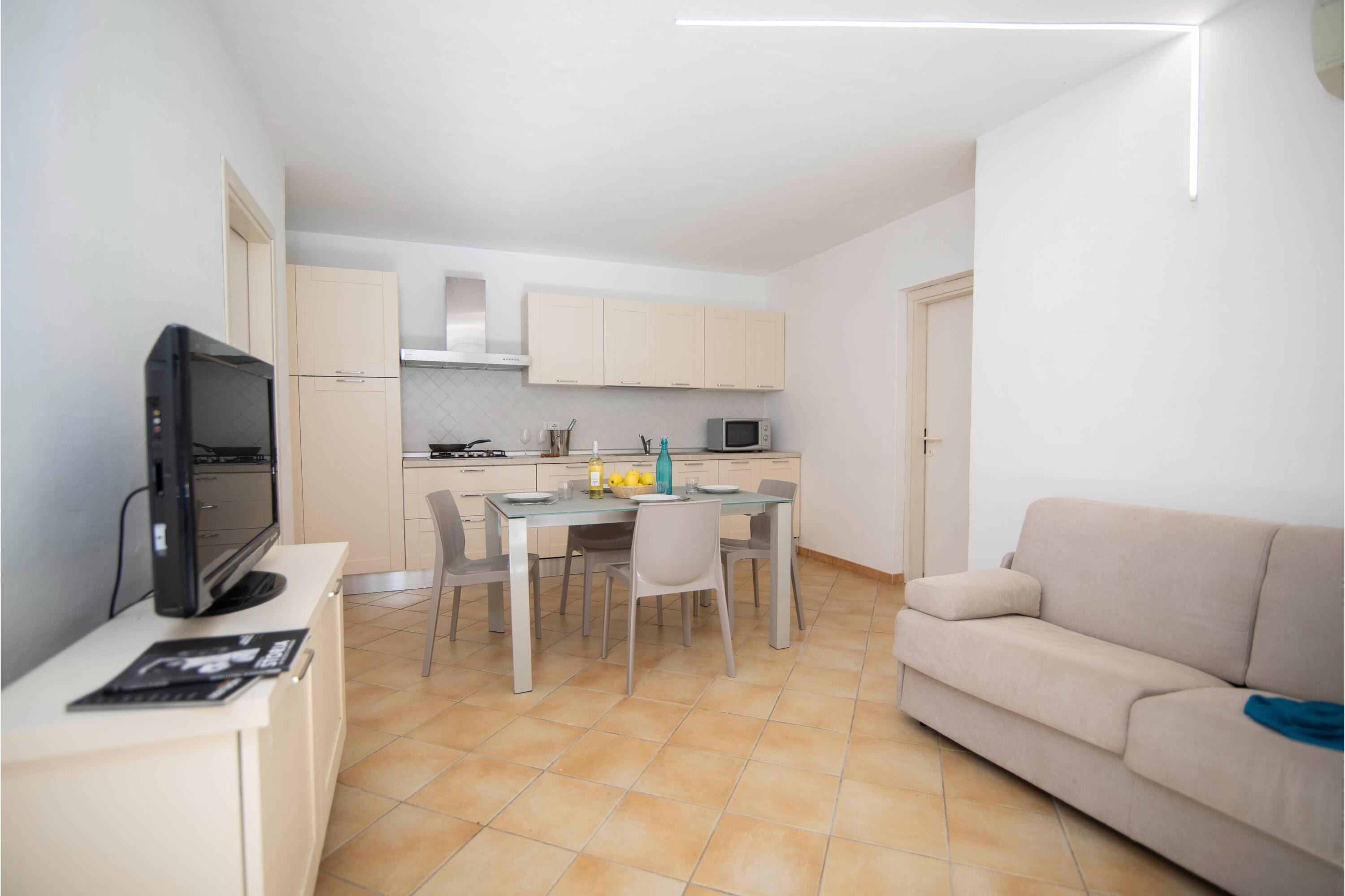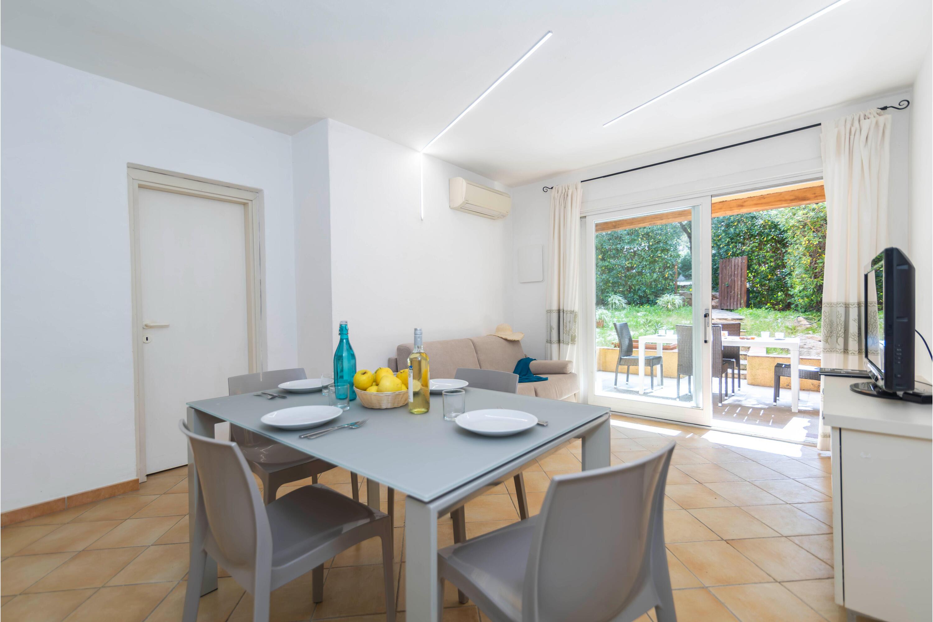 Het appartement heeft een ruime open woonkamer, compleet met glazen schuifdeuren die uitkomen op een mooi, schaduwrijk terras. Gasten kunnen buiten dineren dankzij de eettafel voor 6 personen. Binnen, in de woonkamer, vinden gasten een bank, een flatscreen-tv, een andere eettafel en een moderne, uitgeruste keuken. De keuken is uitgerust met een kookplaat, een oven, een magnetron, een vaatwasser, een koffiezetapparaat en een koelkast/vriezer.