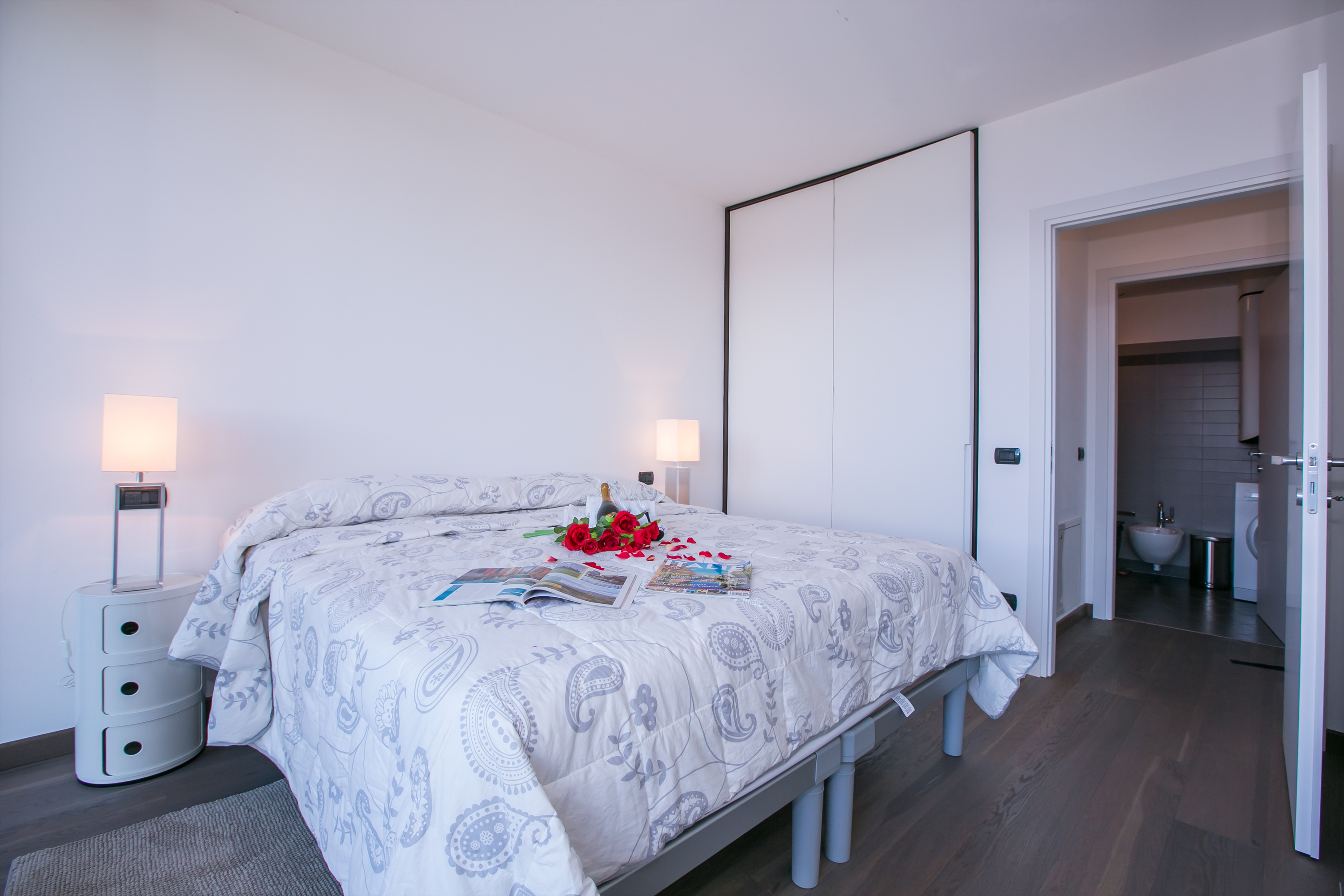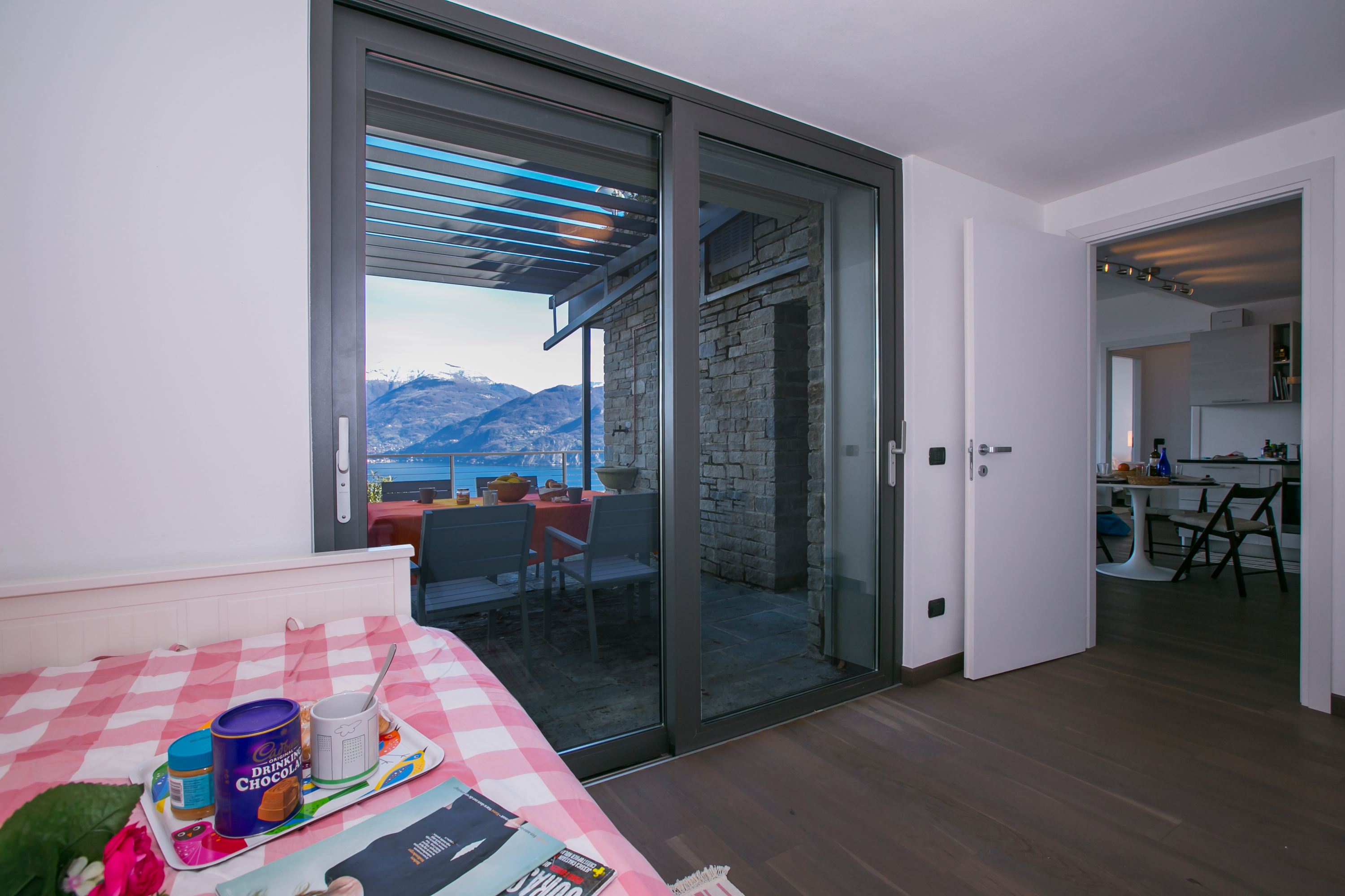 - Hoofdslaapkamer – Een tweepersoonskamer met uitzicht op het meer en toegang tot het terras. Bevat een modern tweepersoonsbed, nachtkastjes, een ingebouwde kast en een panoramisch raam van vloer tot plafond met deuren naar buiten.