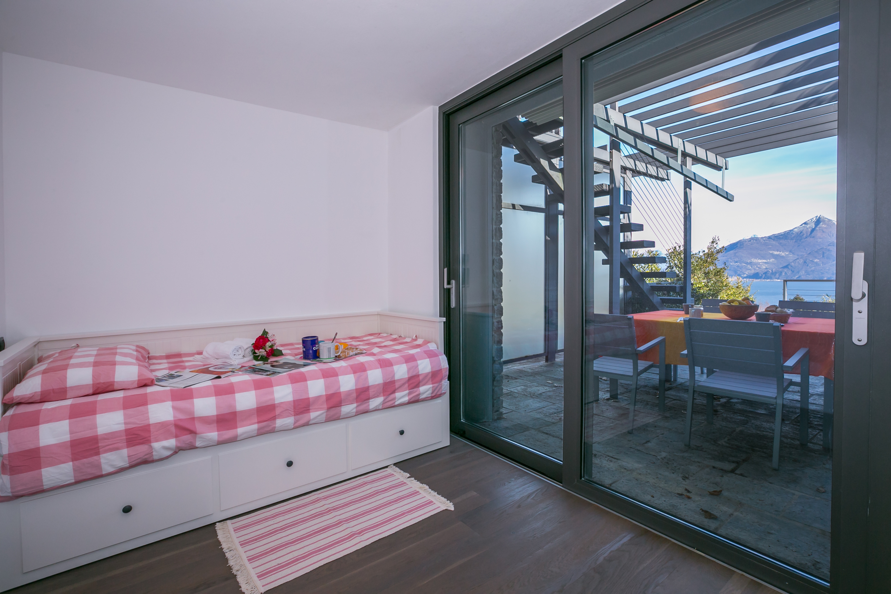 - Slaapkamer 2 – Kamer met uitzicht op het meer, een panoramisch raam en toegang tot het terras. Heeft een comfortabel eenpersoonsbed met een uitschuifbare optie voor 1-2 gasten.