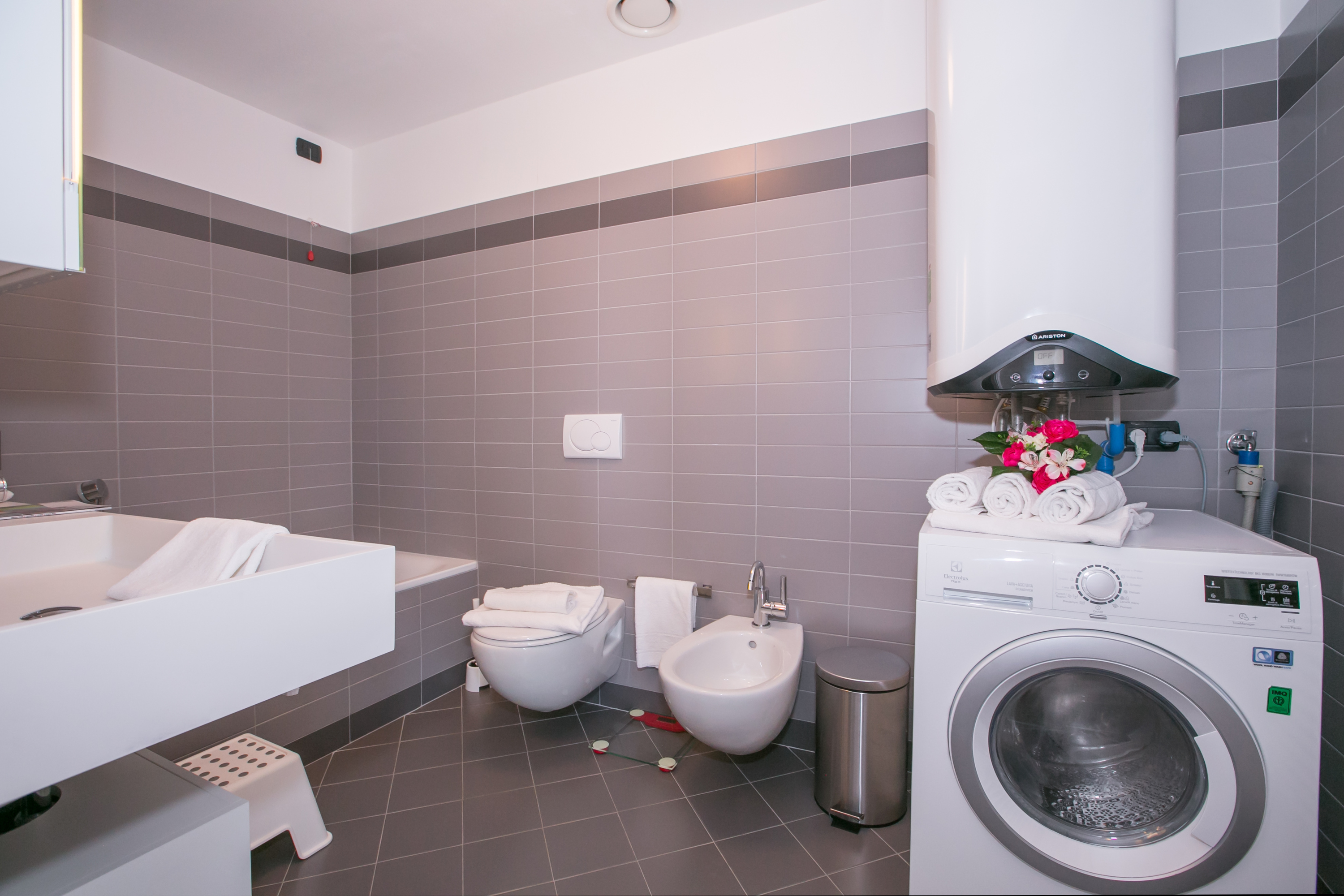 - Een moderne badkamer met een bad, douchekraan, wastafel, wc en bidet. Bevat een wasmachine en een haardroger voor extra gemak.