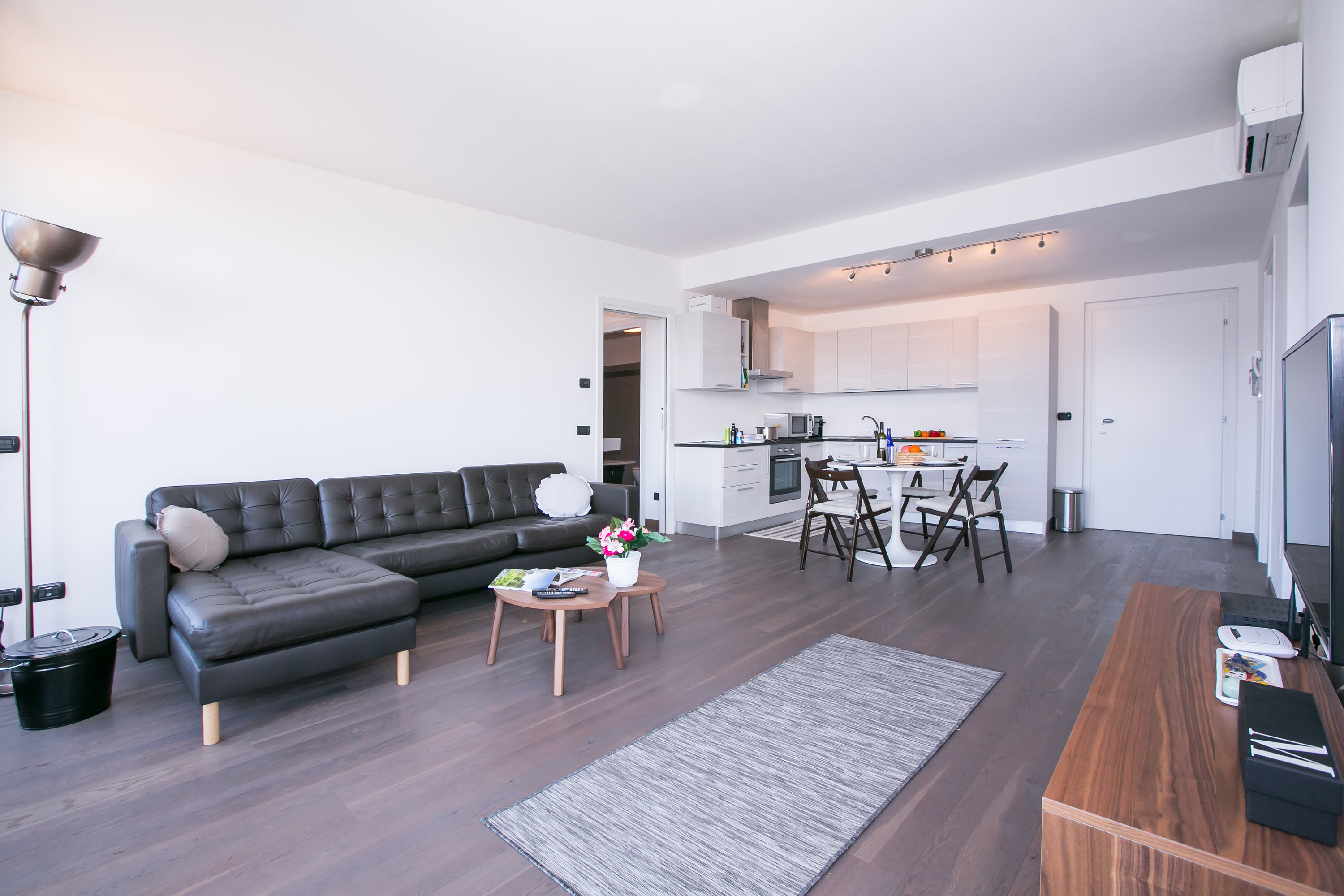 - Een lichte, stijlvolle woonkamer met toegang tot het terras, die een uitnodigende sfeer creëert voor ontspannen samenzijn en gemakkelijk entertainment.