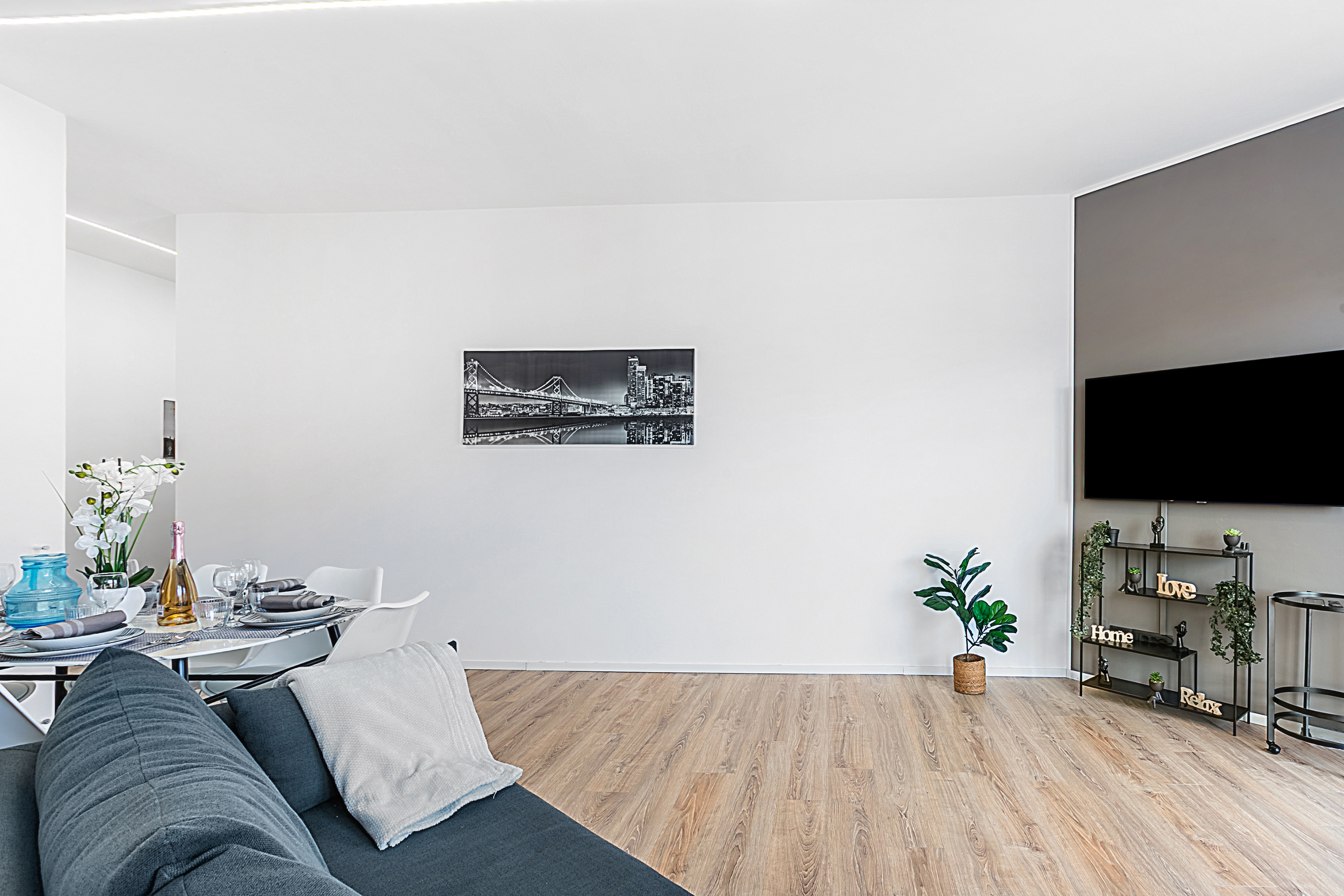 Binnen vindt u een moderne open woonkamer die is ingericht met een comfortabel slaapbank, een eettafel en een slimme flatscreen-tv. Deze ruimte leidt naar de keuken, die is uitgerust met een koffiemachine, een inductiekookplaat, een oven, een magnetron, een vaatwasser en een koel-vriescombinatie.