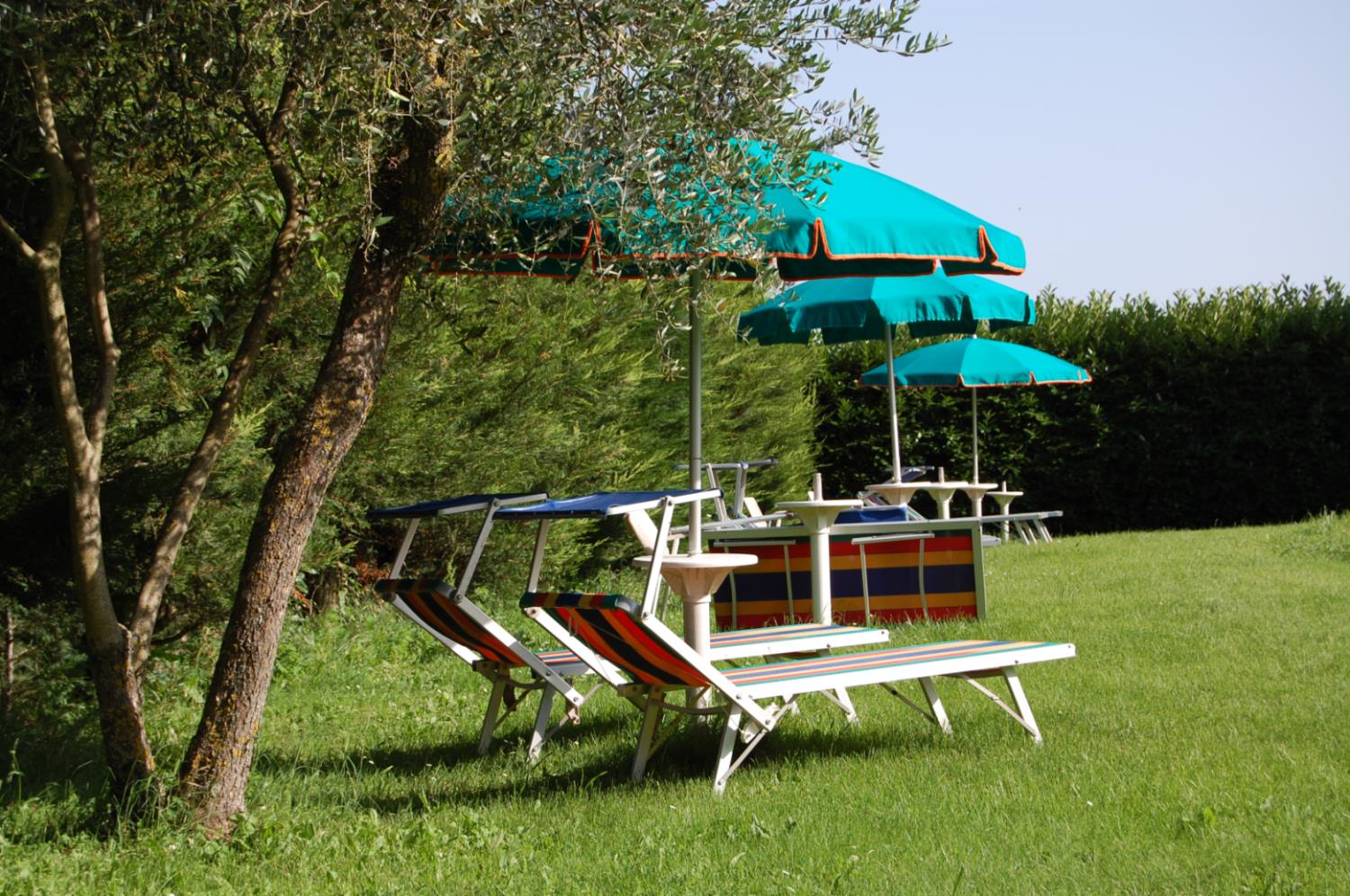 Op het brede terras staan voor ieder appartement twee ligbedden, één ligstoel en een parasol.