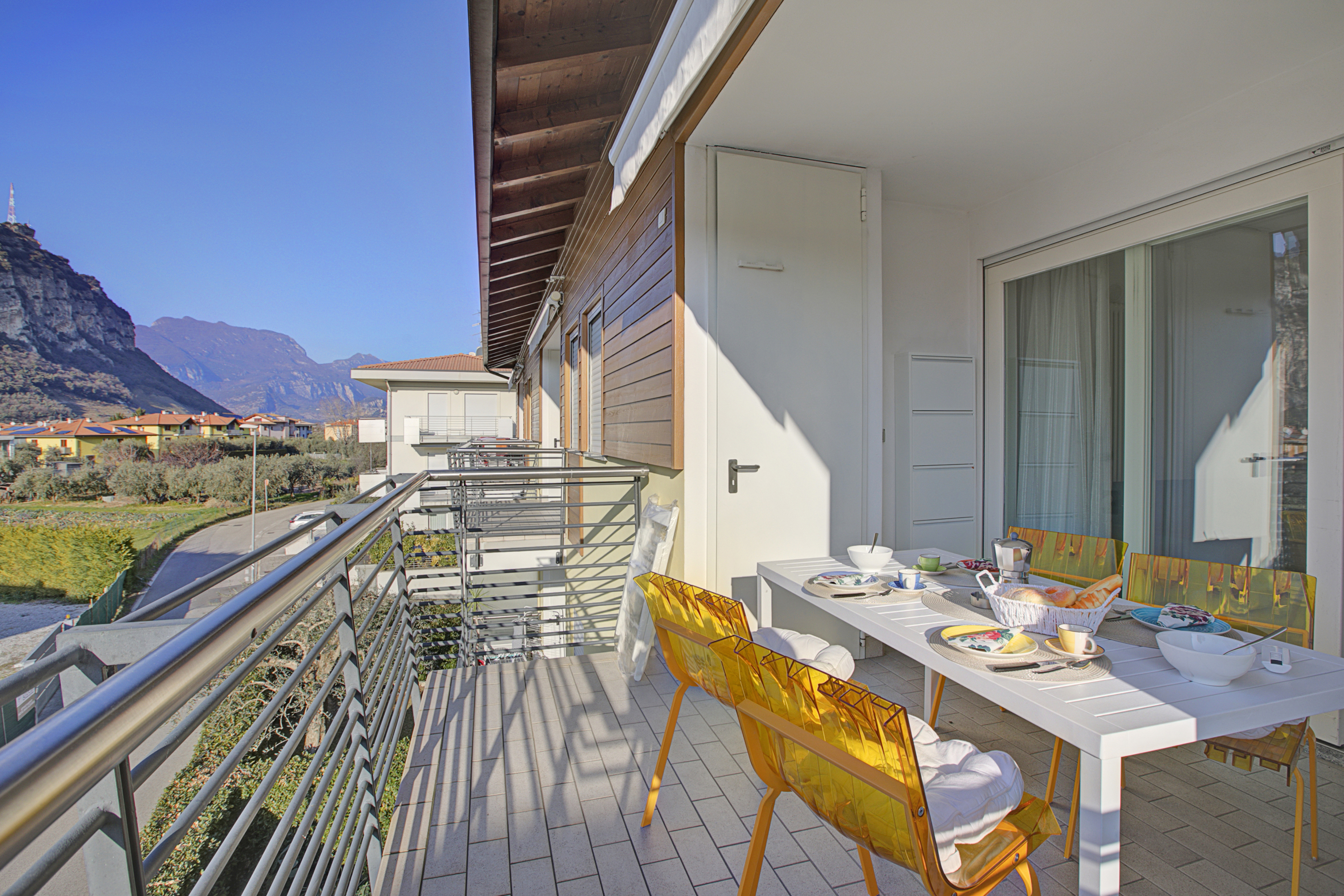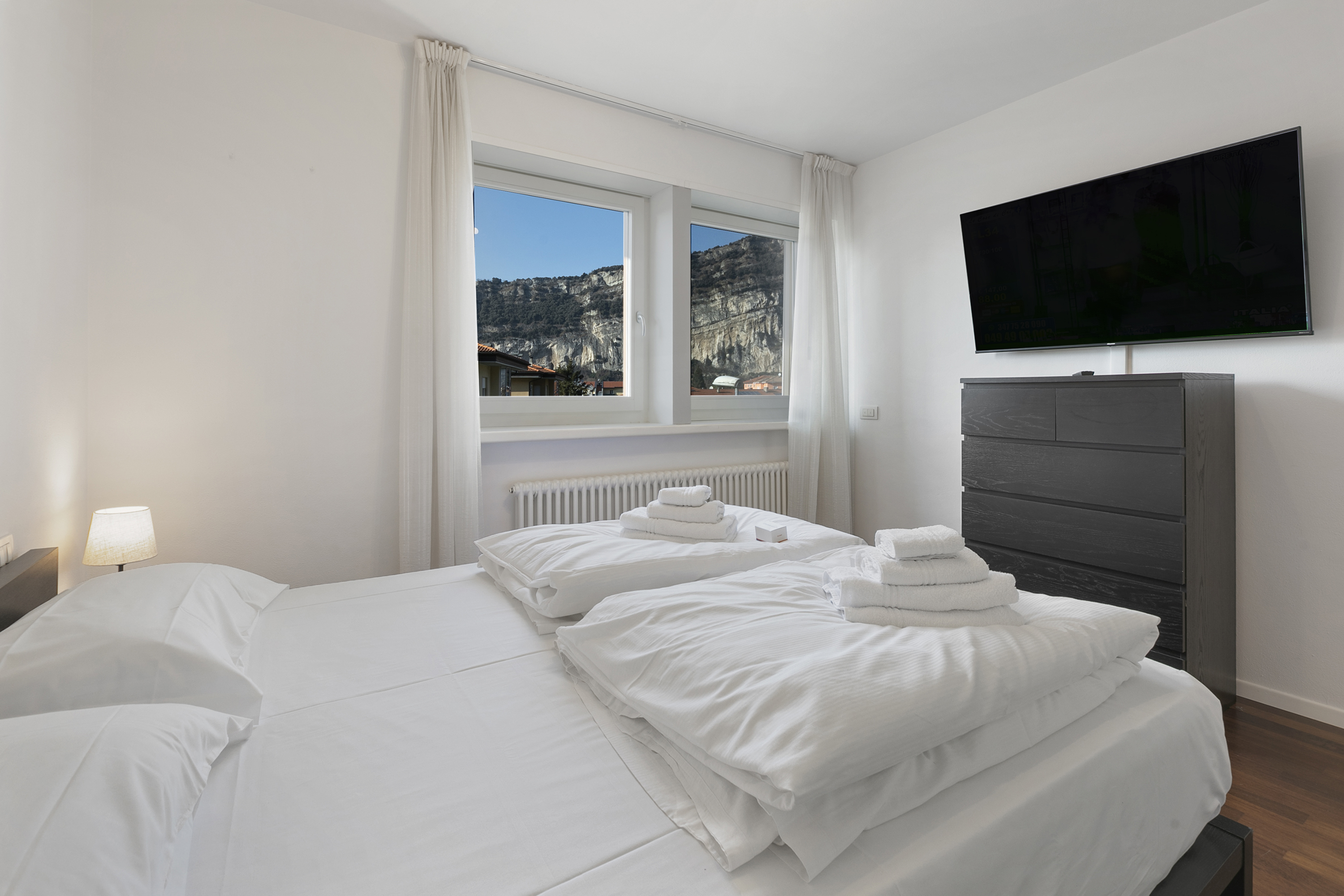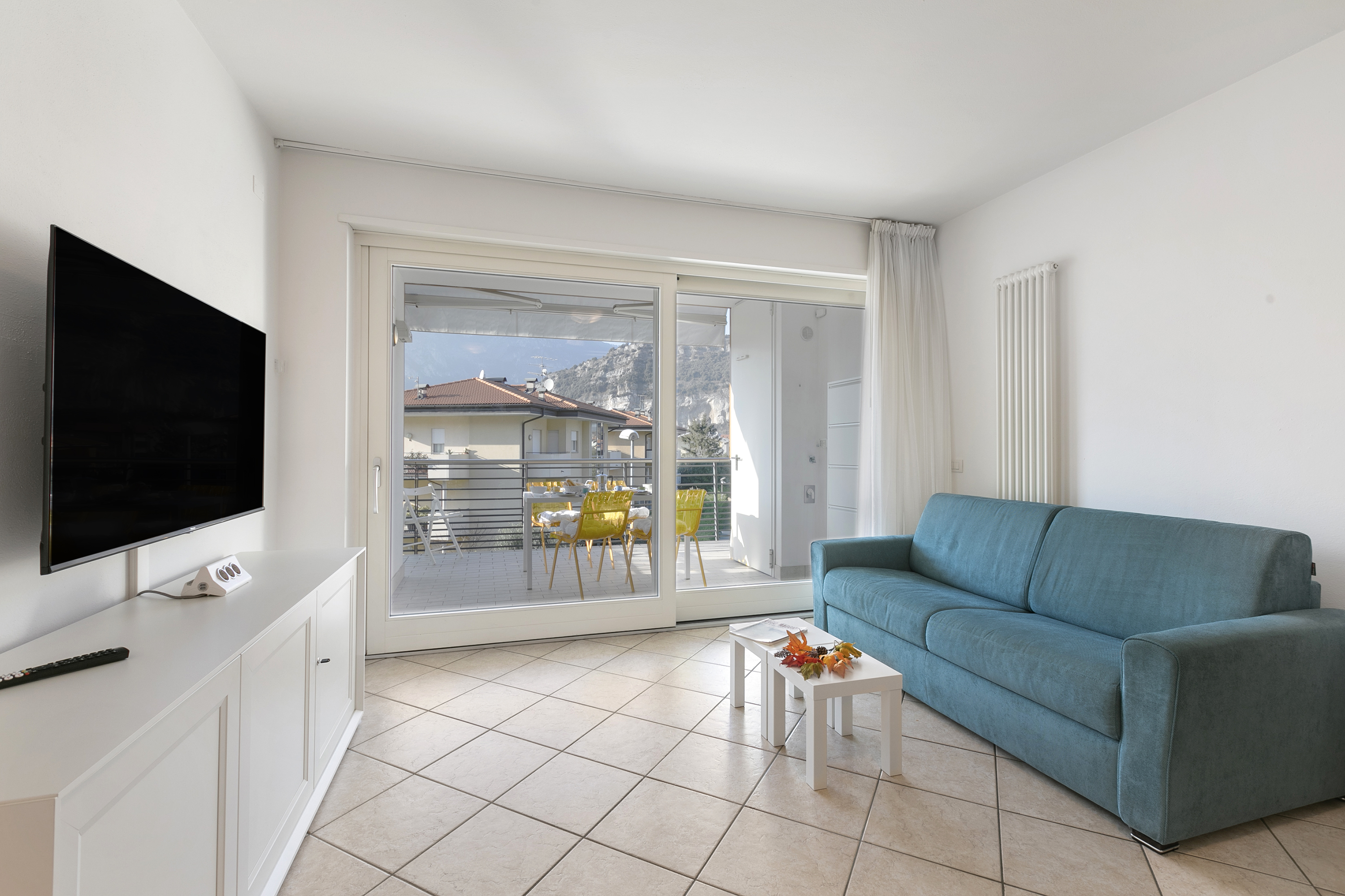 Gelegen op de tweede verdieping van een modern drie verdiepingen tellend gebouw, biedt dit appartement een lichte en open woonruimte met een comfortabele bank, televisie en directe toegang tot een charmant terras met een prachtig uitzicht op de bergen. De volledig uitgeruste keuken beschikt over een koffiezetapparaat, vaatwasser, elektrische waterkoker, magnetron, oven, broodrooster, koelkast en een inductiekookplaat, waardoor een aangenaam en comfortabel verblijf gegarandeerd is. Moderne voorzieningen zoals gratis WiFi en een spelletjesbibliotheek zorgen voor extra vermaak.