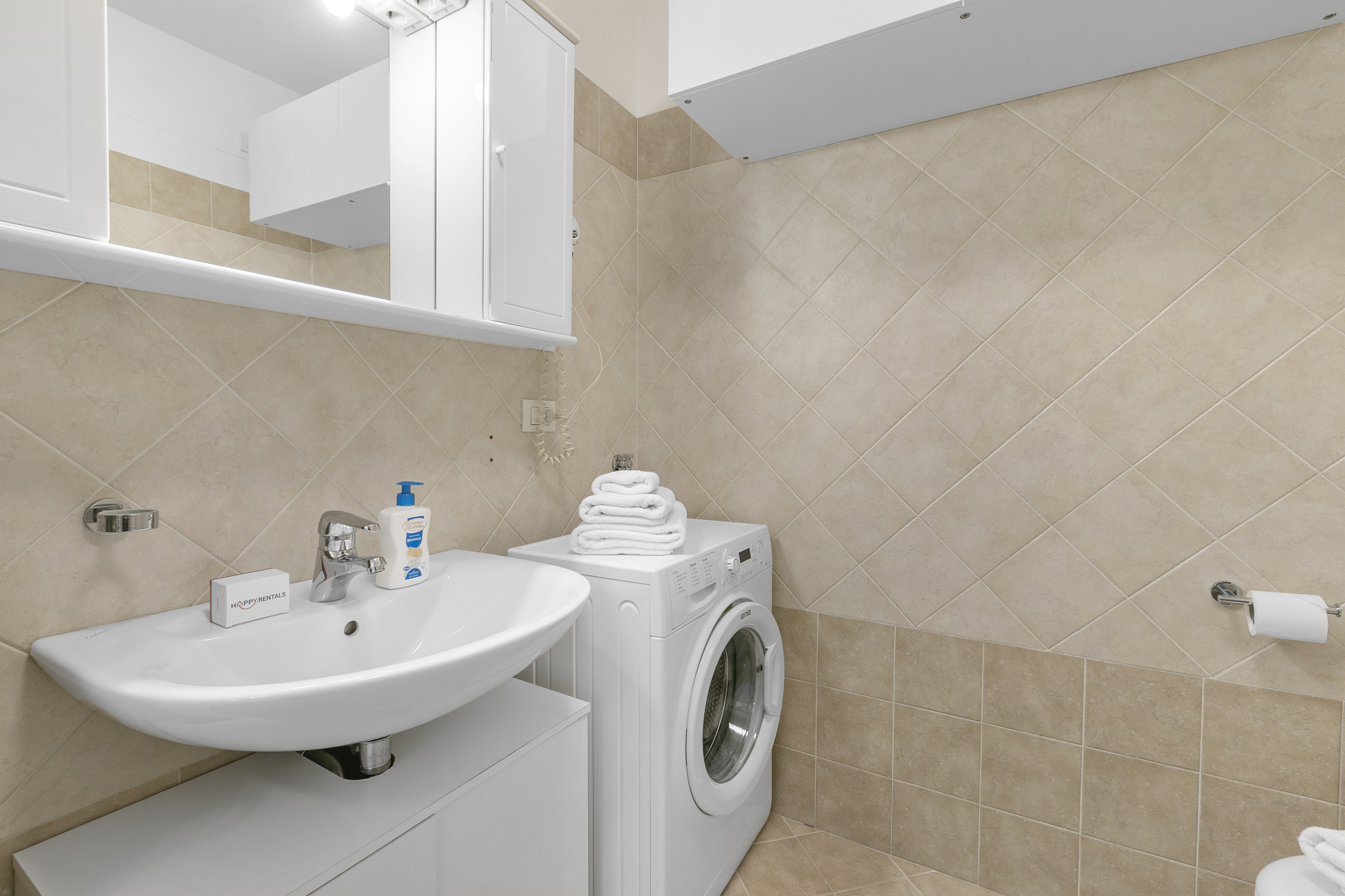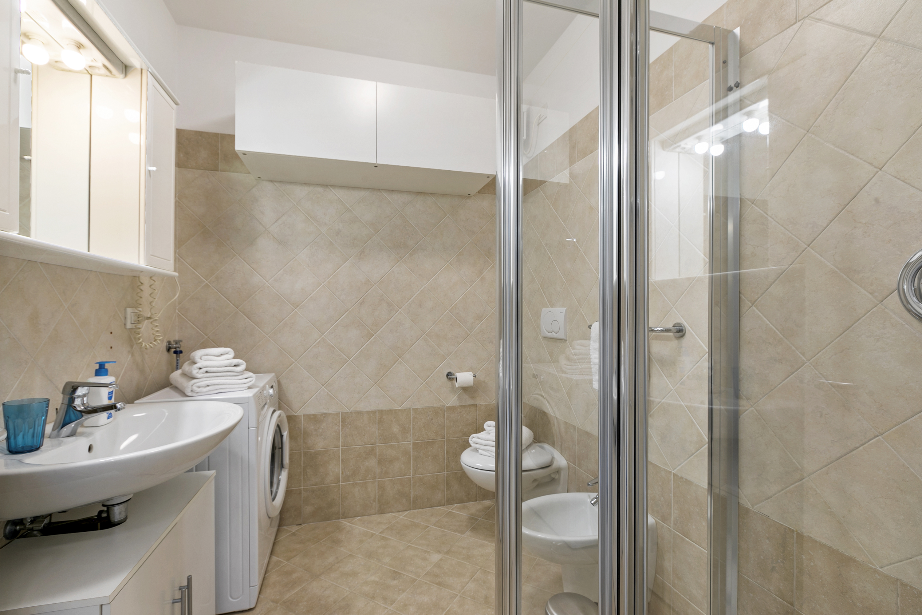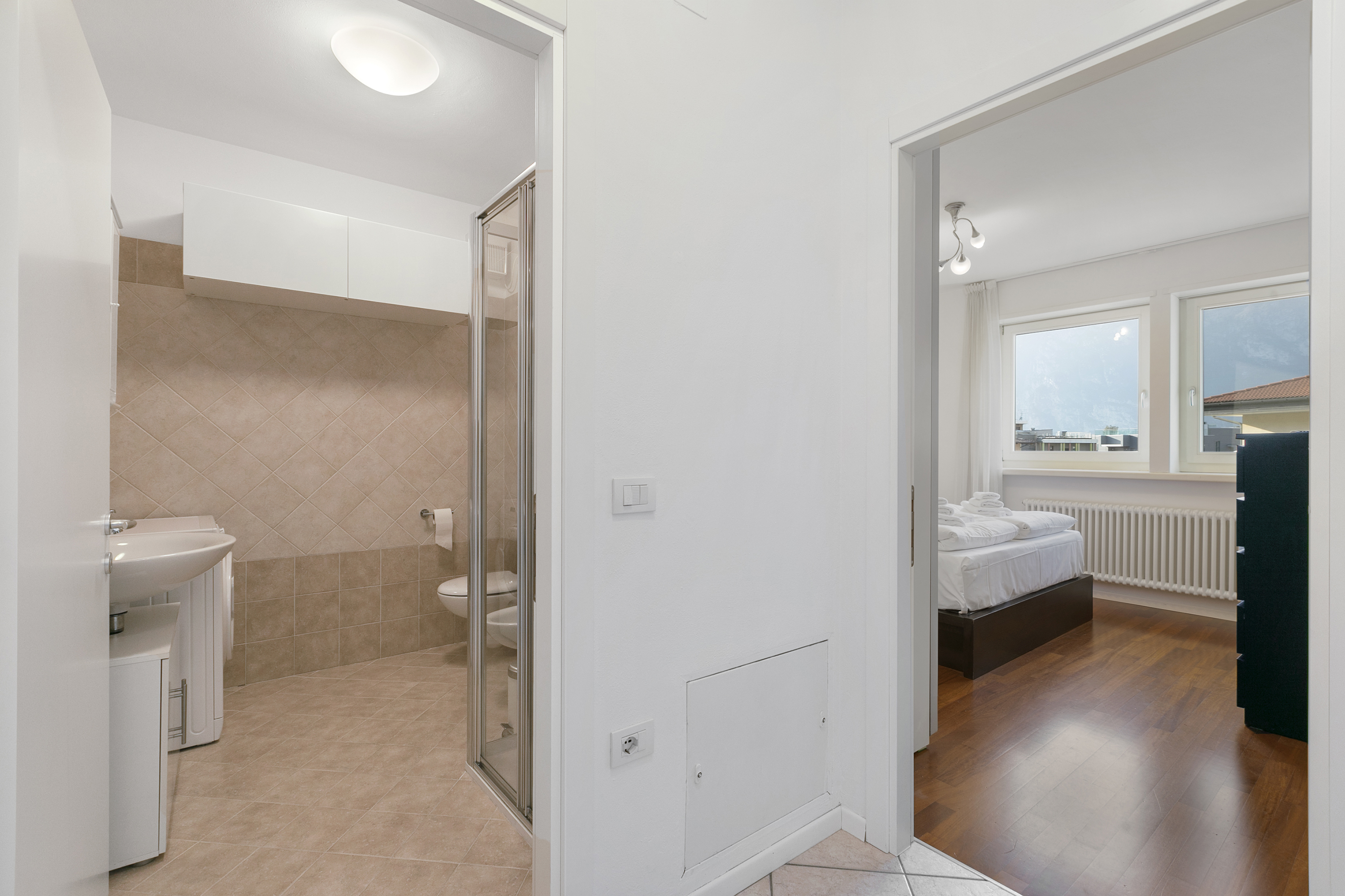 Gelegen op de tweede verdieping van een modern drie verdiepingen tellend gebouw, biedt dit appartement een lichte en open woonruimte met een comfortabele bank, televisie en directe toegang tot een charmant terras met een prachtig uitzicht op de bergen. De volledig uitgeruste keuken beschikt over een koffiezetapparaat, vaatwasser, elektrische waterkoker, magnetron, oven, broodrooster, koelkast en een inductiekookplaat, waardoor een aangenaam en comfortabel verblijf gegarandeerd is. Moderne voorzieningen zoals gratis WiFi en een spelletjesbibliotheek zorgen voor extra vermaak.