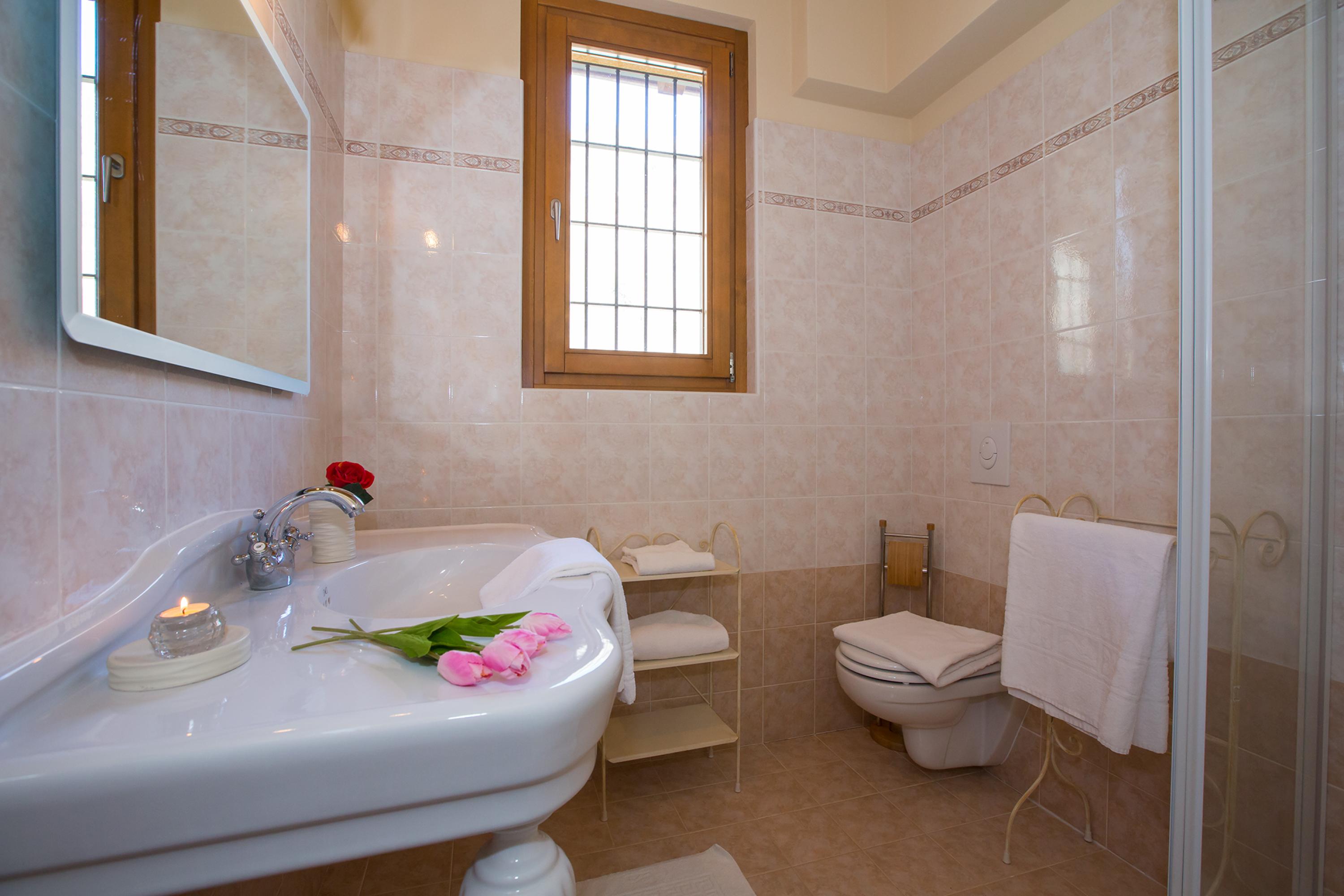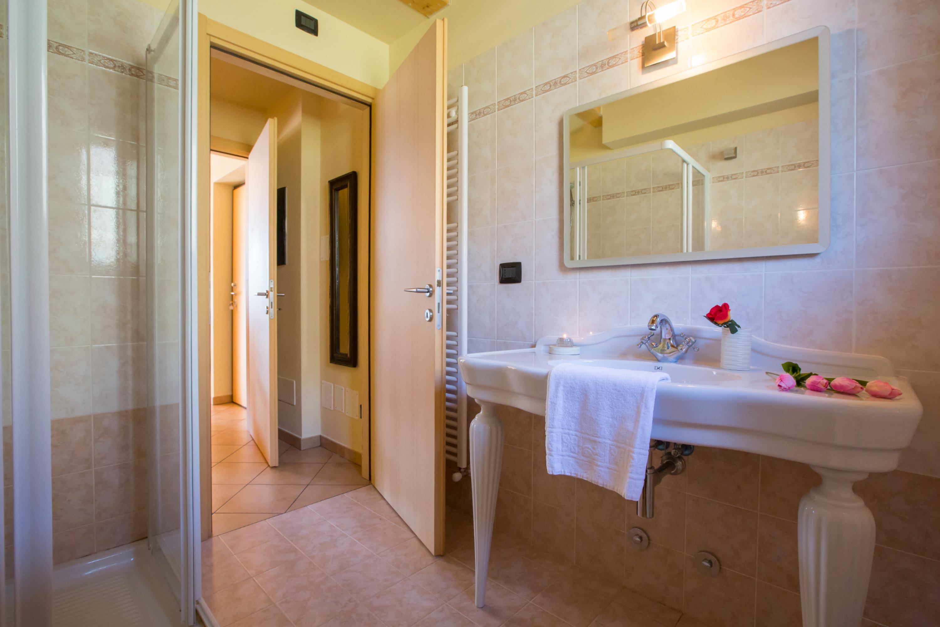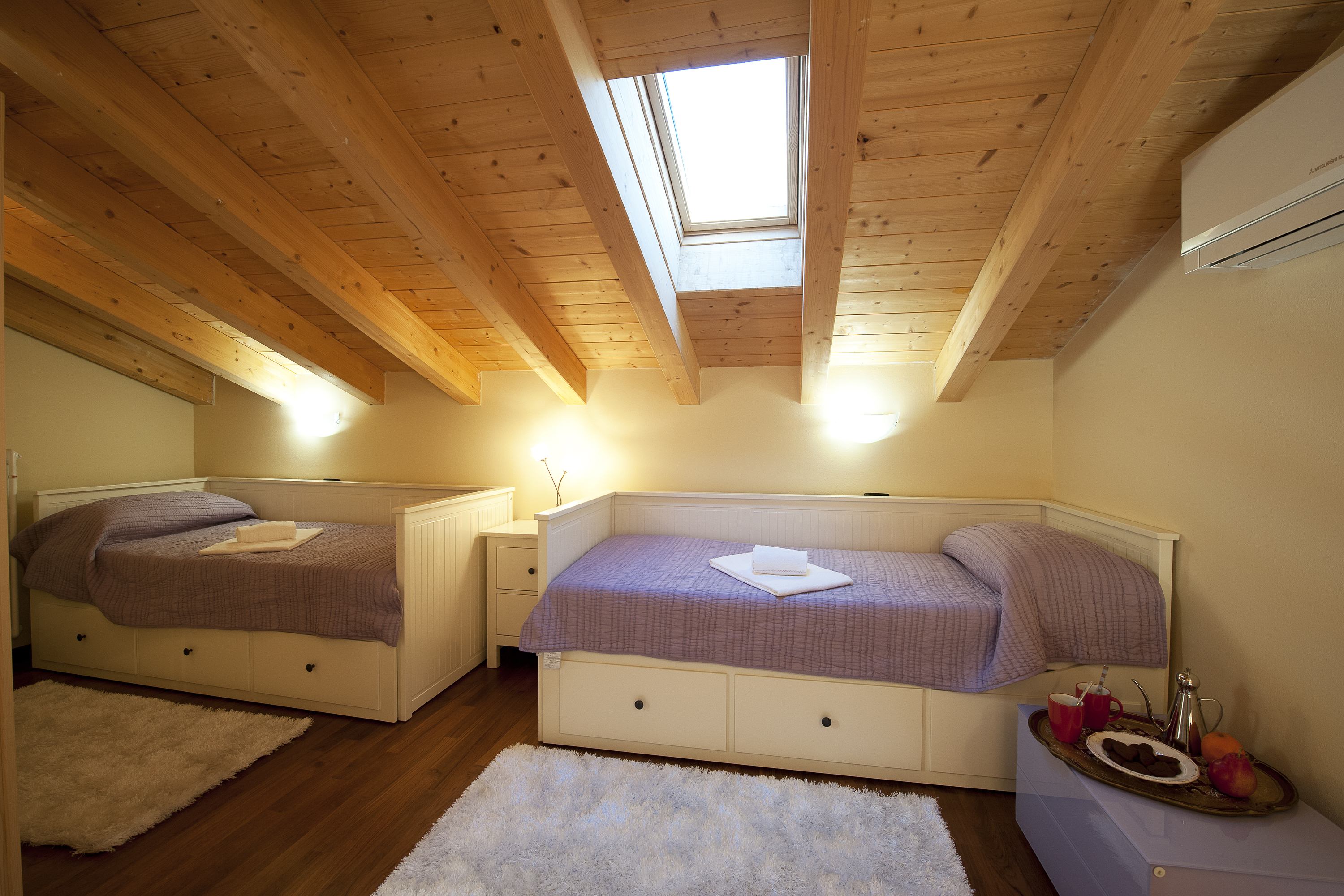 De hoofdslaapkamer is voorzien van een massief houten tweepersoonsbed, een kledingkast en een flatscreen-tv aan de muur. De tweede slaapkamer op de bovenverdieping is ingericht met twee eenpersoonsbedden, ideaal voor kinderen. Het interieur omvat een gezinsbadkamer met een nieuw geïnstalleerde douche. Het duplexappartement op de eerste verdieping biedt gemakkelijke toegang tot de tuin.