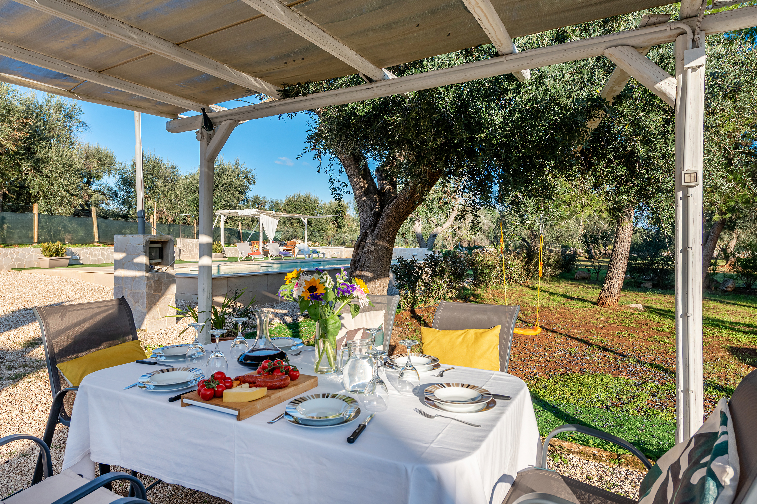 Aan de rand van de beroemde Valle d’Itria, te midden van uitgestrekte privétuinen vol olijfbomen, is dit unieke complex van drie eeuwenoude trulli en een gerestaureerde lamia een prachtige vakantiebestemming. De accommodatie ligt op slechts 35 minuten ten westen van Brindisi en op 10 minuten van het stadje San Vito Michele Salentino. De dichtstbijzijnde luchthaven is Aeroporto del Salento, Brindisi, eveneens op korte rijafstand.