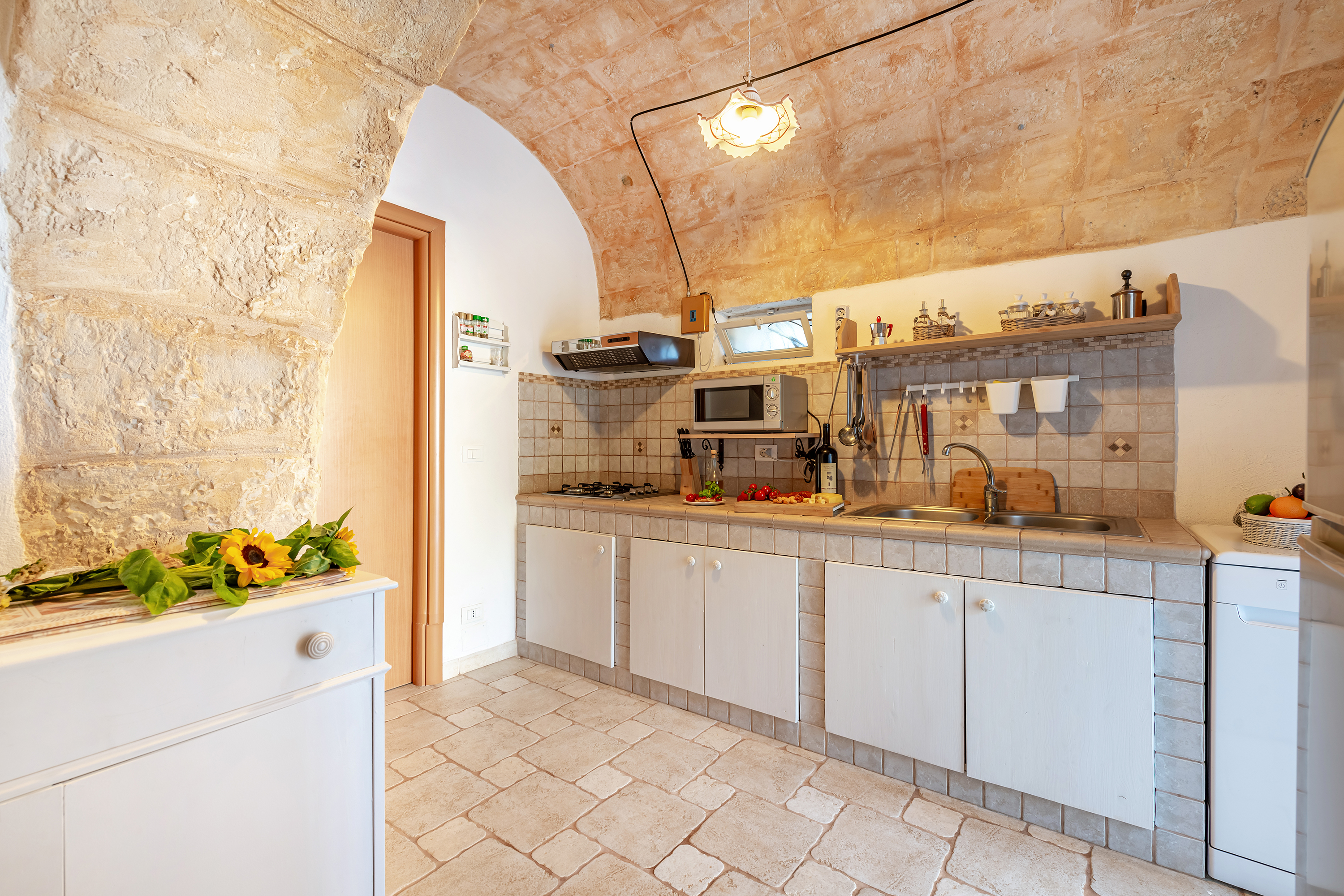 De woning, geschikt voor 5 personen, is zorgvuldig gerestaureerd en van alle moderne gemakken voorzien. De open woonkamer, onder de stenen koepels van de trulli, heeft een comfortabele bank, een eettafel voor 5 personen, een houtkachel voor de wintermaanden en twee tweepersoonsslaapkamers in nissen met gordijnen. De aparte keuken is goed uitgerust met moderne apparatuur en een deur die direct naar de tuin leidt. De slaapkamers en badkamer zijn prachtig ingericht en bieden een comfortabel verblijf.