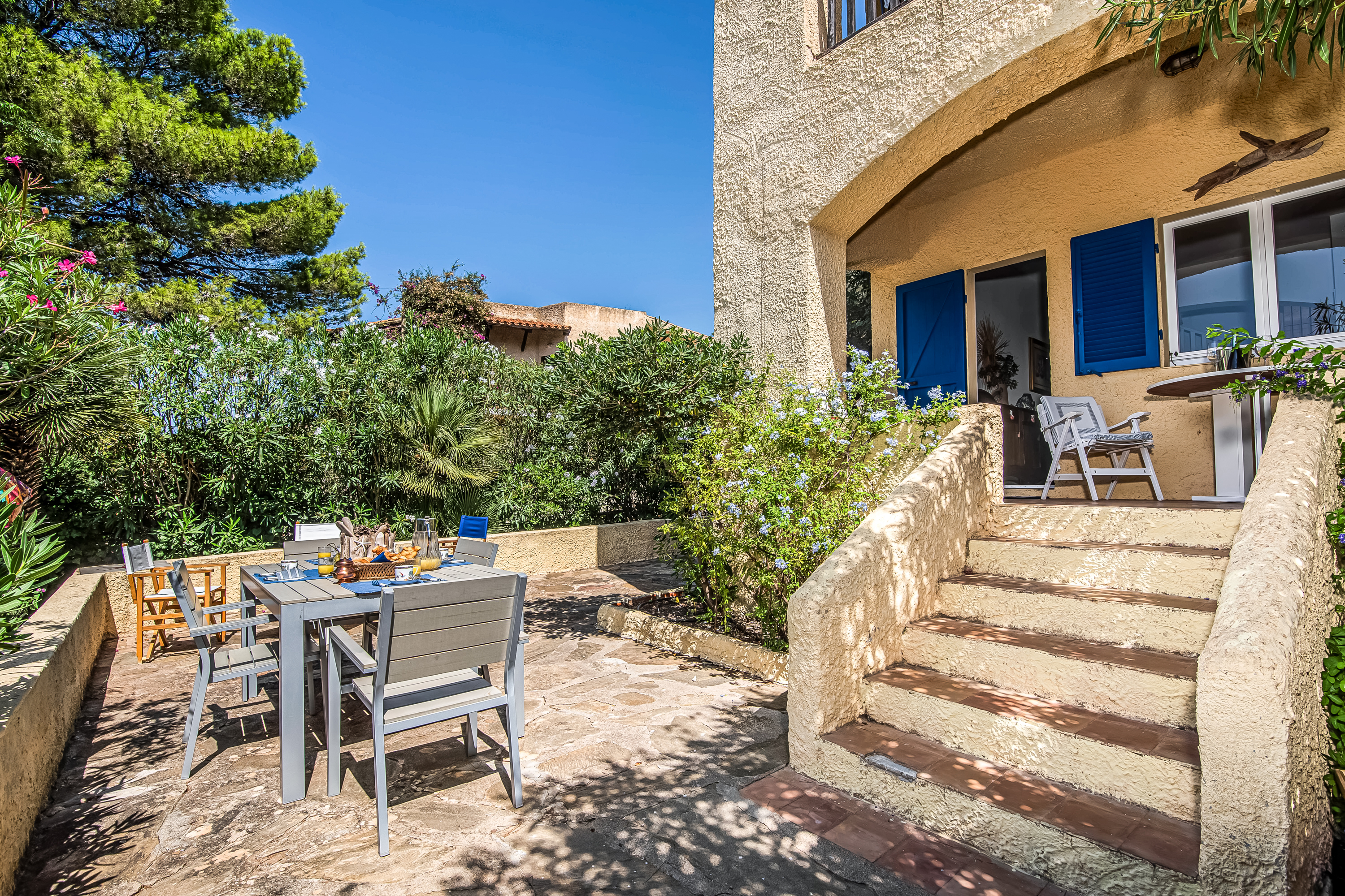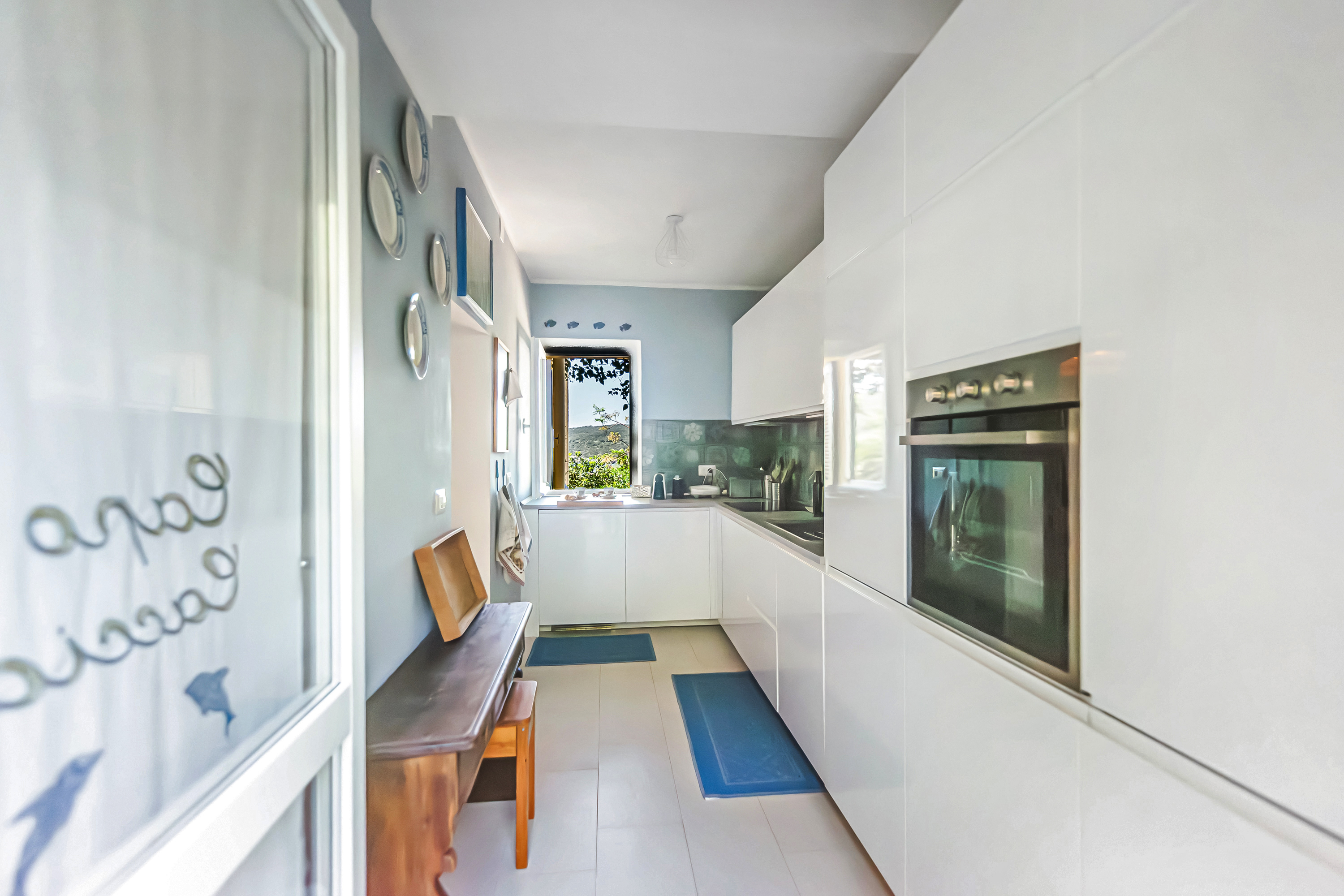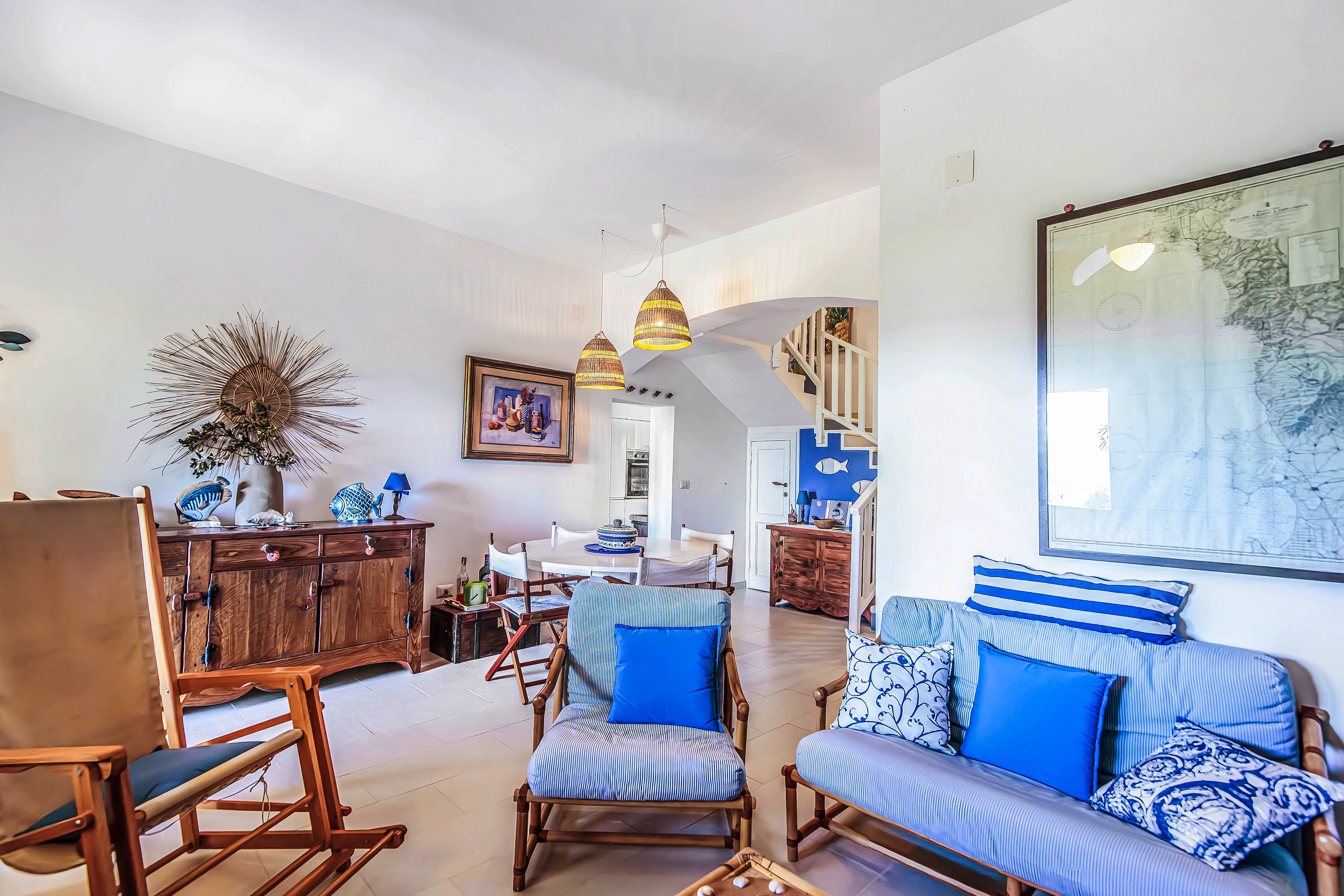 De villa met twee verdiepingen heeft een ruime, open woon-/eetkamer, ingericht met een bank, fauteuils, een flatscreen-tv en een ronde eettafel. Een trap leidt naar de slaapkamers en de deur komt uit op een overdekte veranda met uitzicht op zee. De aparte, moderne keuken is prachtig ingericht met een inductiekookplaat, oven, magnetron, vaatwasser, Nespresso-koffiemachine en koel-/vriescombinatie.