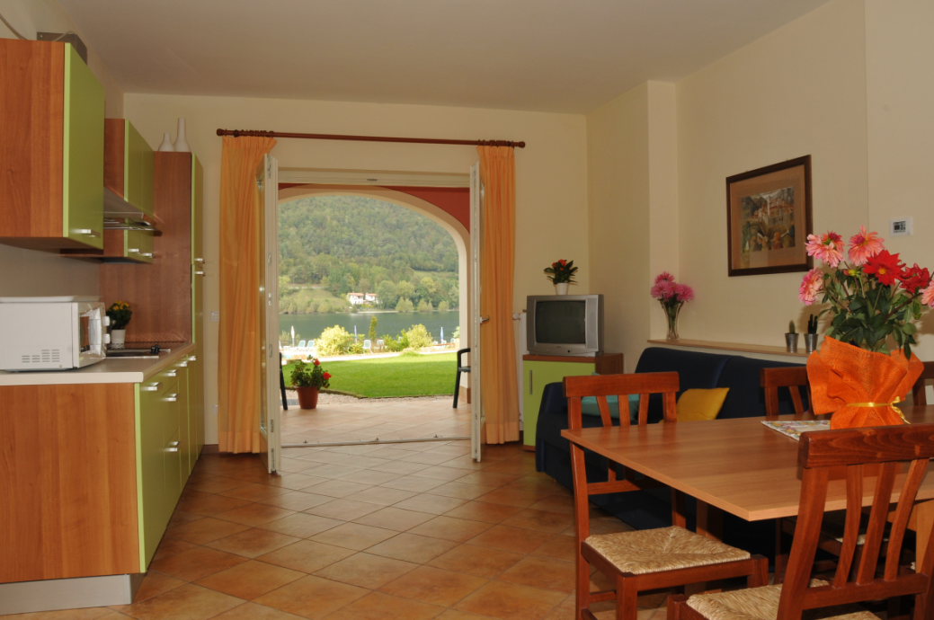 Deze grote woning is geschikt voor zes tot acht personen en bestaat uit twee verdiepingen. Dit appartement heeft een oppervlakte van ca. 90m². Dit grote appartement bestaat uit twee woningen, die door een binnentrap en een tussendeur verbonden zijn. Op de begane grond vindt u de woonkamers, die van twee tweepersoonsslaapbanken zijn voorzien. De twee volledig ingerichte open keukens, die aan de woonkamers grenzen, zijn uitgerust met 2 pits elektrisch fornuizen, koffiezetapparaten, magnetrons , waterkokers en twee koelkasten met vriesvakken. Er is ook een slaapkamer met een tweepersoonsslaapbank en een badkamer die over een douche, toilet, bidet en haardroger beschikt. Op de eerste verdieping is er een tweede slaapkamer, die over een tweepersoonsbed beschikt en een tweede badkamer met een douche, toilet, bidet en haardroger. Alle appartementen zijn comfortabel en modern ingericht en hebben centrale verwarming, een kluis en TV met satellietverbinding. Vanaf het overdekte terras voorzien van tafel en stoelen, kunt u van het schitterende uitzicht over de bergen en het meer genieten. Er bevindt zich nog een tweede terras aan de achterzijde van de woning, die ook van tuinmeubilair is voorzien.