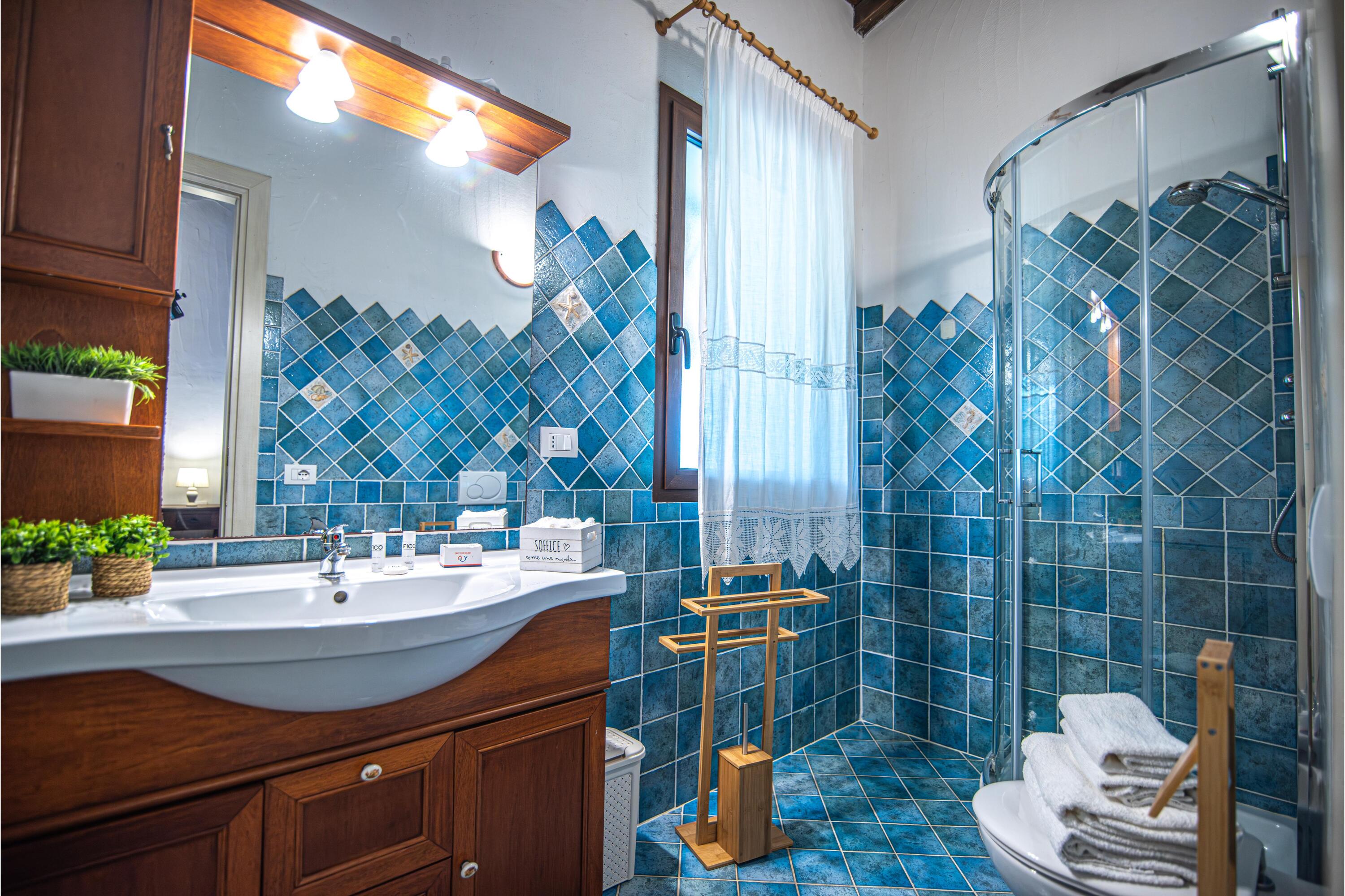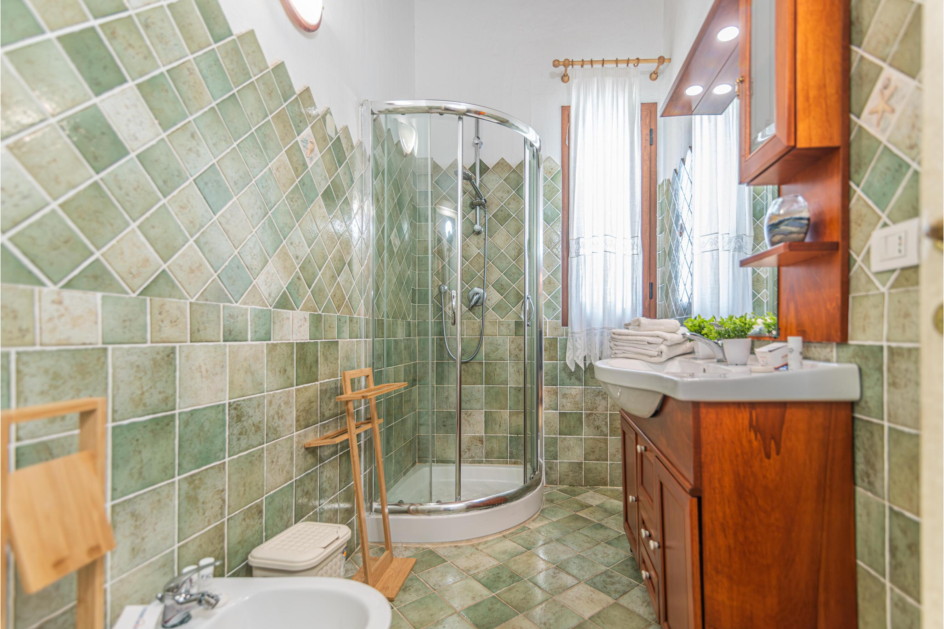 - Badkamer 2: Deze aparte, licht betegelde badkamer heeft een douche, wastafel, bidet en toilet.