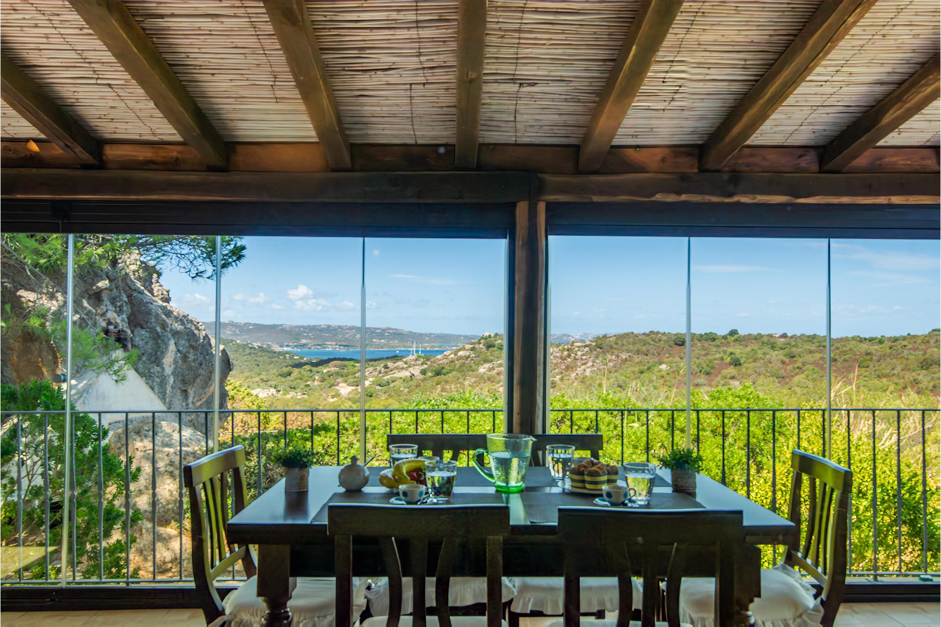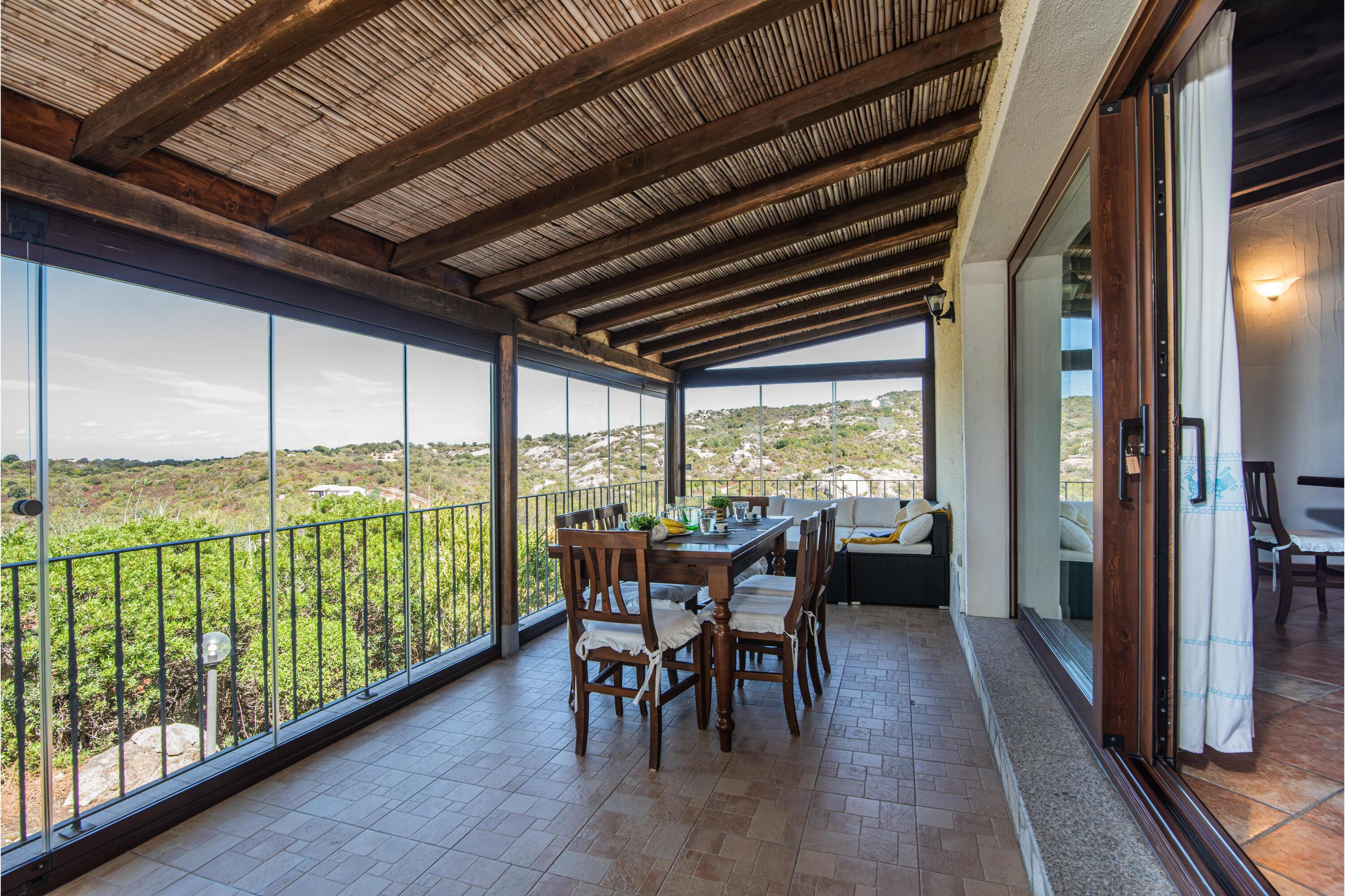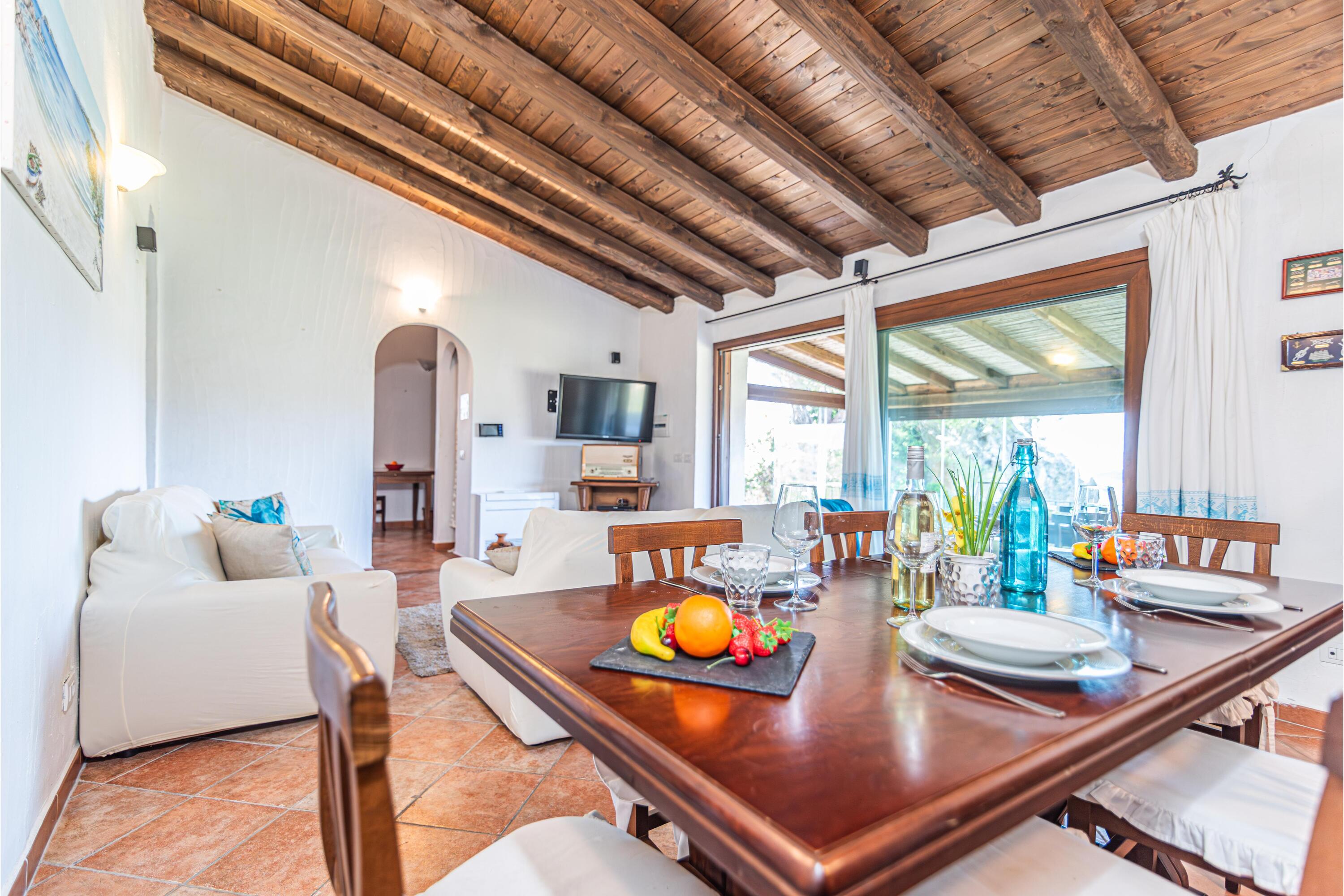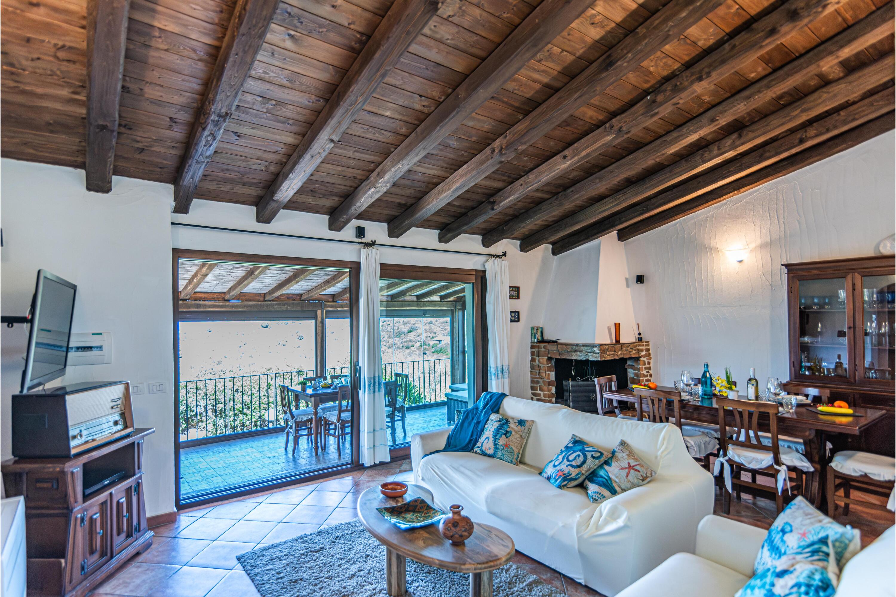 De villa is verdeeld over één verdieping en beschikt over een ruime woonkamer met houten balkenplafonds en terracotta vloeren. Deze is ingericht met twee comfortabele banken en een flatscreen-tv. Het eetgedeelte bevindt zich naast een open haard en is voorzien van een houten eettafel en stoelen. Grote glazen deuren leiden naar een overdekte veranda met panoramisch uitzicht. Deze veranda fungeert als extra leefruimte, met twee banken en een extra eettafel om half buiten te eten.