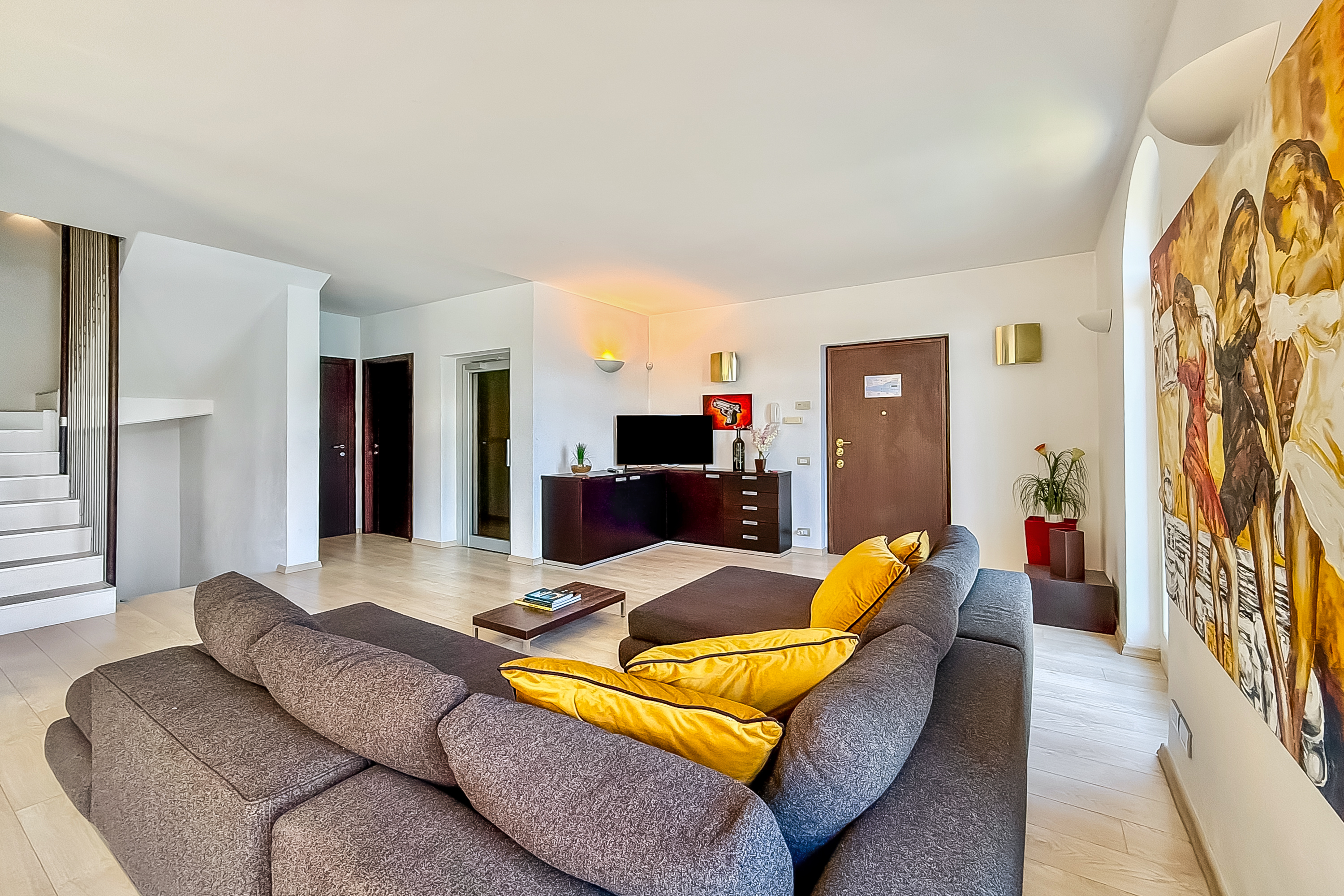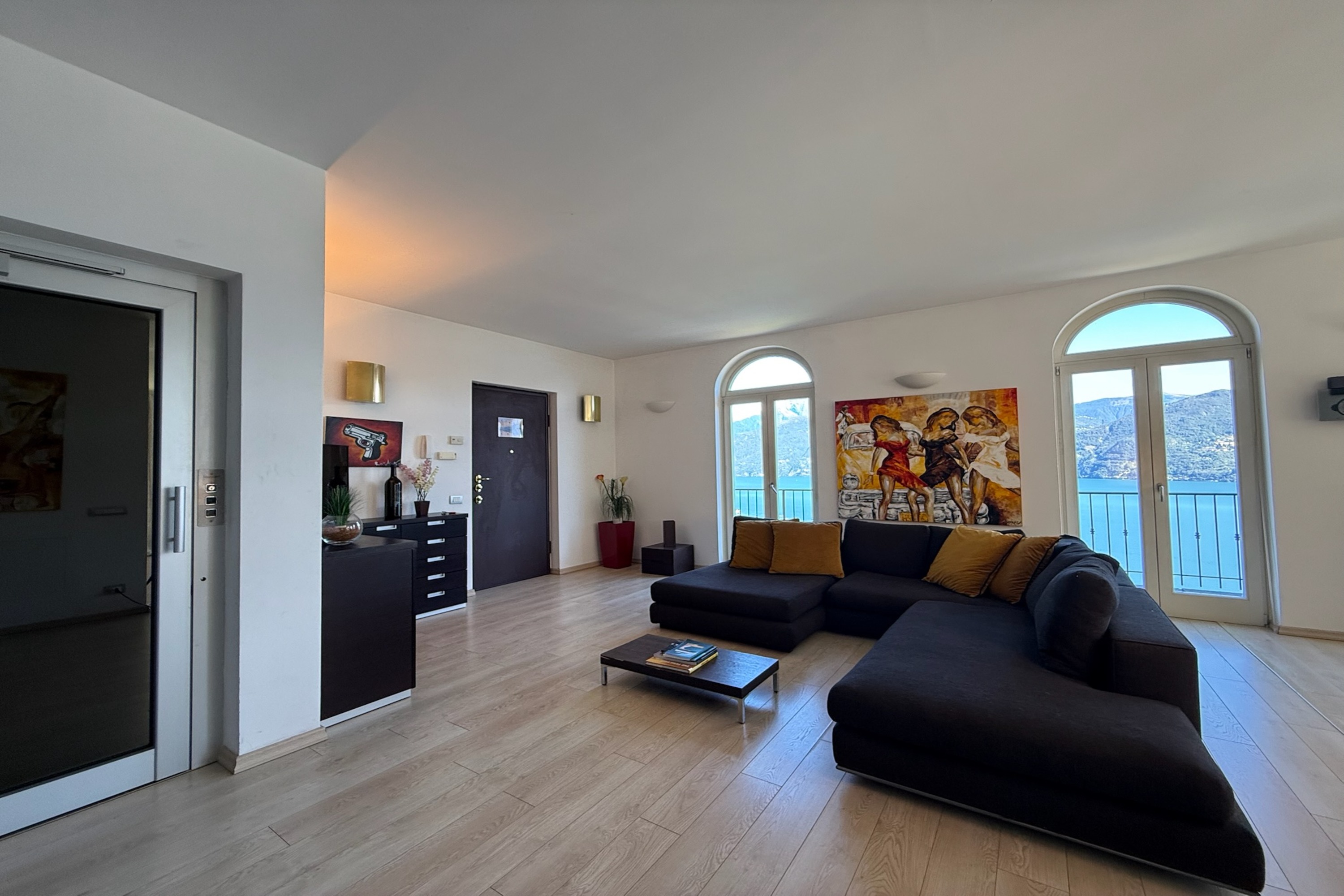 Wanneer je de lift verlaat op de eerste verdieping, kom je in een ruime, moderne en lichtovergoten open woonkamer en keuken, die prachtig uitzicht op het meer biedt en directe toegang heeft tot het hoofdterras. Twee slaapkamers bevinden zich op deze verdieping, waarvan er één directe toegang heeft tot het terras en een volledig panoramisch uitzicht op het meer biedt. Daarnaast is er een badkamer met zowel een bad als een overhead-douche.