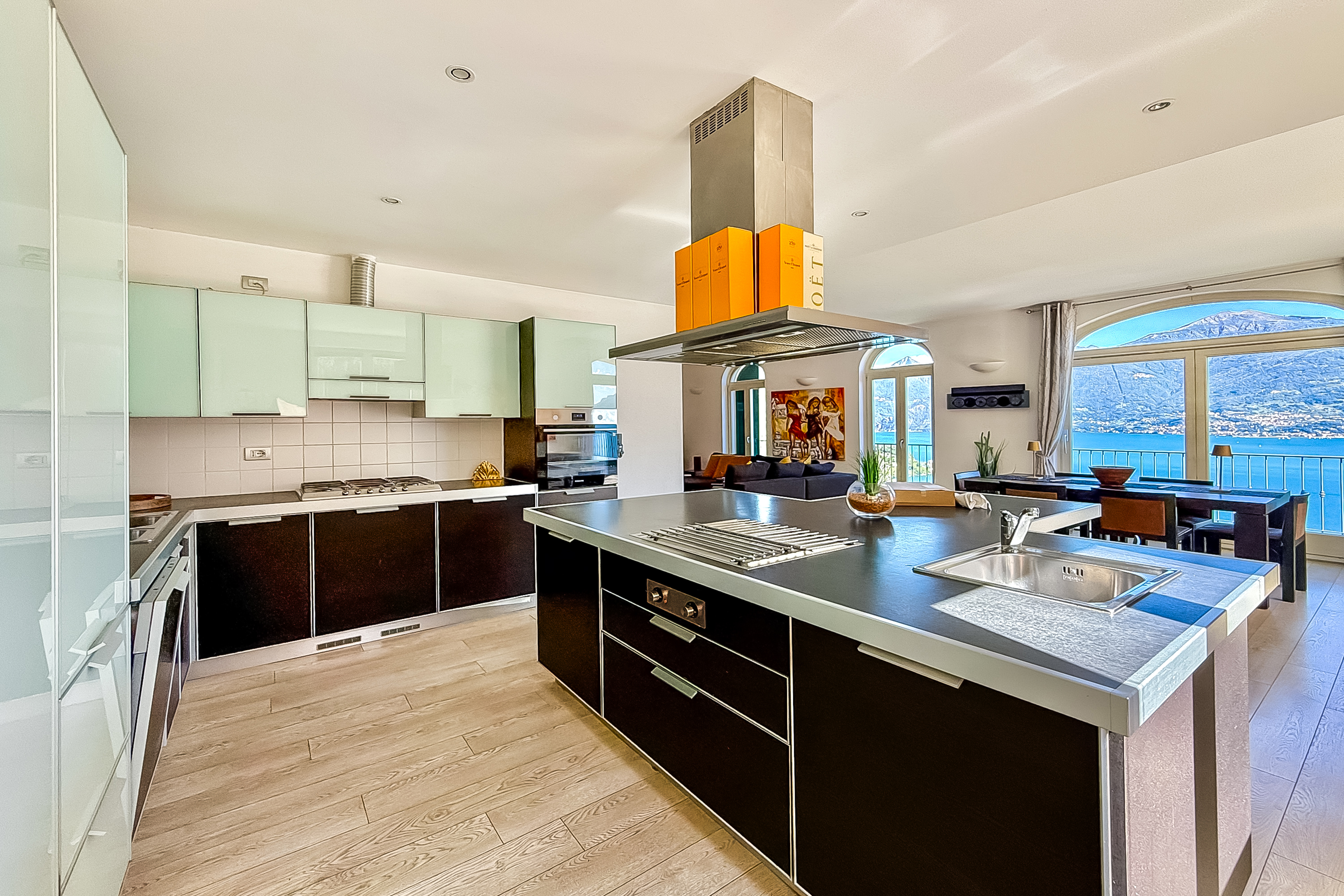 De tweede verdieping beschikt over een volledig uitgeruste, moderne keuken met alle benodigde apparatuur. Het centrale eiland, compleet met een ingebouwde Teppanyaki-grill en zitplaatsen, is perfect om gasten te ontvangen. De chique eetkamer biedt plaats aan maximaal 8 gasten, en de woonkamer heeft comfortabele banken, een flatscreen-tv met Sky en een muur-CD-speler van Bang & Olufsen. De kamer heeft drie glazen deuren die adembenemend uitzicht op het meer bieden en leiden naar een balkon dat de hele lengte van het huis beslaat. Een schuifdeur opent ook naar het zonnige terras van de villa, waar je buiten kunt dineren voor maximaal 8 personen terwijl je geniet van de panoramische uitzichten op het meer en de bergen. Deze verdieping bevat ook een moderne en stijlvolle toilet.