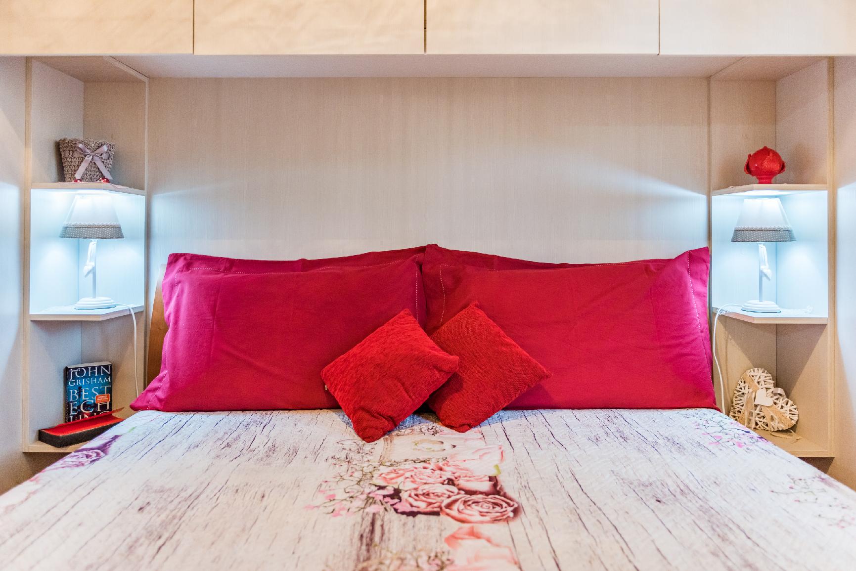 Das Innere der Unterkunft verfügt über zwei Einzelbetten in einem Schlafzimmer und ein Doppelbett in einem anderen. Es gibt ein voll ausgestattetes Badezimmer, und das Wohnzimmer umfasst ein Schlafsofa für eine Person.