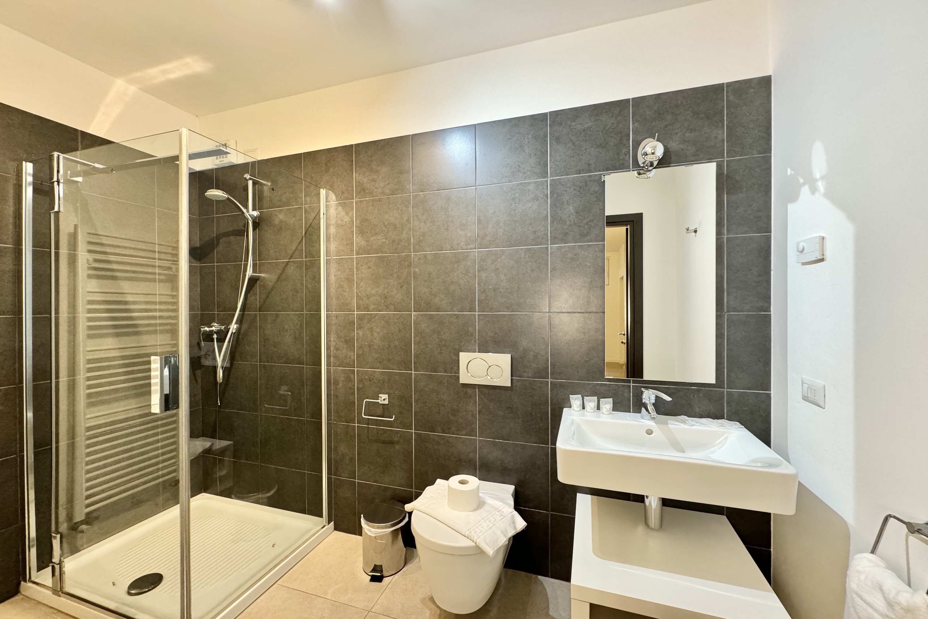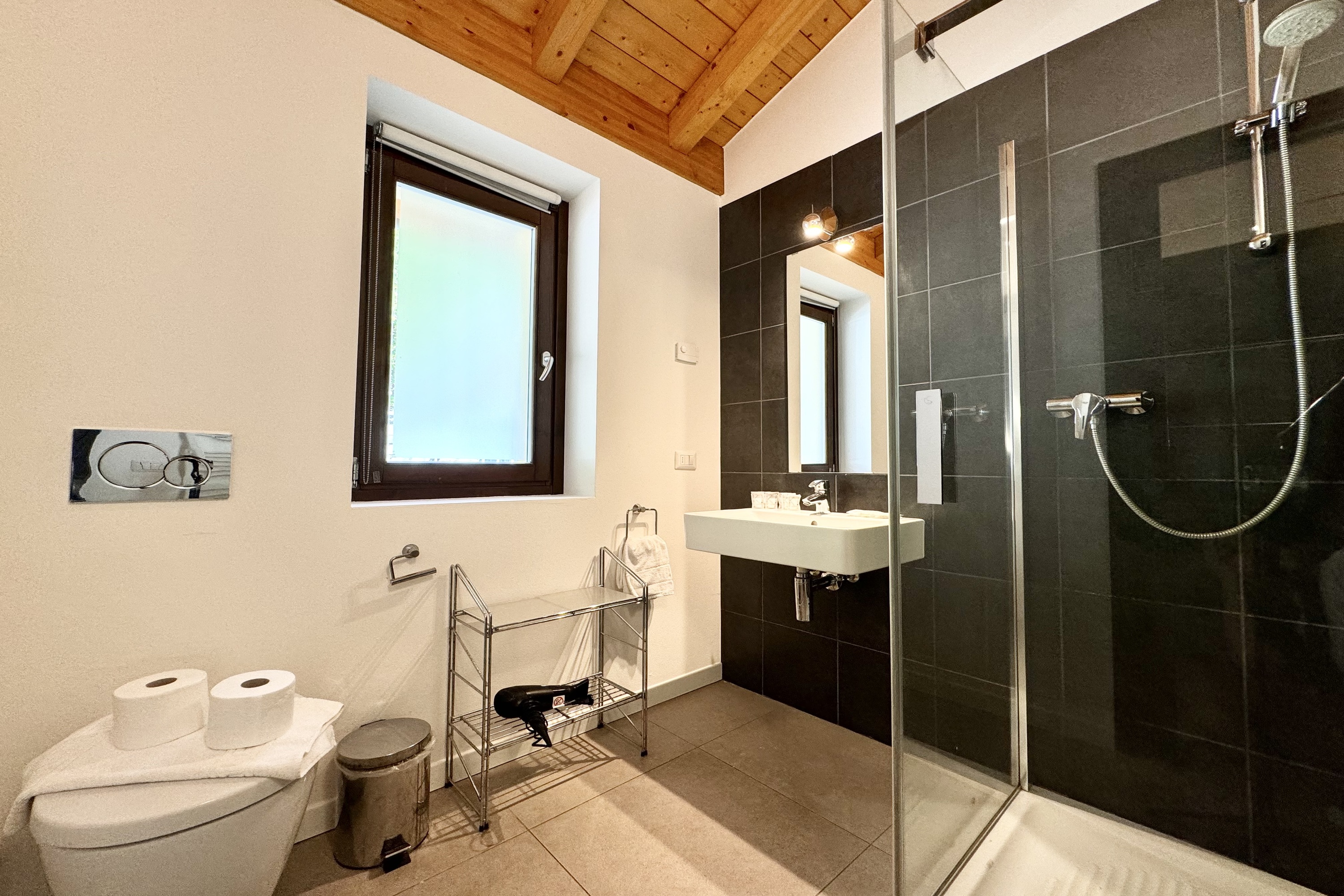- Slaapkamer op het lagere grondniveau: Stijlvol ontwerp, flexibel als slaap- of ontspanningsruimte, met een tweepersoons slaapbank en een eigen en-suite badkamer.