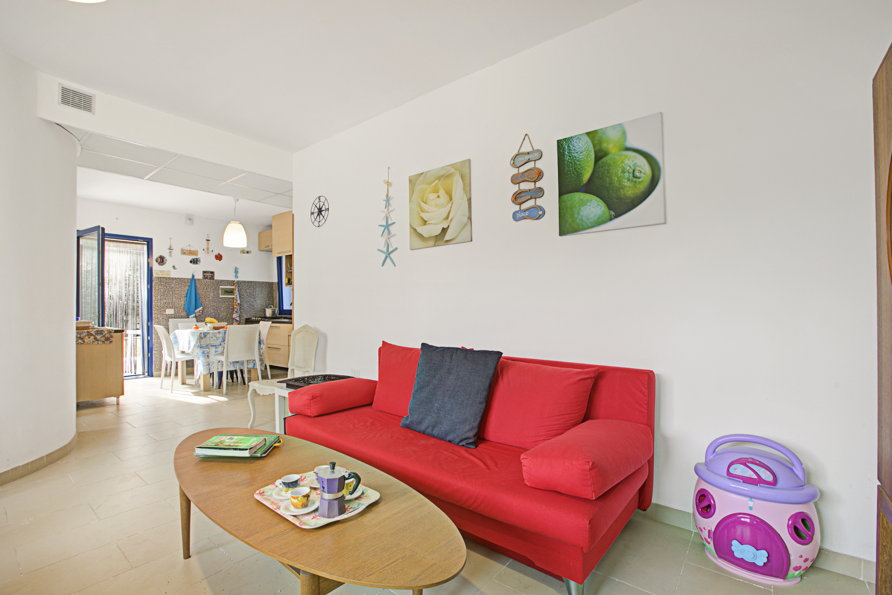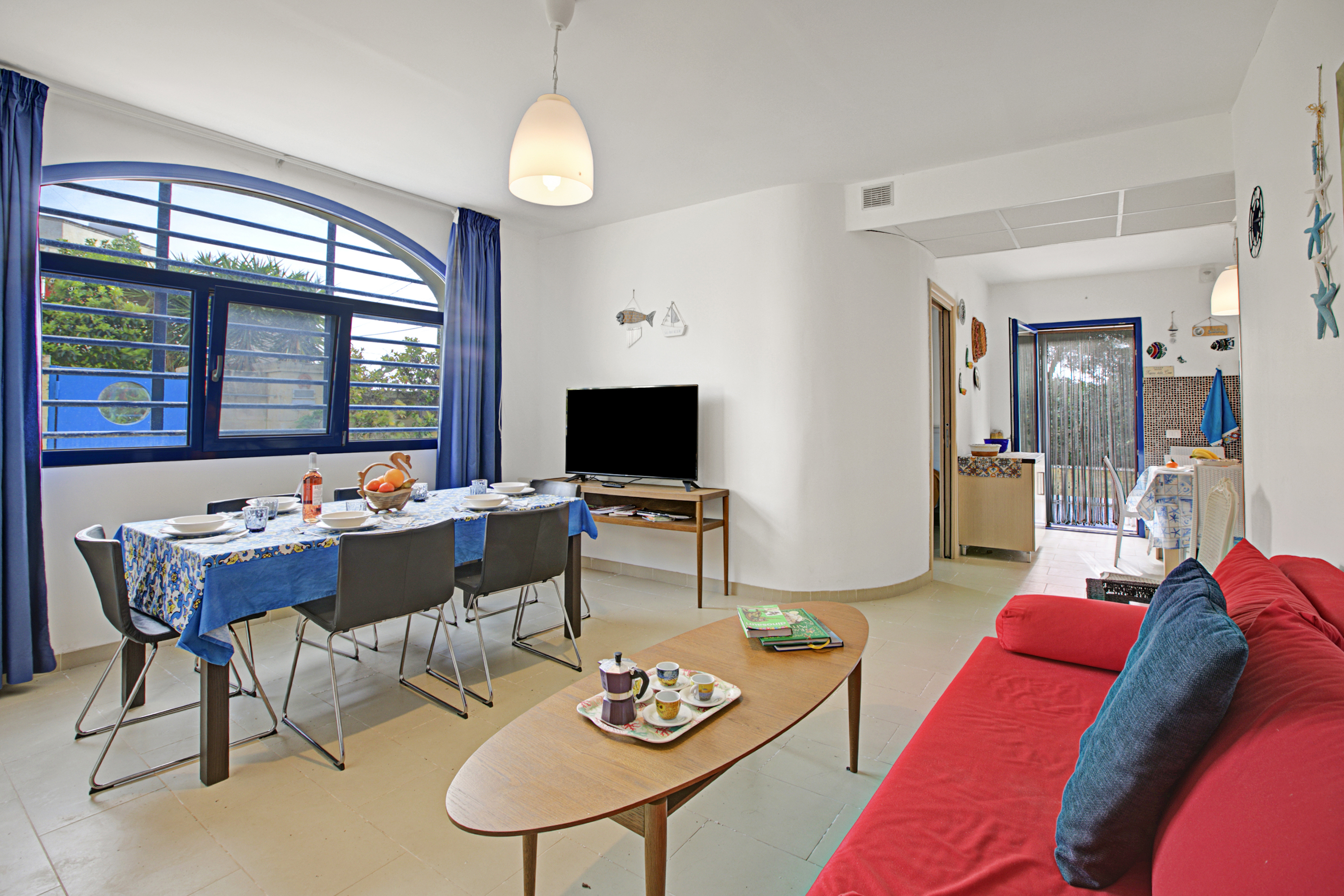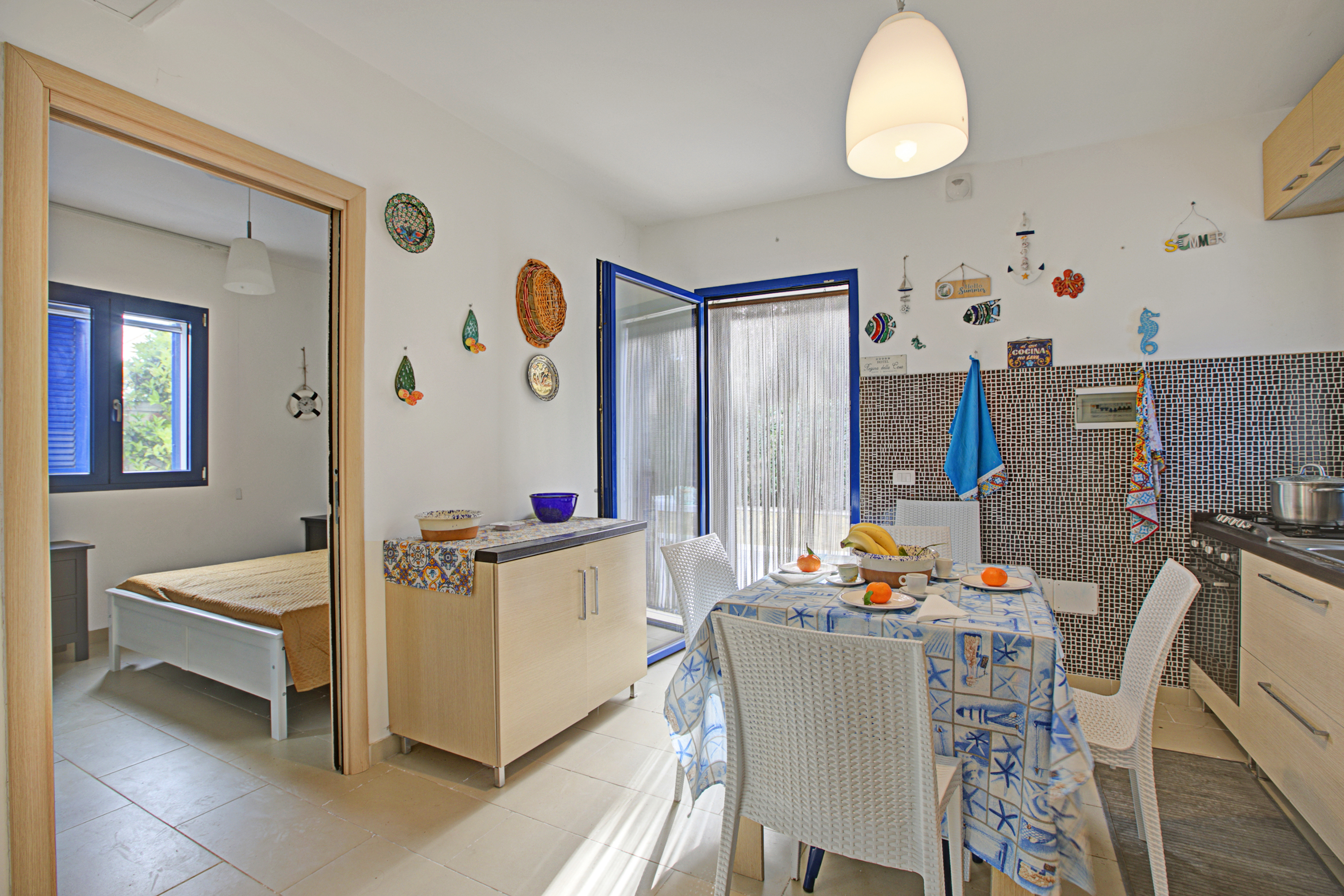 Binnenin beschikt de woonkamer over een gezellig tweepersoons slaapbank, een televisie en een eettafel voor ontspannen maaltijden. De moderne kitchenette is uitgerust met alle essentiële apparaten, waaronder een koffiezetapparaat, oven, kookplaat en koelkast. Gasten kunnen gebruikmaken van een gedeeld zwembad, perfect om af te koelen op warme, zonnige dagen. Het terras biedt ook een eetgedeelte in de buitenlucht met een tafel en stoelen – ideaal om te genieten van maaltijden in het heerlijke Puglische klimaat.