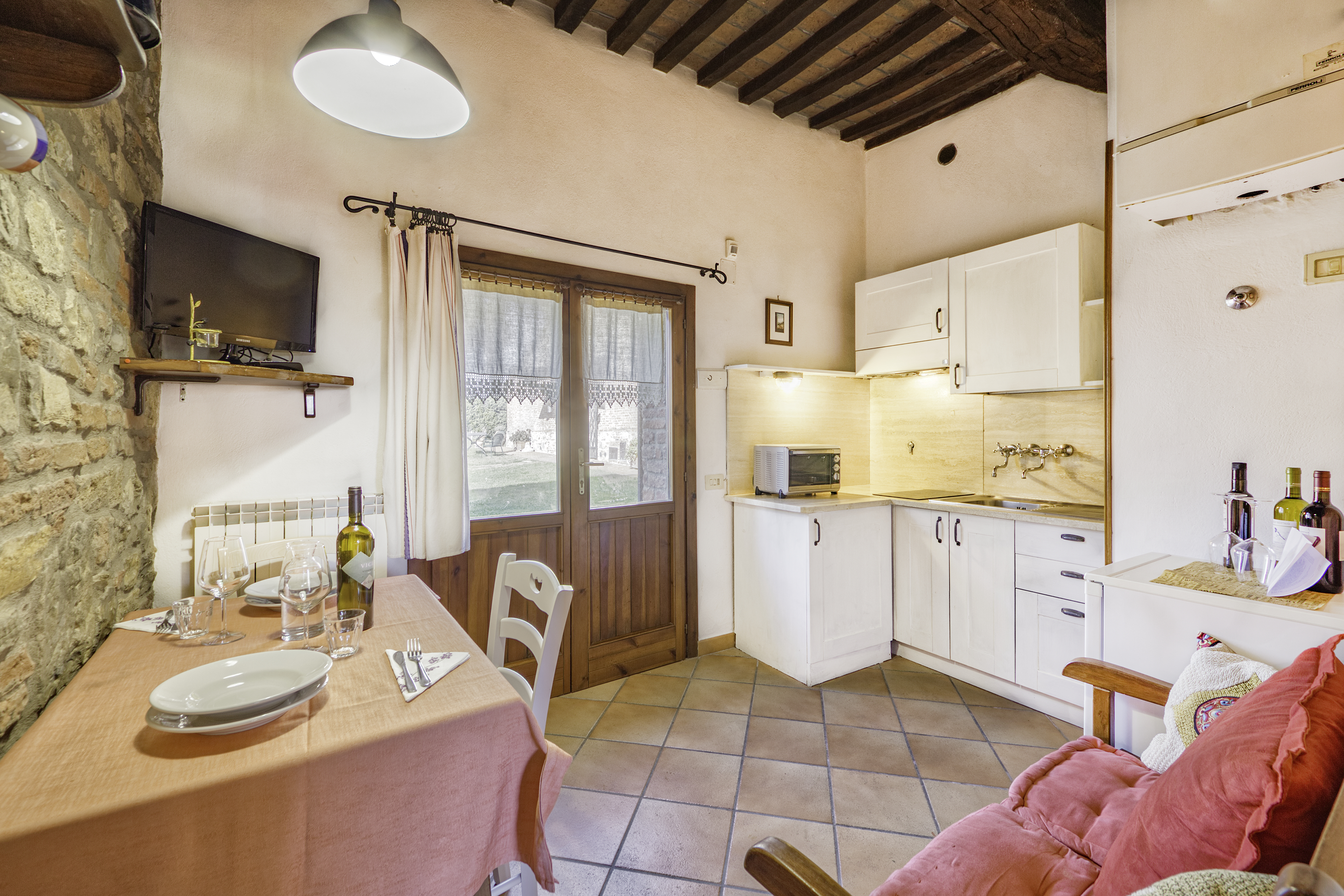 Dubbele deuren openen direct naar de open woonkamer, die is voorzien van terracotta tegelvloeren en een aantrekkelijke natuurstenen muur. Er is een bank met een flatscreen-tv, een eettafel en stoelen en een ingerichte keuken. De keuken is uitgerust met een kookplaat, magnetron, koelkast en koffiezetapparaat.