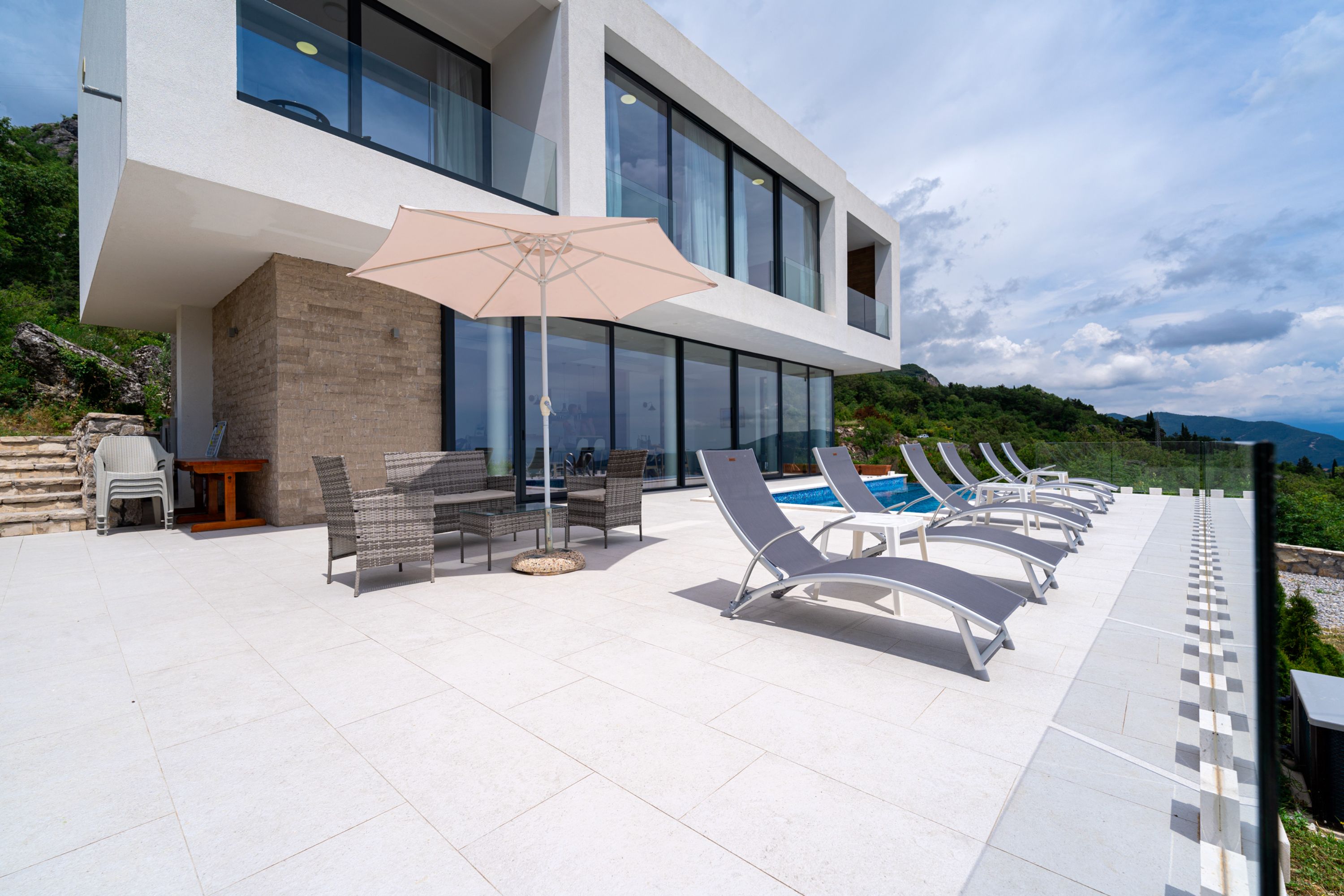 De prachtige moderne villa is omringd door een wijngaard en geniet van panoramische uitzichten over de baai van Kotor. Het bevindt zich in ongerept natuurland, slechts 10 minuten rijden van het levendige stadje Herceg Novi. De woning is op het westen gericht, wat zorgt voor prachtige zonsondergangen die vanaf het terras te zien zijn.