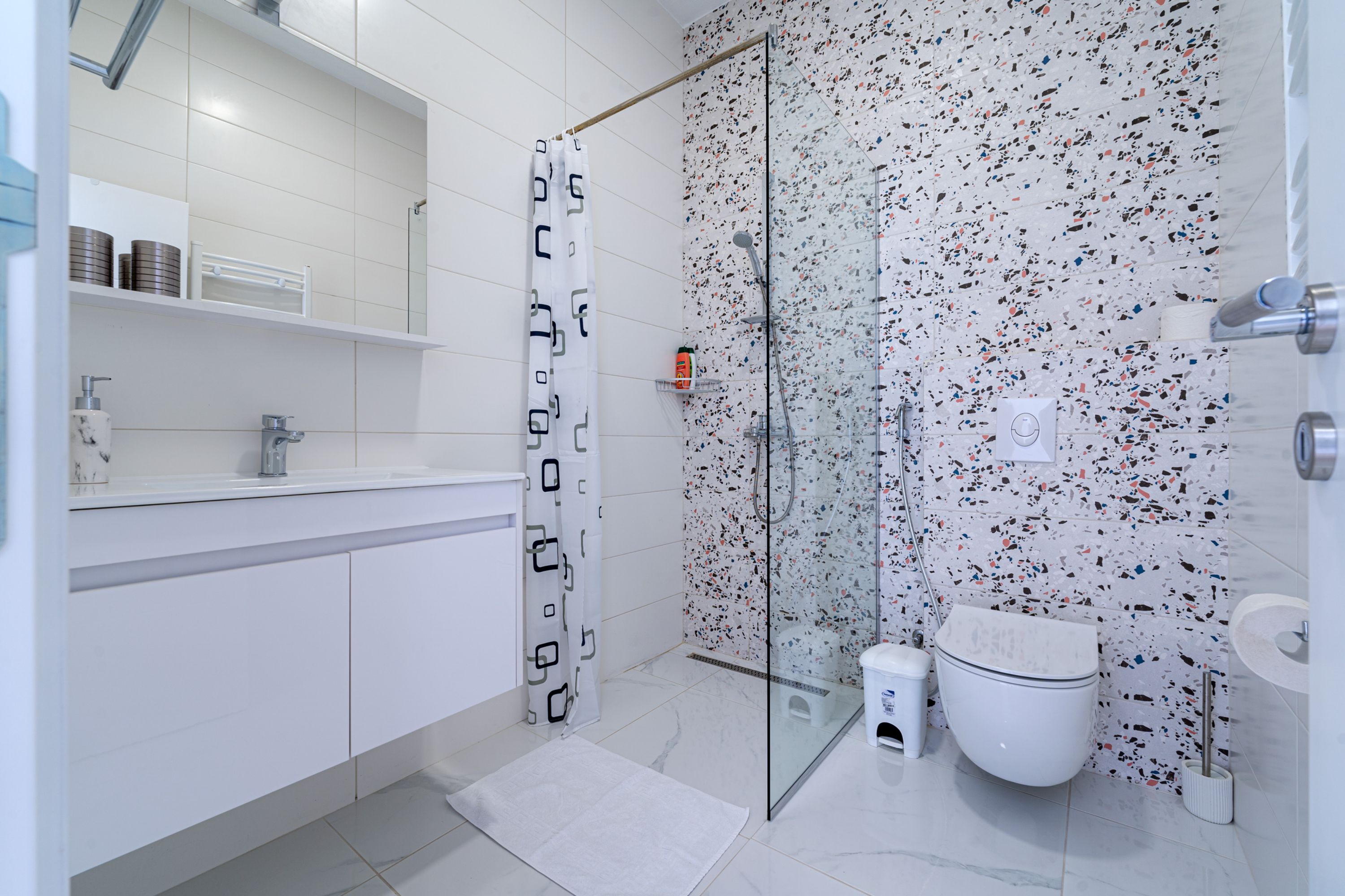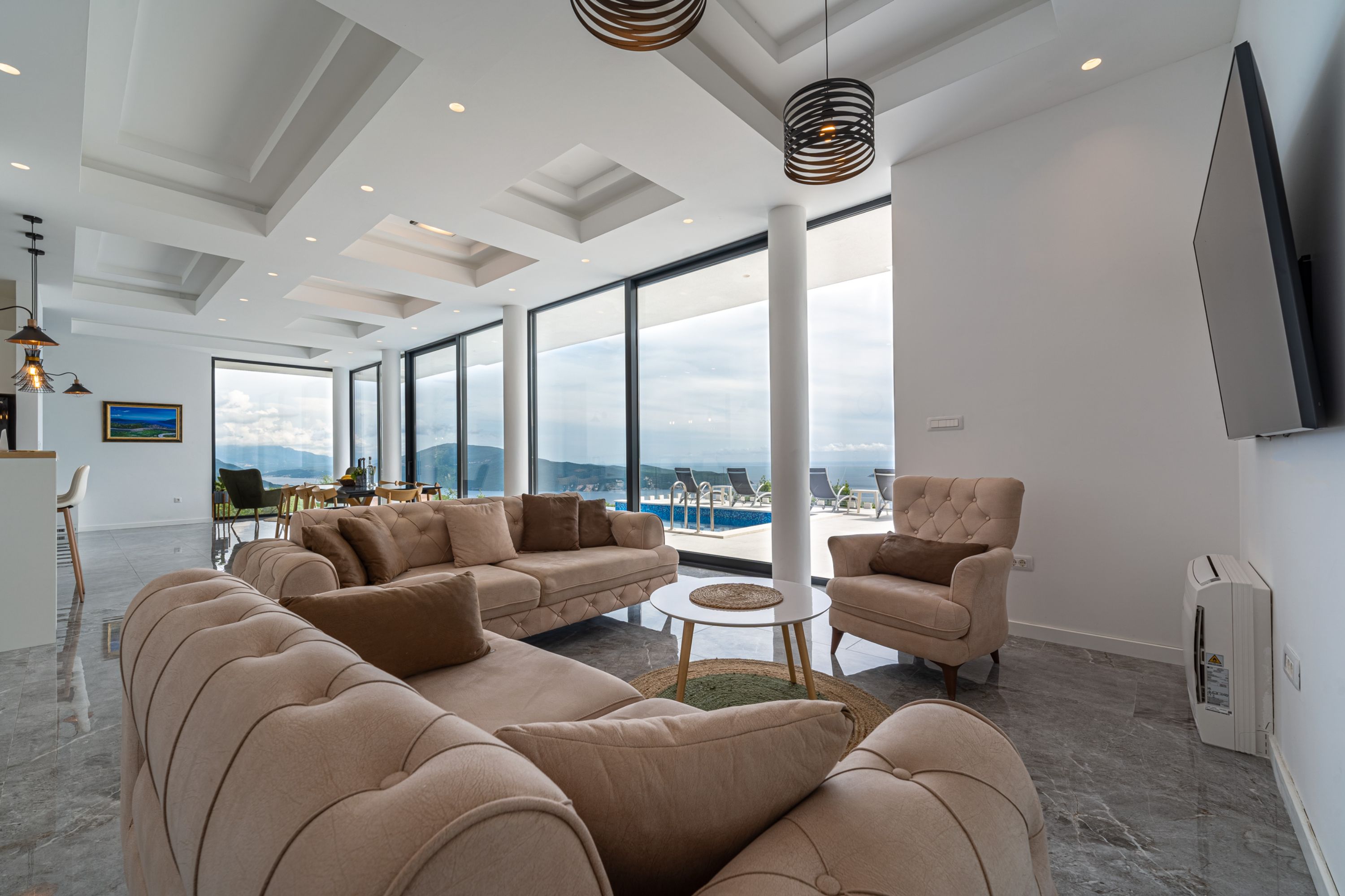 De ruime, open woonkamer op de begane grond heeft een glazen deurenwand die opent naar het terras met een infinity-zwembad. Het zitgedeelte omvat twee banken, een fauteuil en een flatscreen-tv. De stijlvolle eettafel en ontbijtbar leiden naar de onberispelijke, ingebouwde keuken, die goed uitgerust is met moderne apparaten. De villa biedt comfortabel plaats aan 8 personen in 4 slaapkamers, elk met een kingsize tweepersoonsbed, kledingkast en een eigen balkon met schitterend uitzicht op zee. Alle slaapkamers hebben een eigen badkamer.