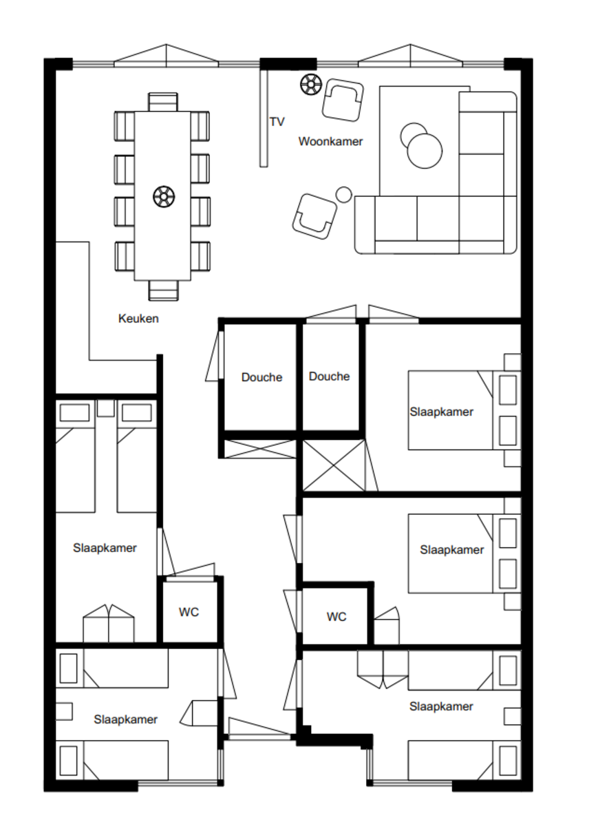 Deze volledig ingerichte geschakelde bungalow is geschikt voor maximaal 10 personen. De bungalow beschikt over een ruime woonkamer met open keuken. De woonkamer is voorzien van standaard apparatuur zoals een flat screen tv, dvd speler en radio cd speler. De open keuken is voorzien van een 4-pits gasfornuis, koelkast met vriesvak, koffiezetapparaat, combi magnetron, vaatwasser en waterkoker. Er zijn vijf slaapkamers waarvan drie slaapkamers met een tweepersoonsbed en twee slaapkamers met twee eenpersoonsbedden. 2 slaapkamers zijn voorzien van mechanische ventilatie. De bungalow is voorzien van twee badkamers met douche en er zijn twee aparte toiletten. Buiten op het terras heeft u de beschikking over tuinmeubilair inclusief parasol.