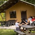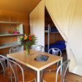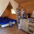 Deze gezellig ingerichte safaritenten is geschikt voor maximaal 6 personen. De tenten hebben een open keuken en een ruime zithoek. De mobiele keuken is voorzien van een 4-pits gasfornuis, een koelkast, (filter) koffiezetapparaat en een waterkoker. Er zijn twee slaapkamers waarvan één slaapkamer met een tweepersoons bed en één slaapkamer met twee stapelbedden.
