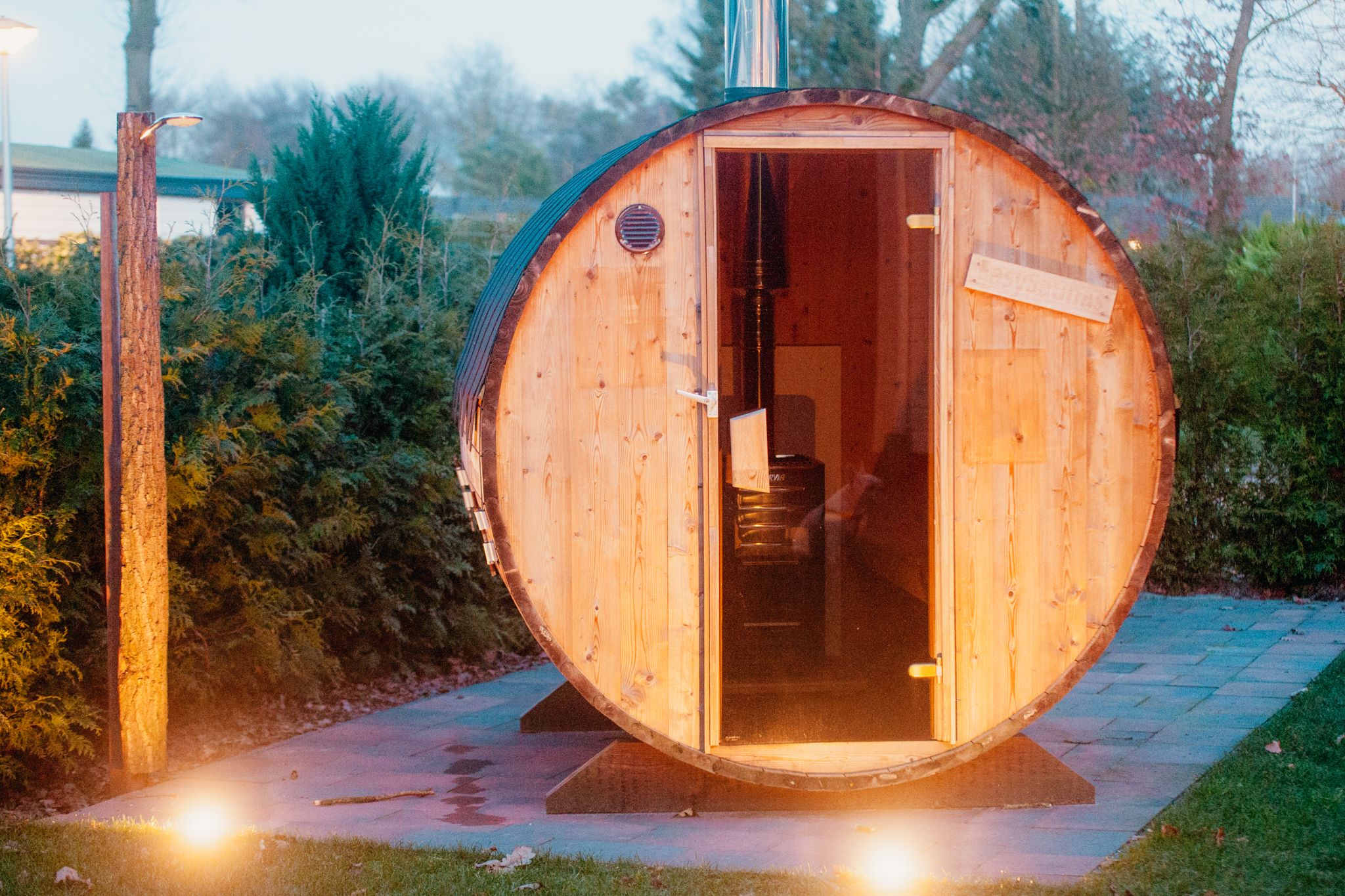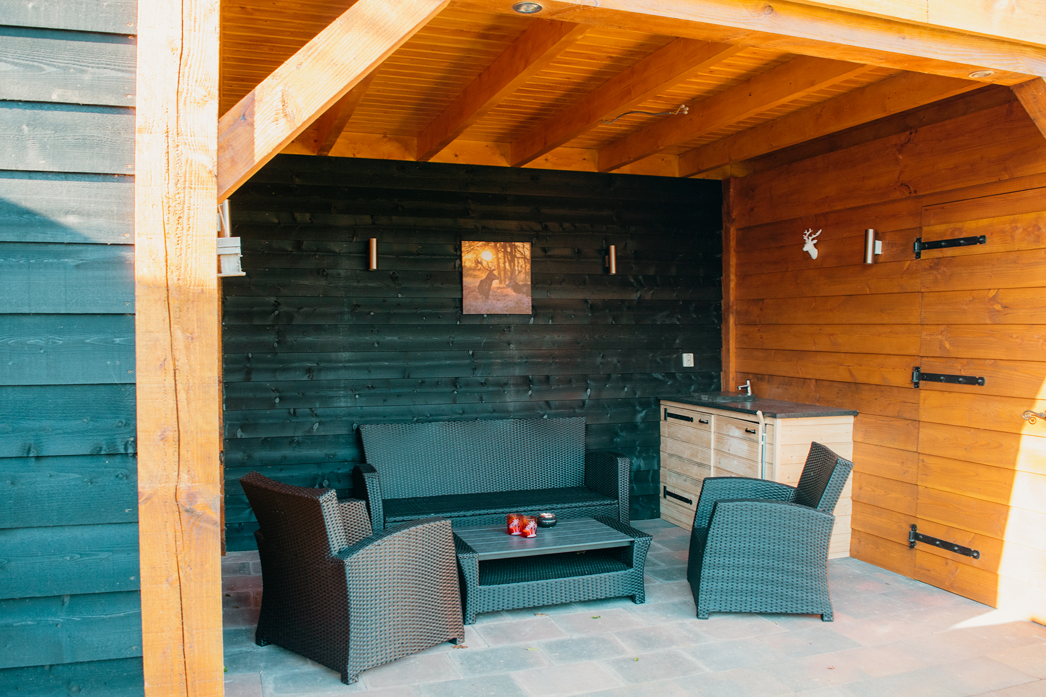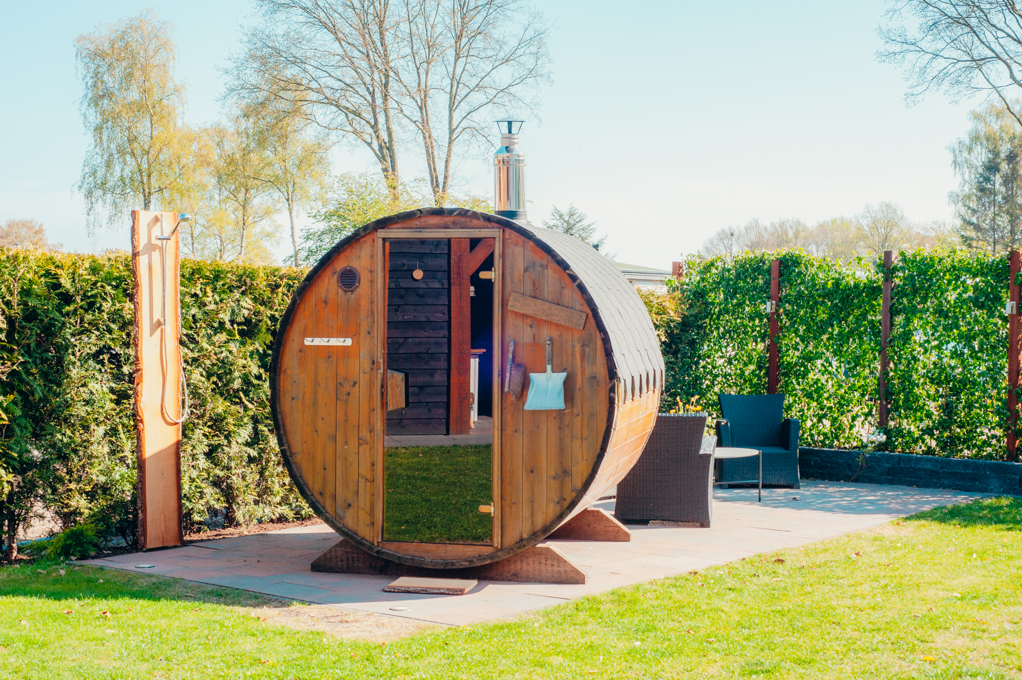 Buiten vindt u een overdekte veranda met een luxe loungeset, perfect om buiten te ontspannen. Een van de hoogtepunten is de houtgestookte barrelsauna, die een serene oase biedt. Na een sessie in de sauna kunt u zich verfrissen onder de buitendouche, die behalve in de wintermaanden (gesloten van november tot februari vanwege vorst) beschikbaar is.