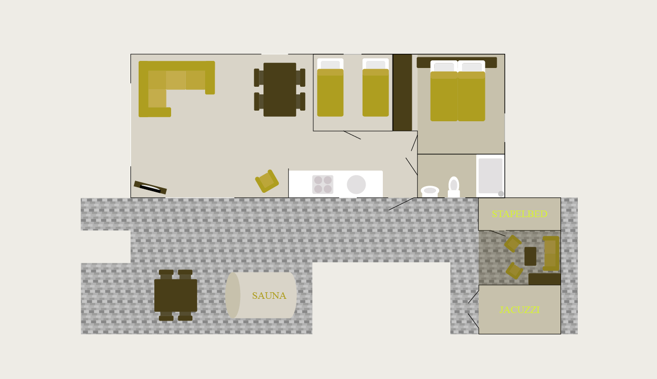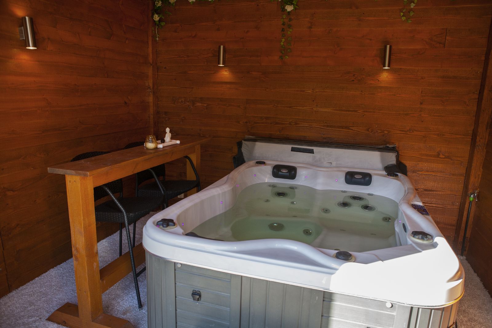 Het chalet heeft drie slaapkamers: één met een tweepersoonsbed, één met twee eenpersoonsbedden en een knus bijgebouw met een stapelbed. Het bijgebouw herbergt ook de luxe jacuzzi, waardoor een privéruimte ontstaat om te ontspannen. De badkamer is voorzien van een ruime douche, wastafel en toilet.