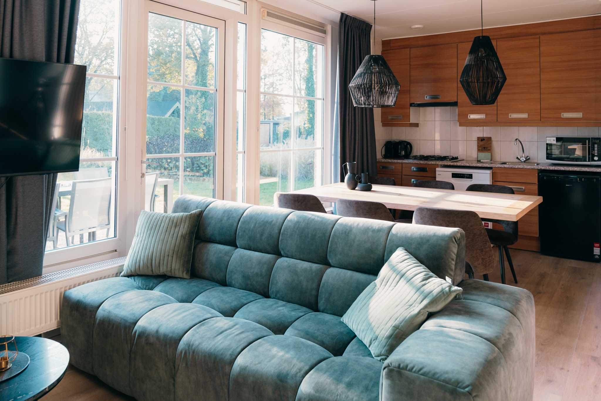 Stap naar buiten naar een ruime privétuin met een overdekt terras, waar je kunt samenkomen voor een drankje of maaltijd in de frisse lucht. De bungalow ligt aan een rustig, autovrij pad, wat bijdraagt aan de rustige sfeer van je verblijf.
