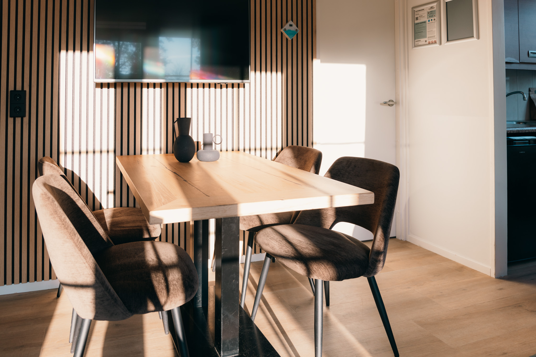 Binnen vind je vijf slaapkamers met in totaal 10 eenpersoons boxspringbedden, twee moderne badkamers, een apart toilet en twee volledig uitgeruste keukens, elk met vaatwasser en koelkast met vriesvak. De woning beschikt ook over twee eethoeken en twee gezellige woonkamers, beide met tv – ideaal om samen te ontspannen of te genieten van wat rustige tijd.