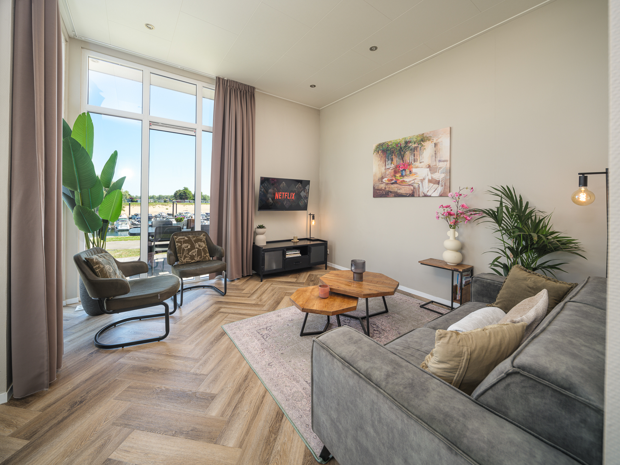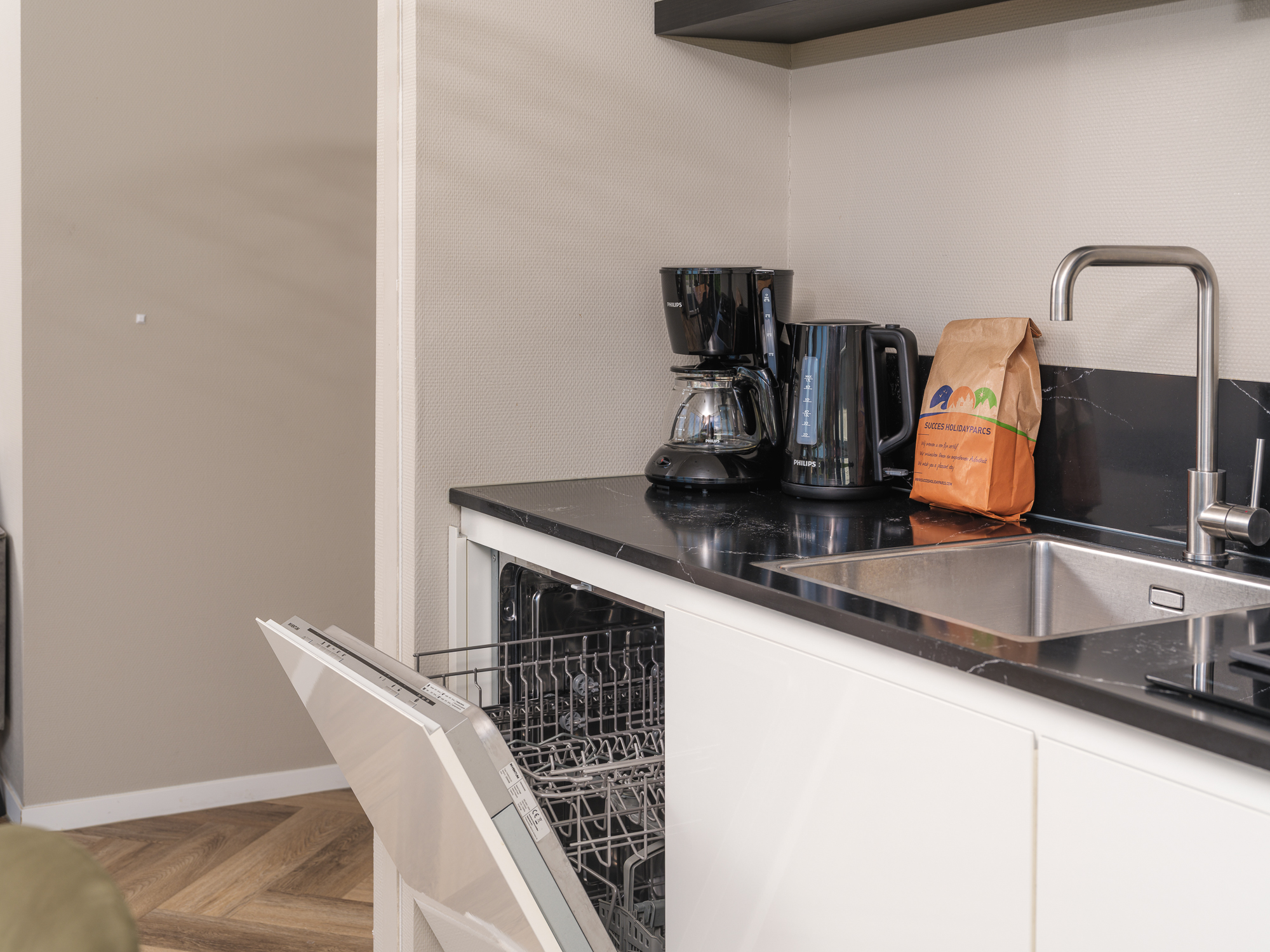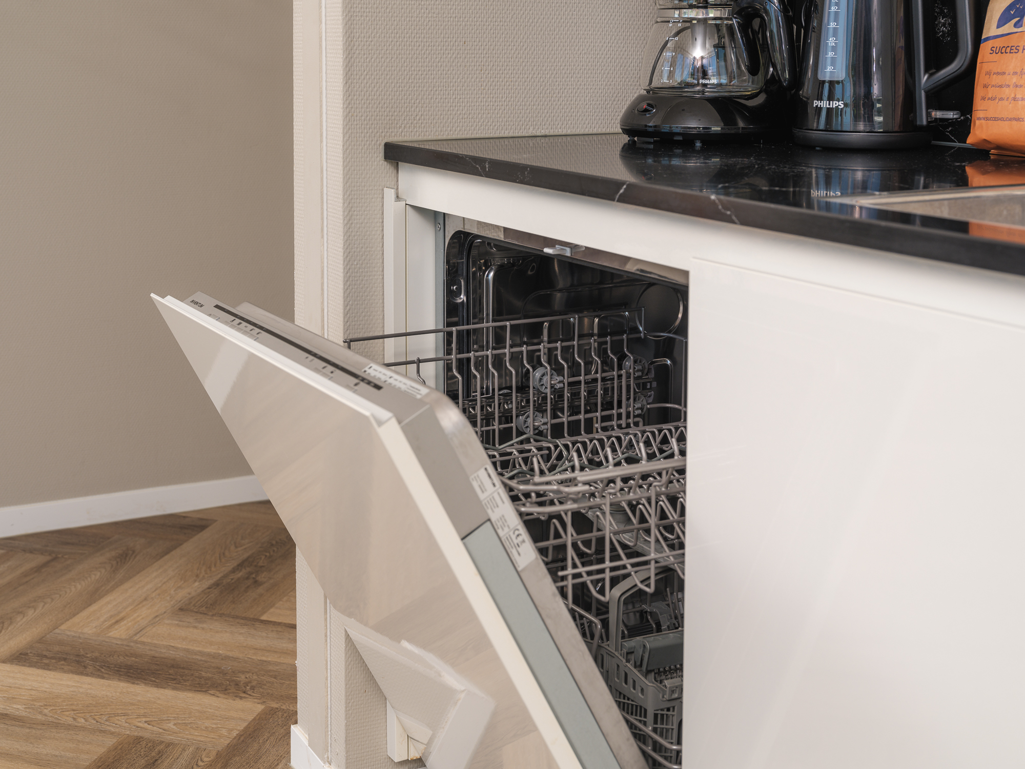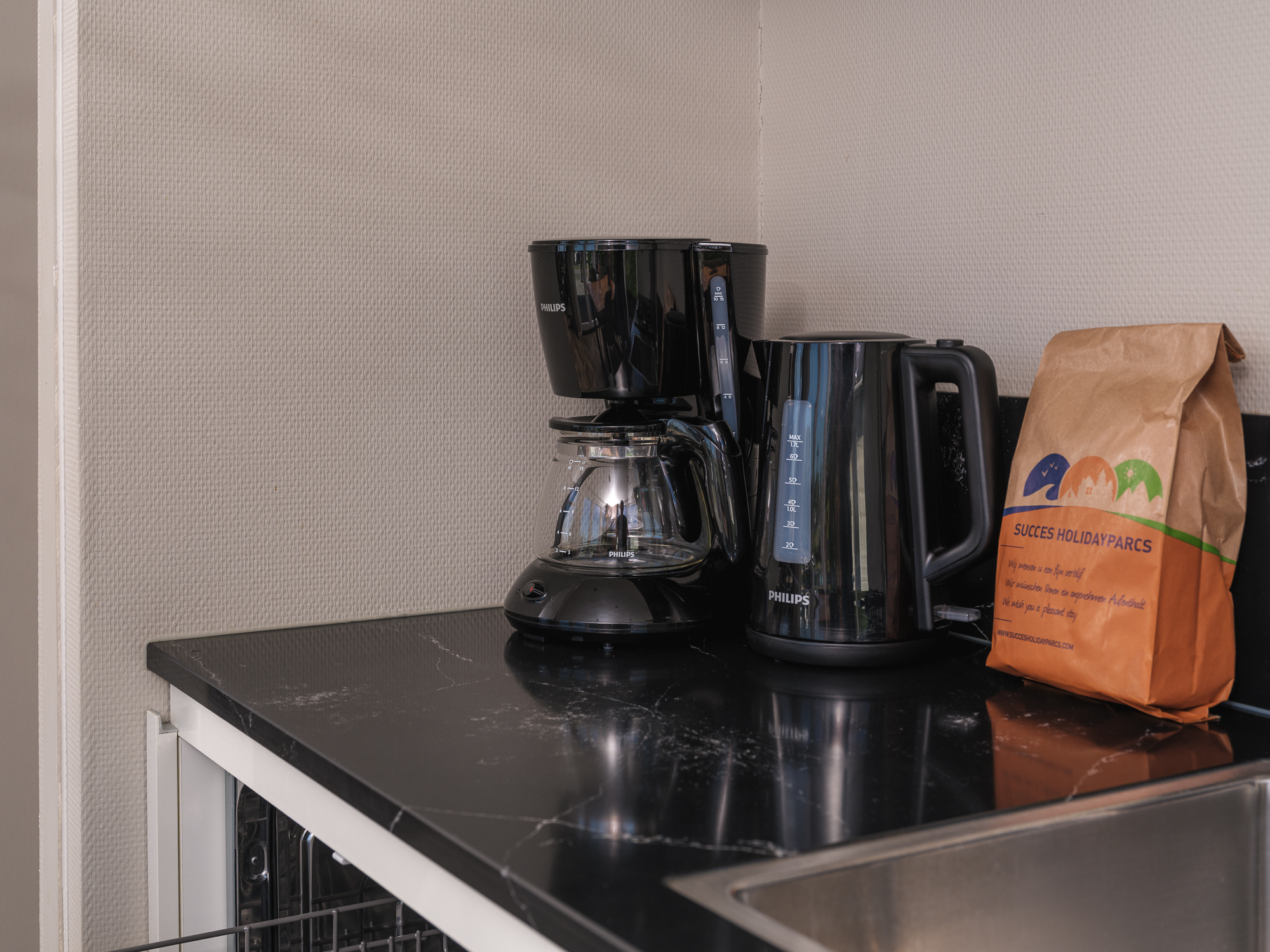 Het interieur beschikt over een stijlvolle woonkamer met vloerverwarming, een flatscreen-tv en een sfeervolle open haard die een warme ambiance creëert. De volledig uitgeruste keuken bevat alles wat u nodig heeft om gemakkelijk maaltijden te bereiden: een kookplaat, koelkast met vriesvak, vaatwasser, combimagnetron, filterkoffiezetapparaat, waterkoker en complete sets keukengerei, serviesgoed en glaswerk. De gezellige eethoek is perfect voor gezamenlijke maaltijden en gesprekken.