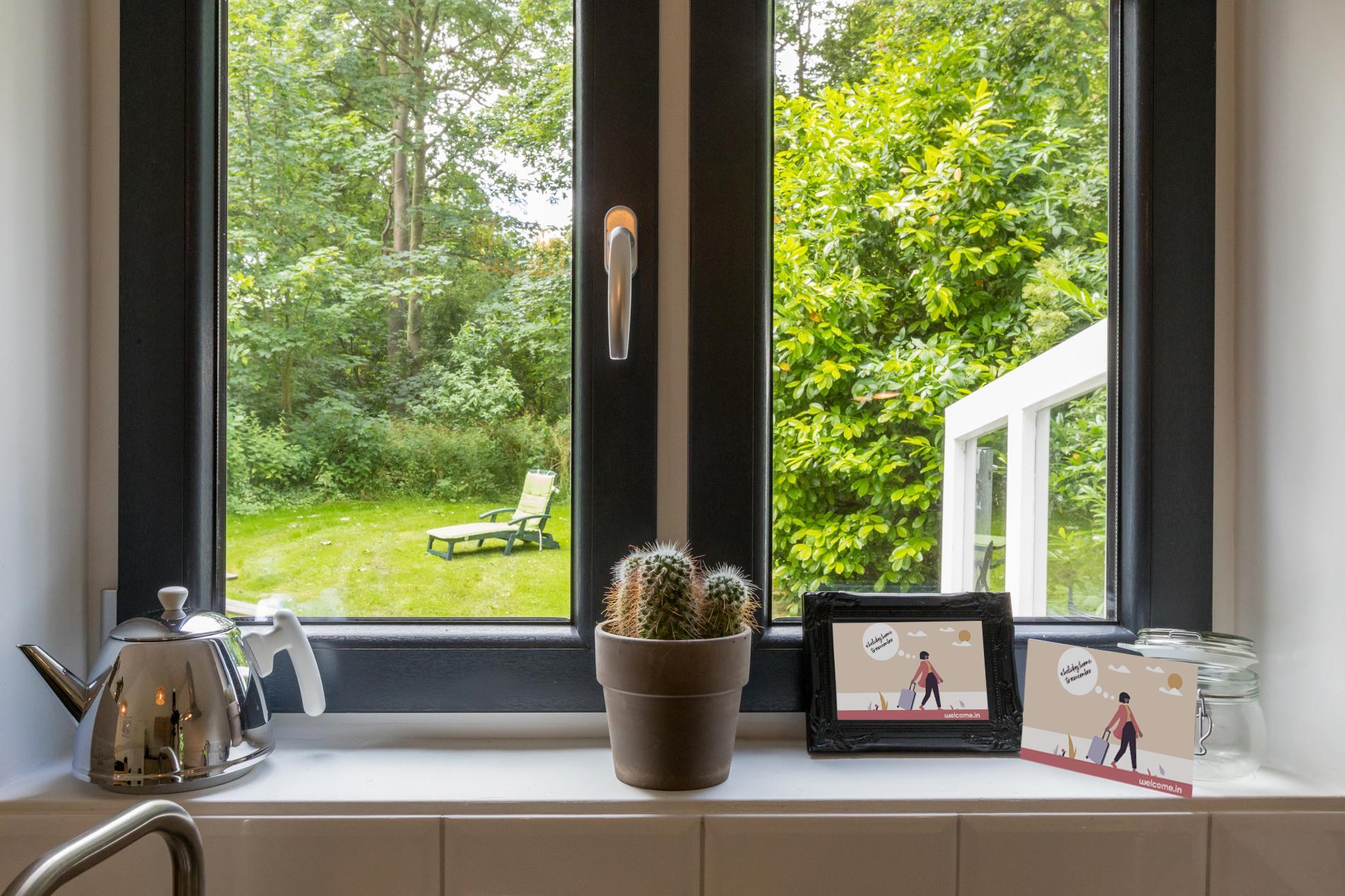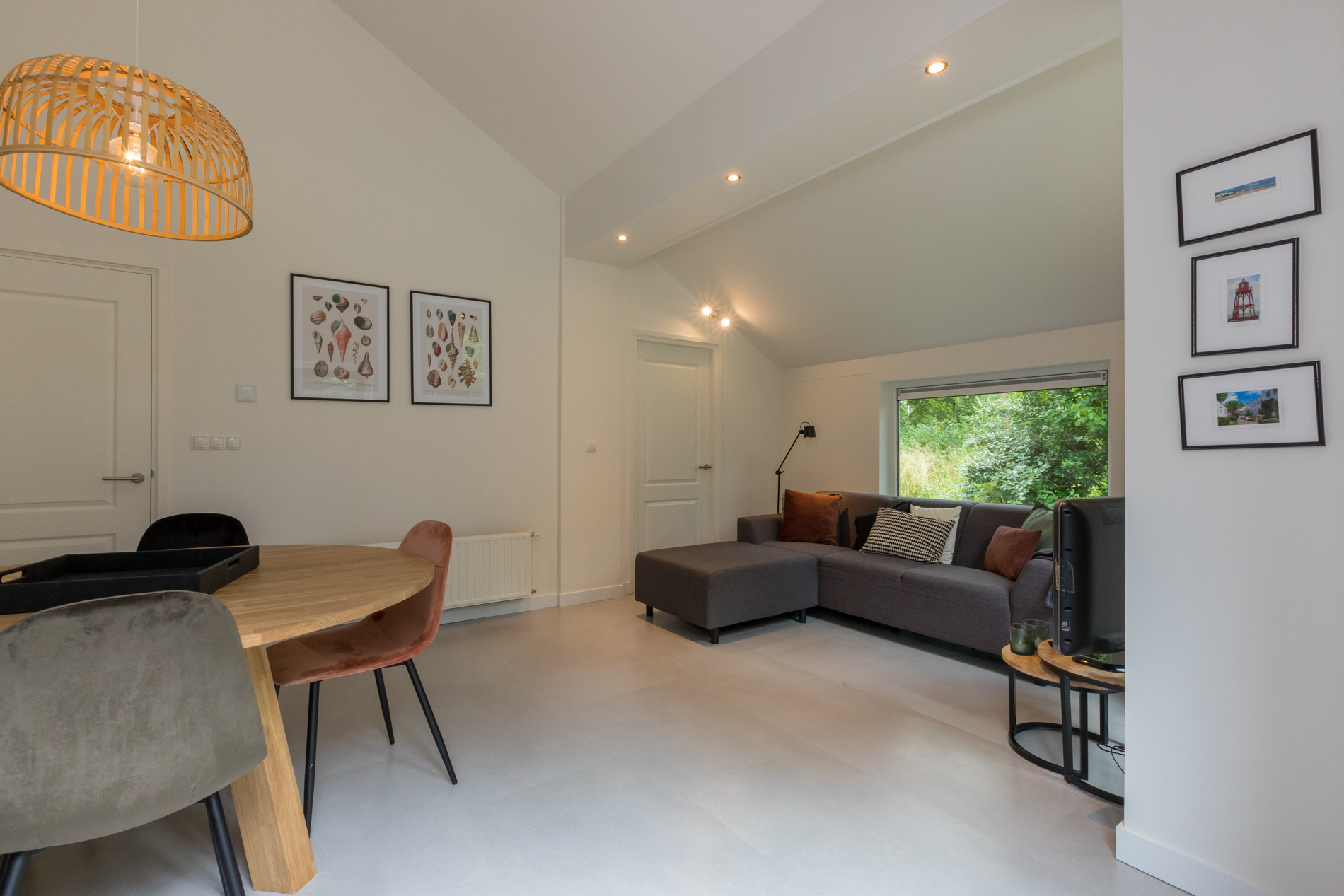 Alle vertrekken van deze moderne accommodatie bevinden zich op de begane grond en zijn daardoor gemakkelijk toegankelijk. Het woongedeelte van het vakantiehuis heeft een gezellige open zithoek met hoekbank en smart televisie. Tijdens het verblijf in de woning kan er gebruik worden gemaakt van de wifi. De grote ronde eettafel staat centraal in de ruimte waardoor de zithoek en de open keuken met elkaar verbonden worden. In de keuken bevinden zich een oven, toaster, vaatwasser, koelkast met een vriesvakje en zowel een filterkoffie machine als een Nespresso koffiezetapparaat.