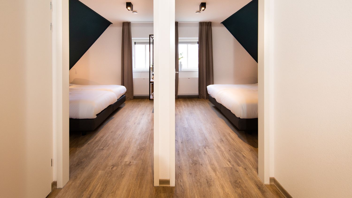 Op de eerste verdieping bevinden zich vier slaapkamers met twee eenpersoons box springs elk. Verder zijn er op de eerste verdieping twee luxe badkamers aanwezig waarvan één met wastafel en inloopdouche en één met wastafel en ligbad. Boven aan de trap bevindt zich een veiligheidshekje voor kinderen.