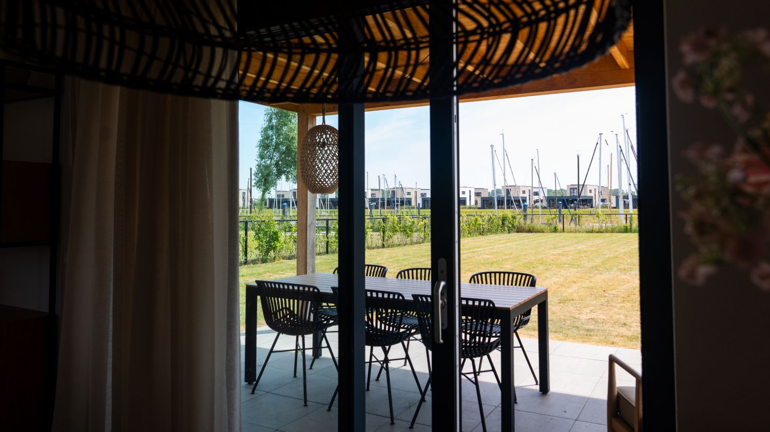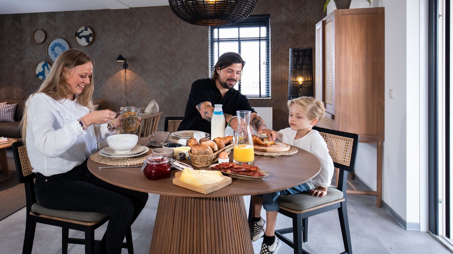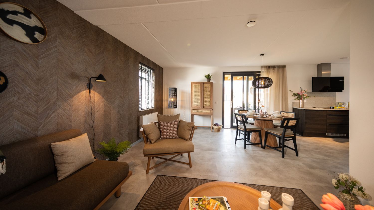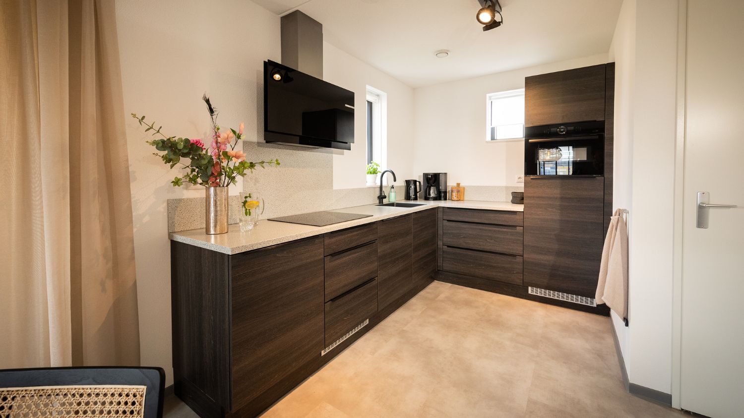 Deze vrijstaande vakantievilla van circa 100 m2 beschikt over een ruime en lichte woonkamer met een zit- en eethoek en televisie met Chromecast. De luxe open keuken is voorzien van een koelkast met vriesvak, een 4-pits inductie kookplaat, een filter- en capsule koffiemachine, een waterkoker, een vaatwasser en een combi-oven met magnetron.